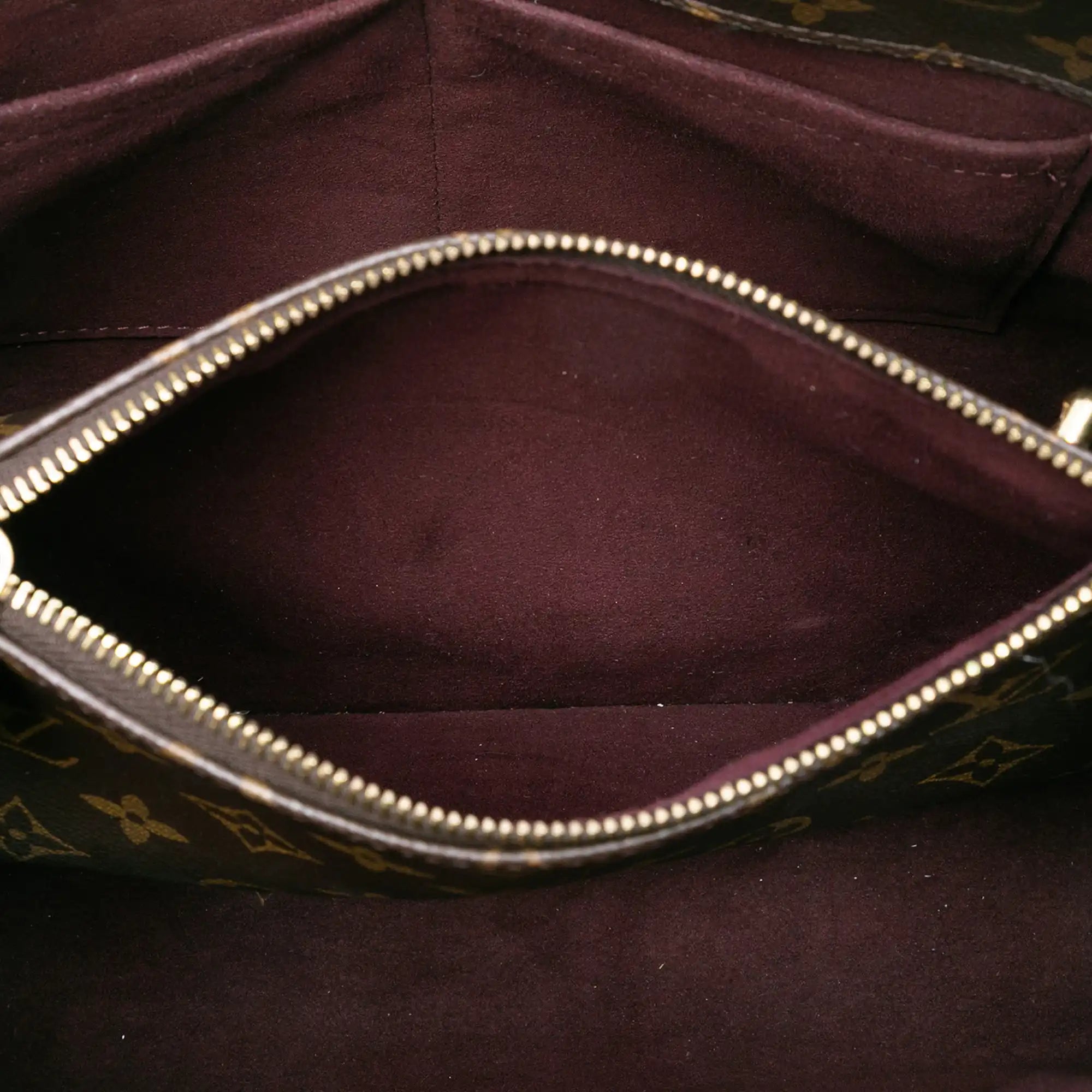 The Louis Vuitton Montaigne handbag was named after a magnificent shopping street in Paris. Slightly sunken sides and a narrower top give the Bag a confident elegance. The interior is lined with burgundy microfiber lining and is extremely diverse. It has a middle zippered compartment, a larger open compartment and 2 smaller open compartments. The Bag is equipped with two top handles and a removable shoulder strap, offering a variety of stylish carrying options and is perfect for everyday use.