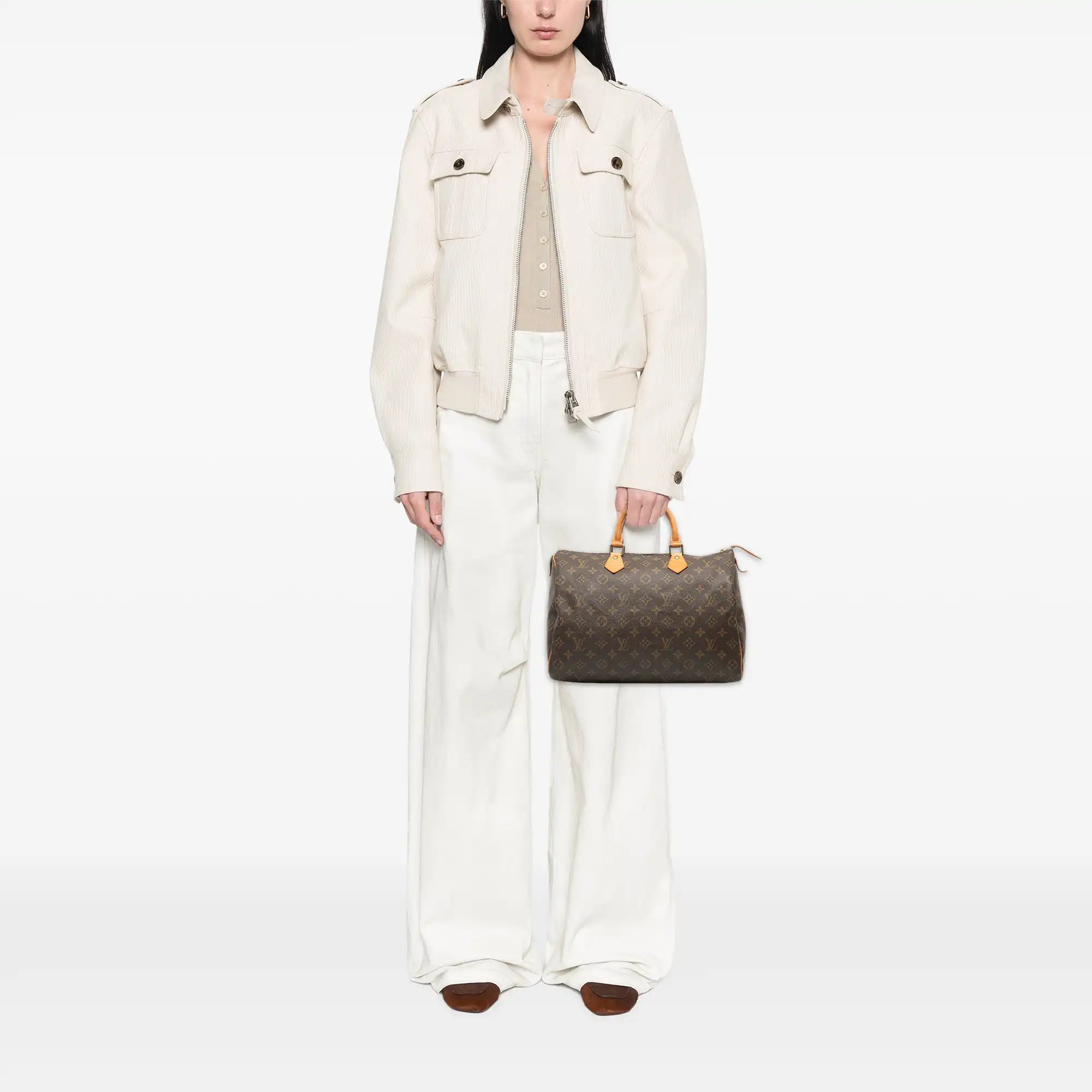The Louis Vuitton Speedy 35 from classic Monogram Canvas is an iconic handbag that combines timeless elegance with functionality. With its spacious interior and light design, it is the perfect companion for everyday life. The Bag has noble leather details, gold -colored fittings and a practical zipper. Whether casual or chic combined - the Speedy 35 gives every outfit a touch of luxury.