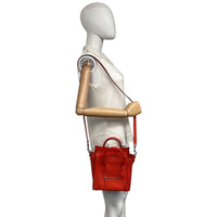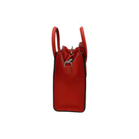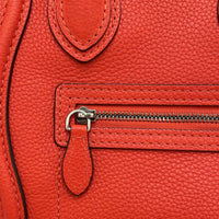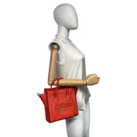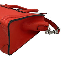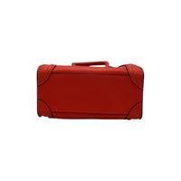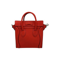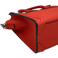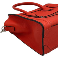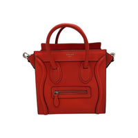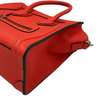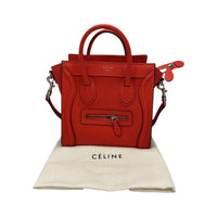 This Celine Luggage in size Nano is made of red leather. The Bag has gold details, a zippered compartment on the front, rolled leather handles, a detachable leather shoulder strap, a zipper at the top opening and zippered and slip pockets on the inside. The Bag Can be worn in the hand and on the arm or loosely over the shoulder and across the body.