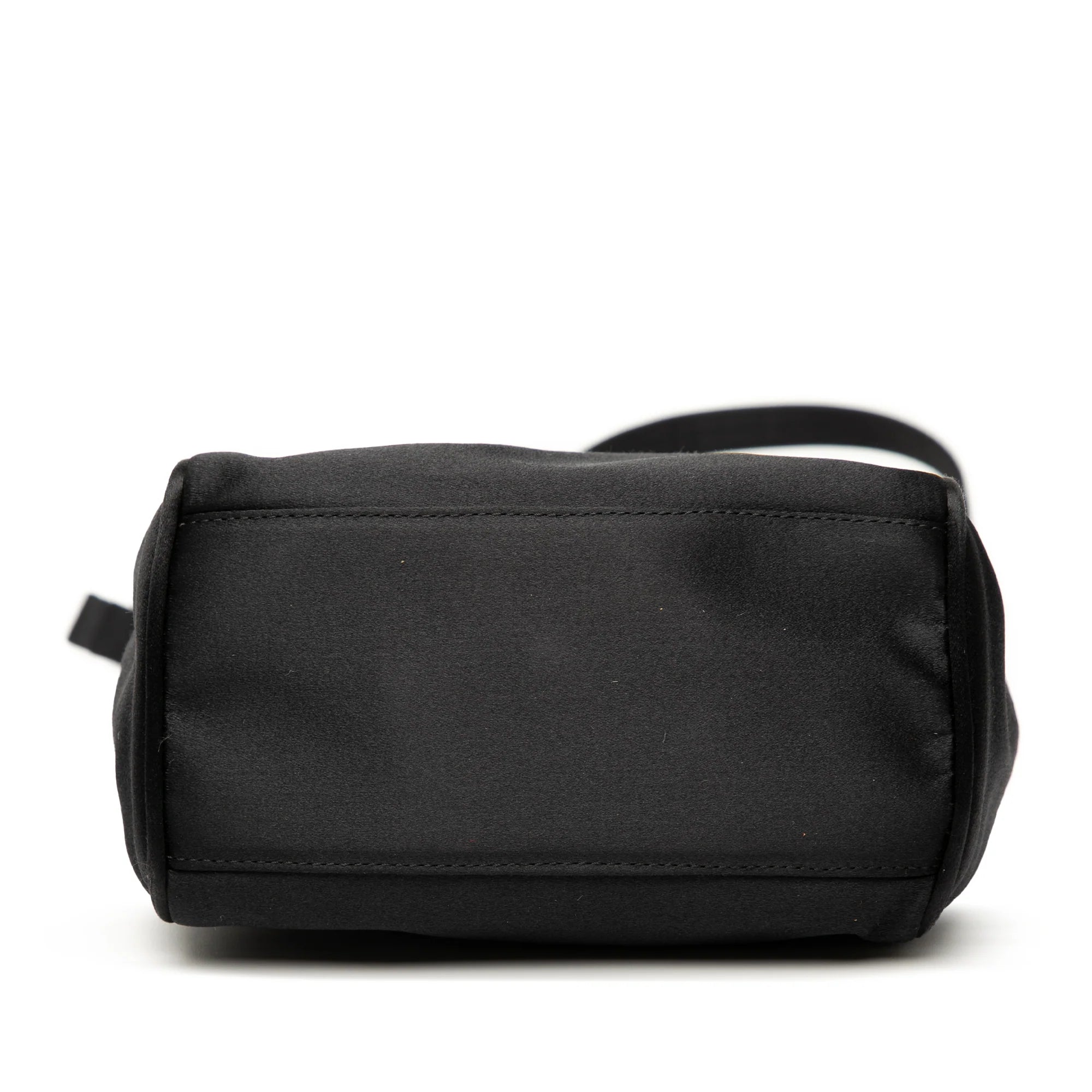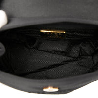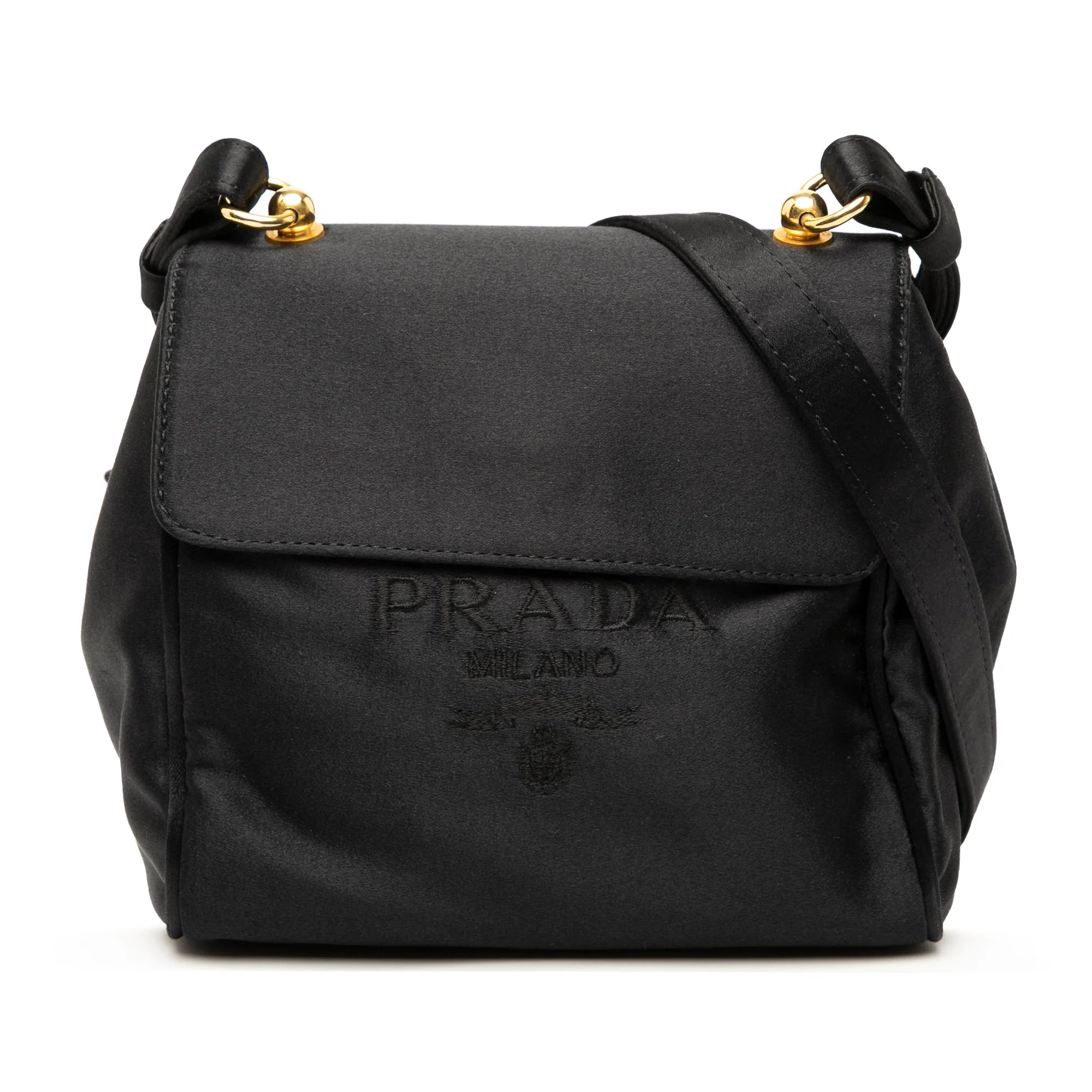This Prada Raso Logo Crossbody Bag is presented in black satin and impresses with its timeless, feminine appearance. The smooth satin gives the Bag an elegant lightness and makes it a stylish companion for day and evening. The adjustable shoulder strap with fine ribbon details ensures it is comfortable to wear and underlines the characteristic Prada look. The front flap with magnetic closure offers safe and easy access to the interior. Inside there is a zippered compartment that offers space for smaller essentials. The hardware, the magnetic closure and the zipper are in silver and harmoniously round off the design.