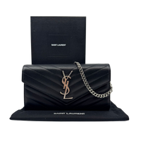 The classic wallet-on-chain format offers a well thought-out interior layout with plenty of space for cards, smartphones and essentials. The detachable chain strap allows for versatile use - as a shoulder bag, clutch or elegant evening bag. The compact shape and clean lines emphasize the characteristic Saint Laurent style.