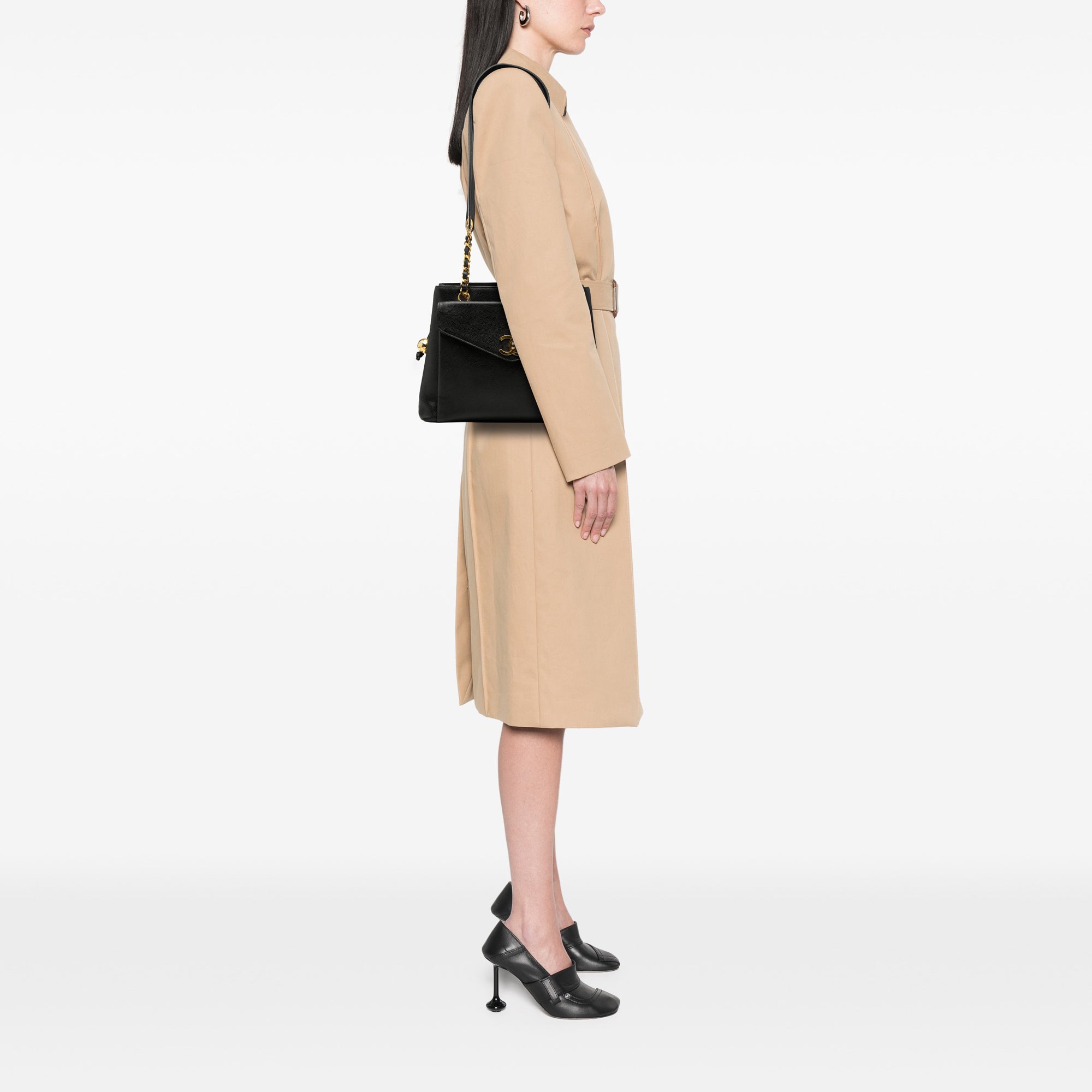 Die Chanel CC Caviar Front Pocket Chain Tote verbindet klare Linien mit ikonischen Maison-Codes. Das Modell ist aus genarbtem Caviar-Leder gefertigt, das für seine strukturierte Oberfläche und elegante Ausstrahlung bekannt ist. Charakteristisch sind die goldfarbenen, lederdurchflochtenen Kettenglieder in Kombination mit einem flachen Lederteil, die ein angenehmes Tragen über der Schulter ermöglichen und dem Design eine dezente Schmuckwirkung verleihen.