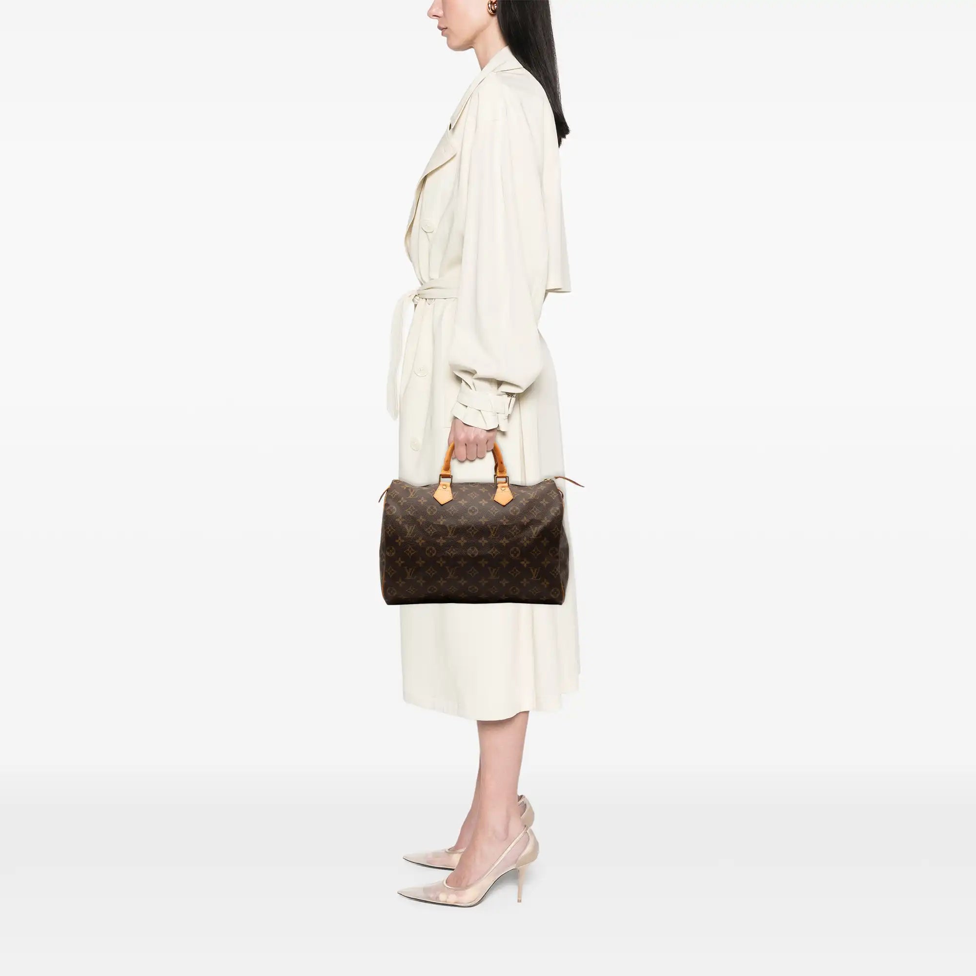 The Louis Vuitton Speedy 35 in classic Monogram canvas is an iconic handbag that combines timeless elegance with functionality. With its spacious interior and lightweight design, it is the perfect companion for everyday life. The Bag has elegant leather details, gold-colored fittings and a practical zipper. Whether casual or chic - the Speedy 35 gives every outfit a touch of luxury.