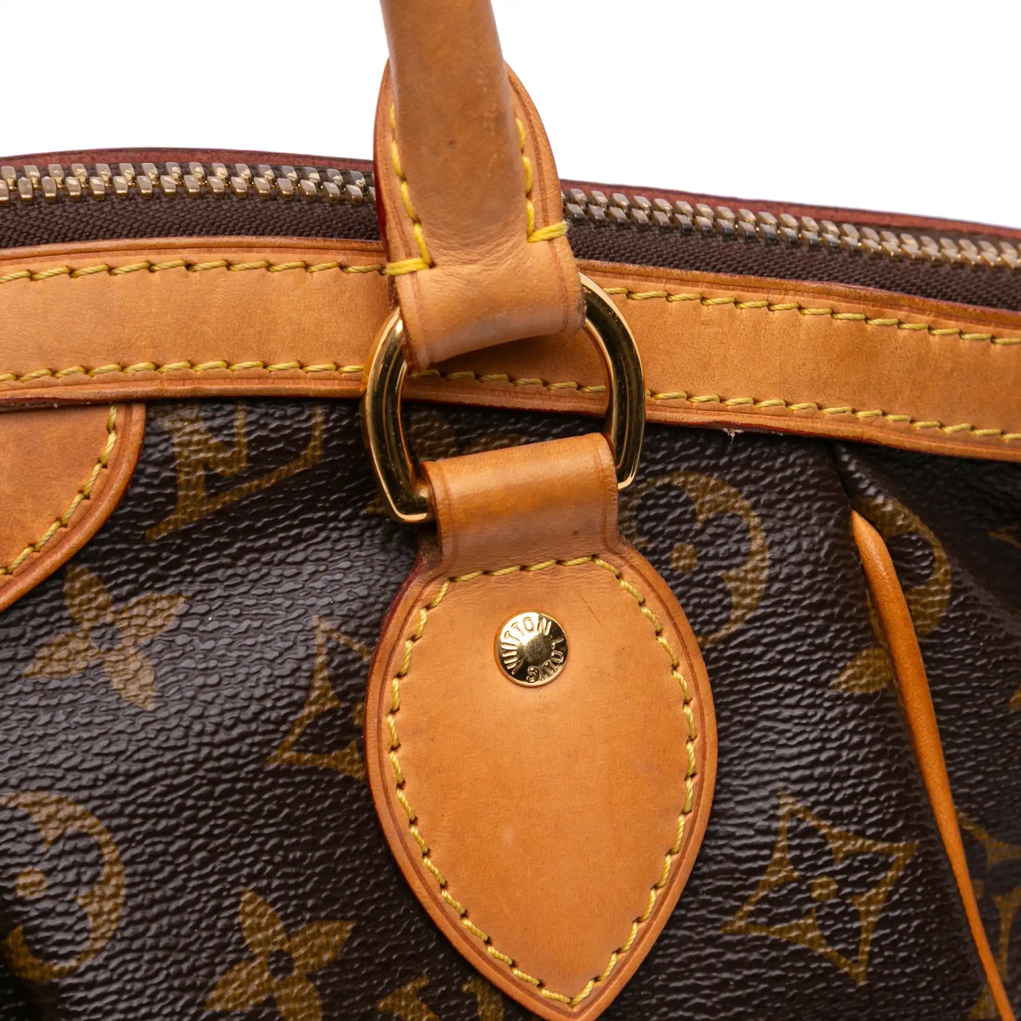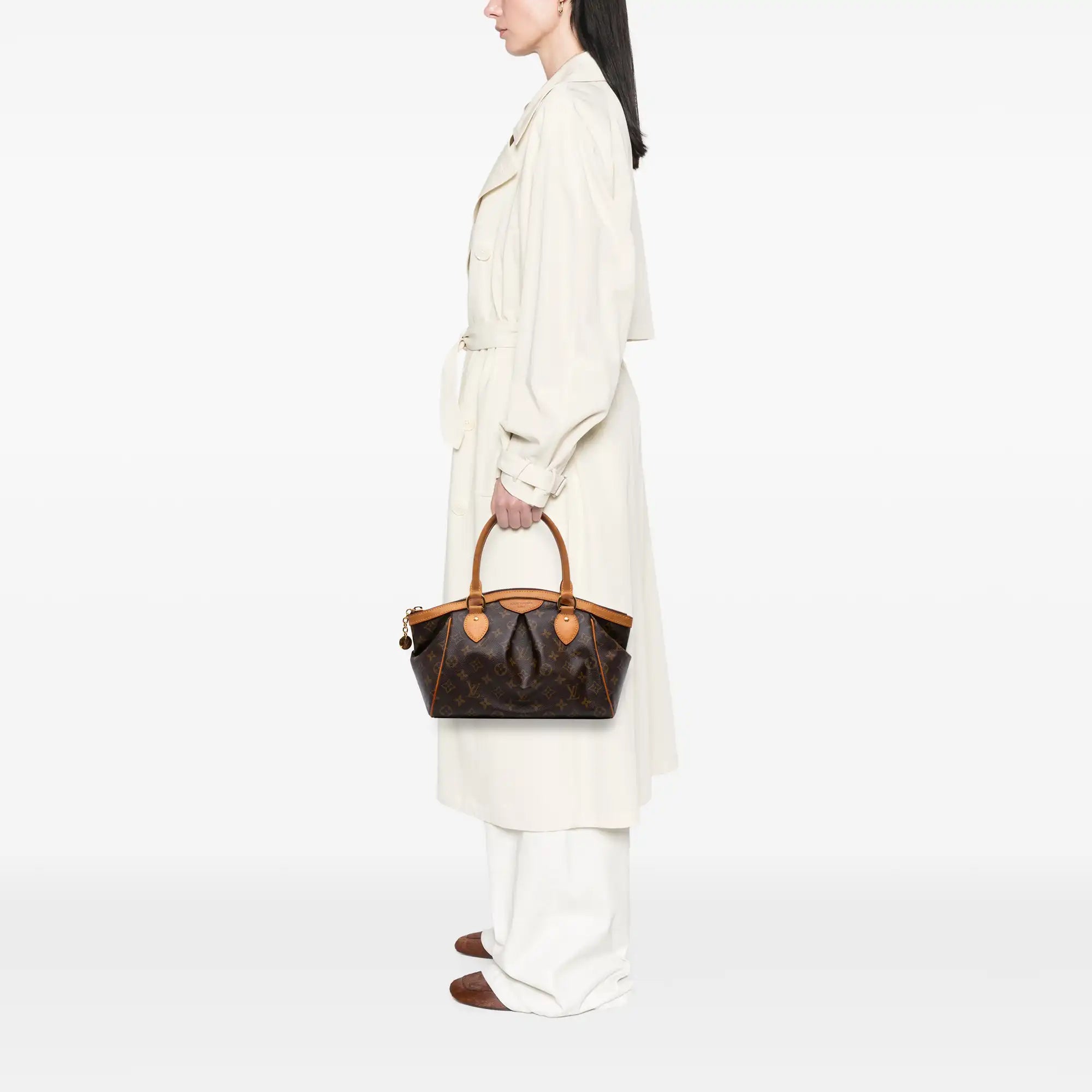 This Louis Vuitton Tivoli PM is made from Monogram canvas. The Bag Features trimmings and rolled handles made of Vachetta leather, gold details, a zipper on the top and slip pockets on the interior. The Bag is carried in the hand.
