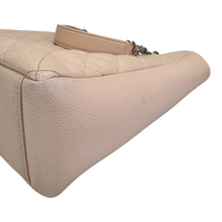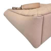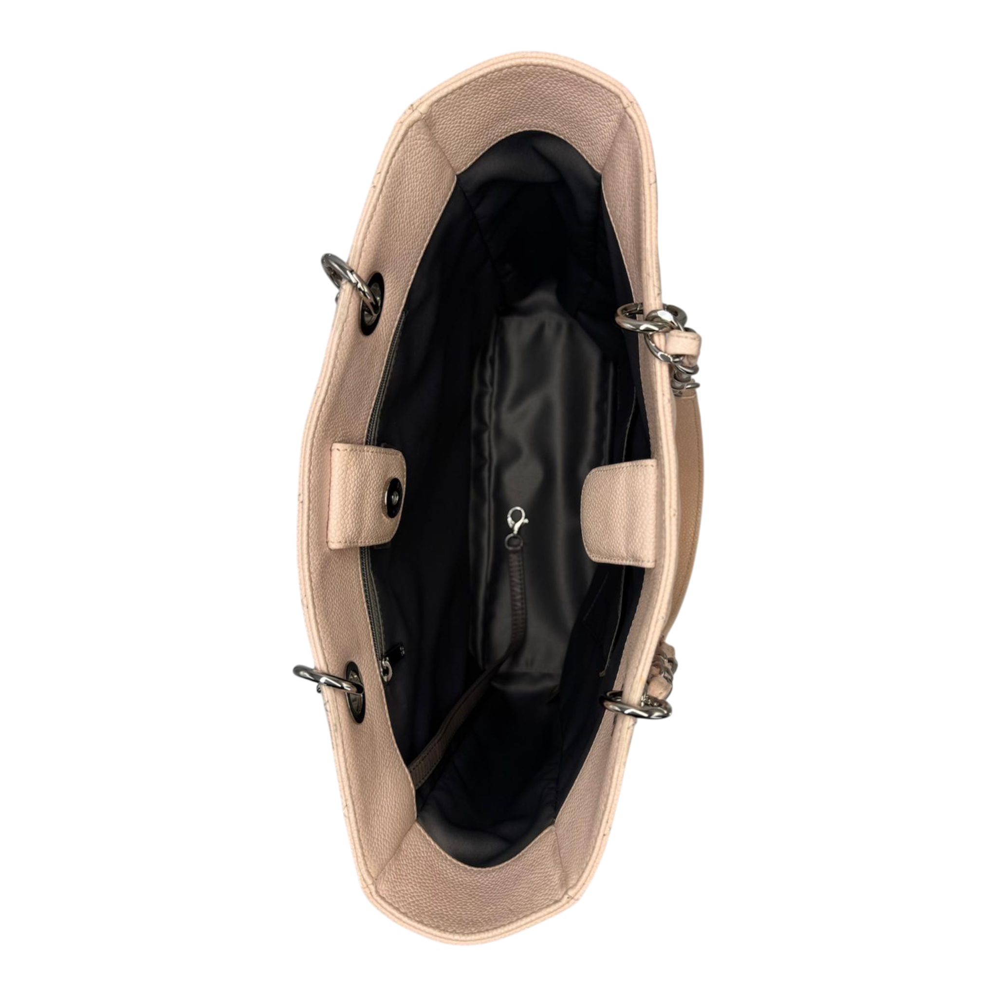 The Chanel Grand Shopping Tote in Caviar Leather is a classic, which unfortunately has not been manufactured since 2015. The beautiful pink of the robust Caviar The leather is wonderfully complemented by the silver shine of the hardware. There is a practical open compartment on the back. The interior is very versatile with two compartments which are separated by a zipper compartment in the middle. There is another zippered compartment on one side and an open pocket on the other.