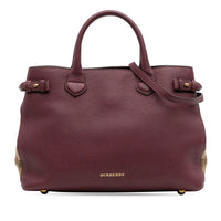 The elegant and shapely Burberry Banner is made from burgundy textured leather and features gold details. At the top opening the Bag secured with a magnetic clasp. It has on the sides Bag Inserts made of brown house check canvas. In the interior it has Bag a zip compartment and slip pockets. The Bag has rolled leather handles and is carried in the hand. Alternatively, it has Bag a removable leather shoulder strap.