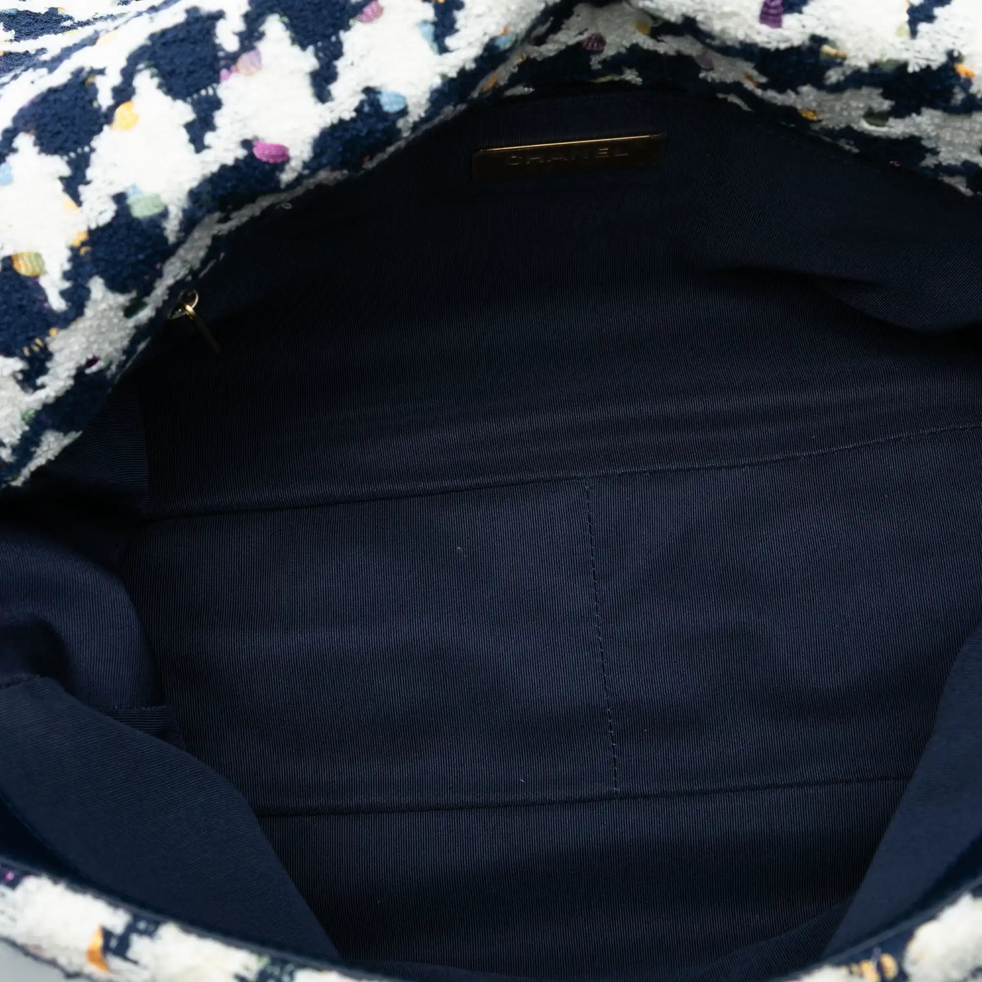 The Bag 19 by Chanel is a homage to the previous models 2.55 and Classic Flap from the 50s and the last great design by the late Karl Lagerfeld. This tweed version features a softer shape, a chunkier mixed metal shoulder strap and a top handle. Look closely to see the thoughtful details, like the stripes of logo-printed webbing woven into the houndstooth pattern and the interlocking CC buckle, intricately woven with leather to mimic the signature chain-link straps.