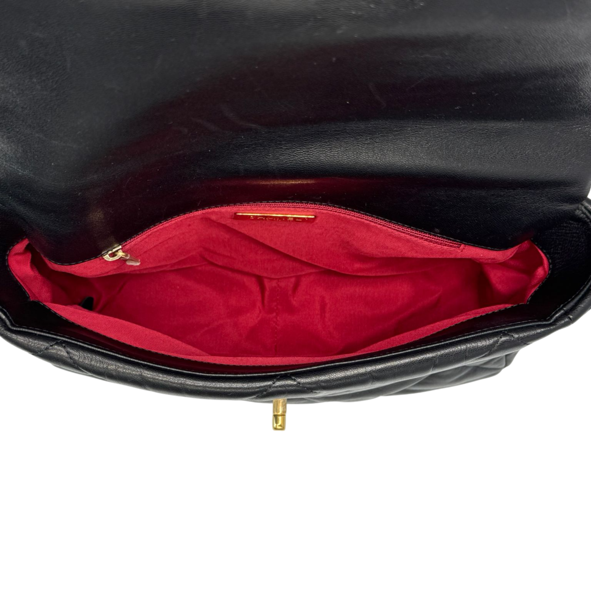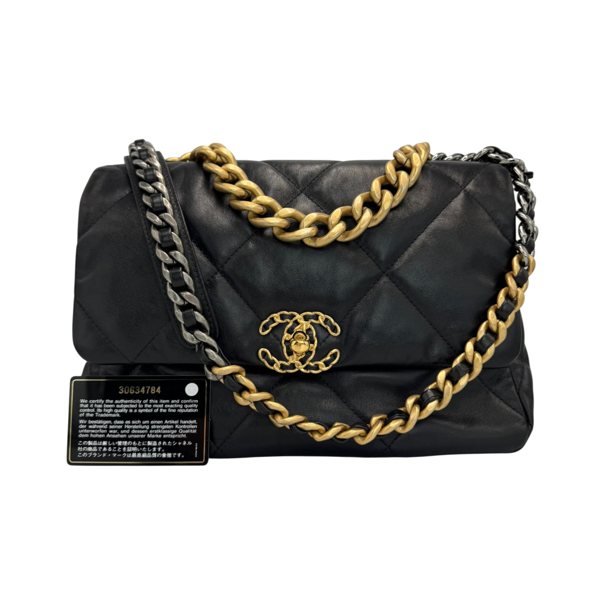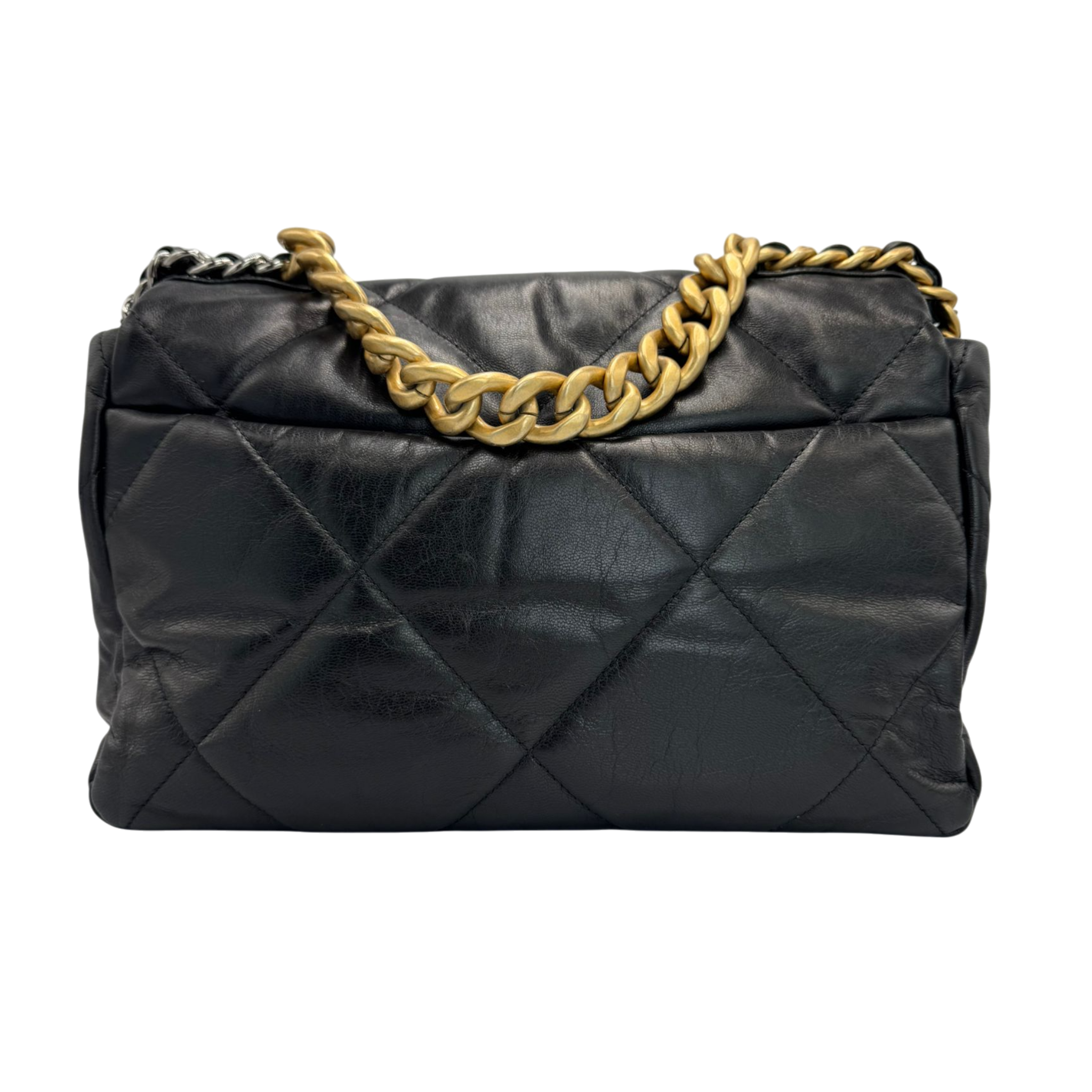 The Chanel 19 Large Flap Bag is a modern icon of the House of Chanel and combines contemporary design with classic elegance. Made from soft black lambskin, it impresses Bag thanks to its characteristic oversize quilted pattern and the striking CC clasp in a chain design. The combination of gold, silver and ruthenium hardware gives the model its distinctive look.