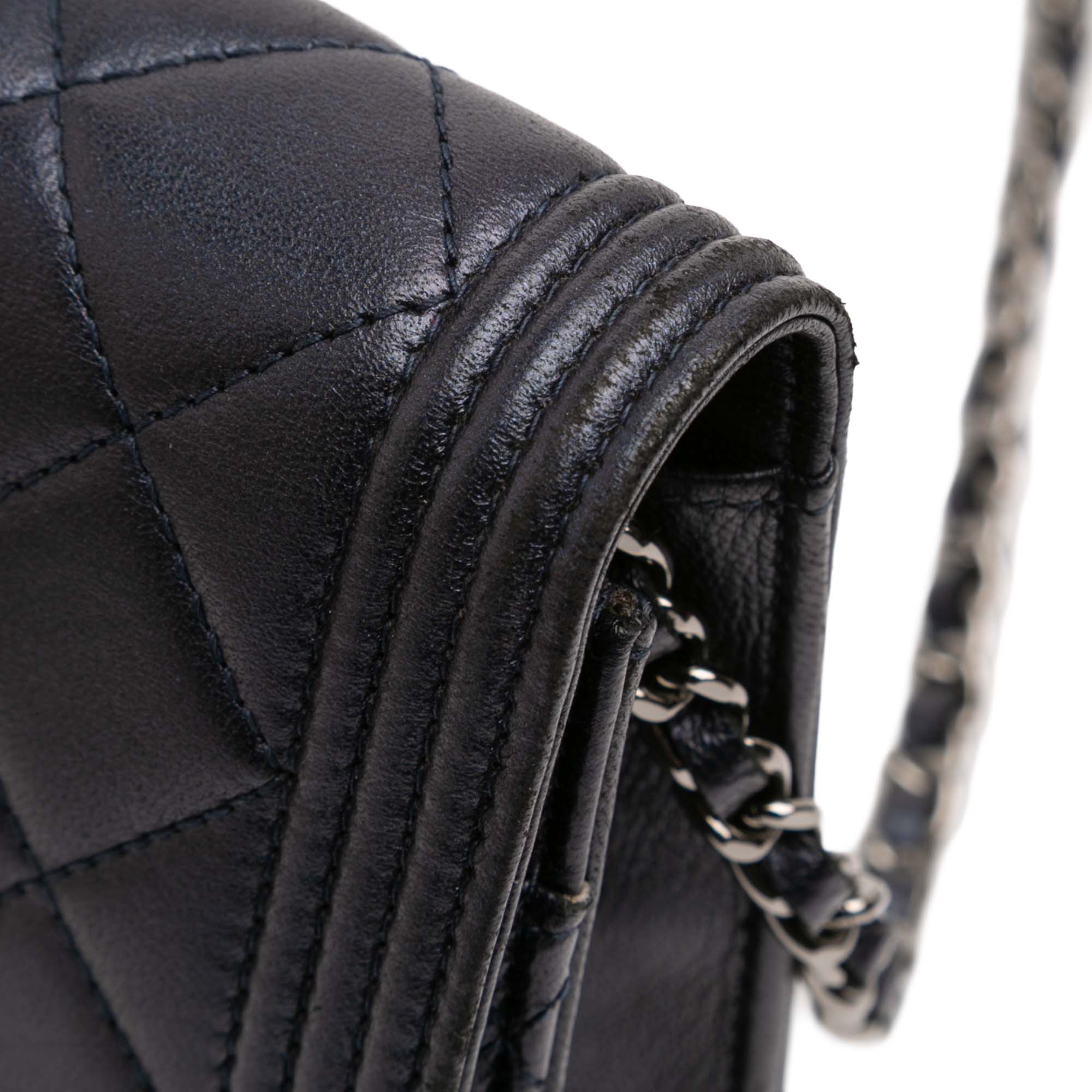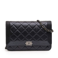 The Chanel Quilted Lambskin Boy Wallet On Chain combines the distinctive Boy line with the functionality of a compact wallet. Its defining features include quilted lambskin with a fine, soft texture and clean, angular proportions. The front flap with a snap closure ensures a clean silhouette, while the metal chain strap construction with a leather pull tab adds the signature Chanel touch.