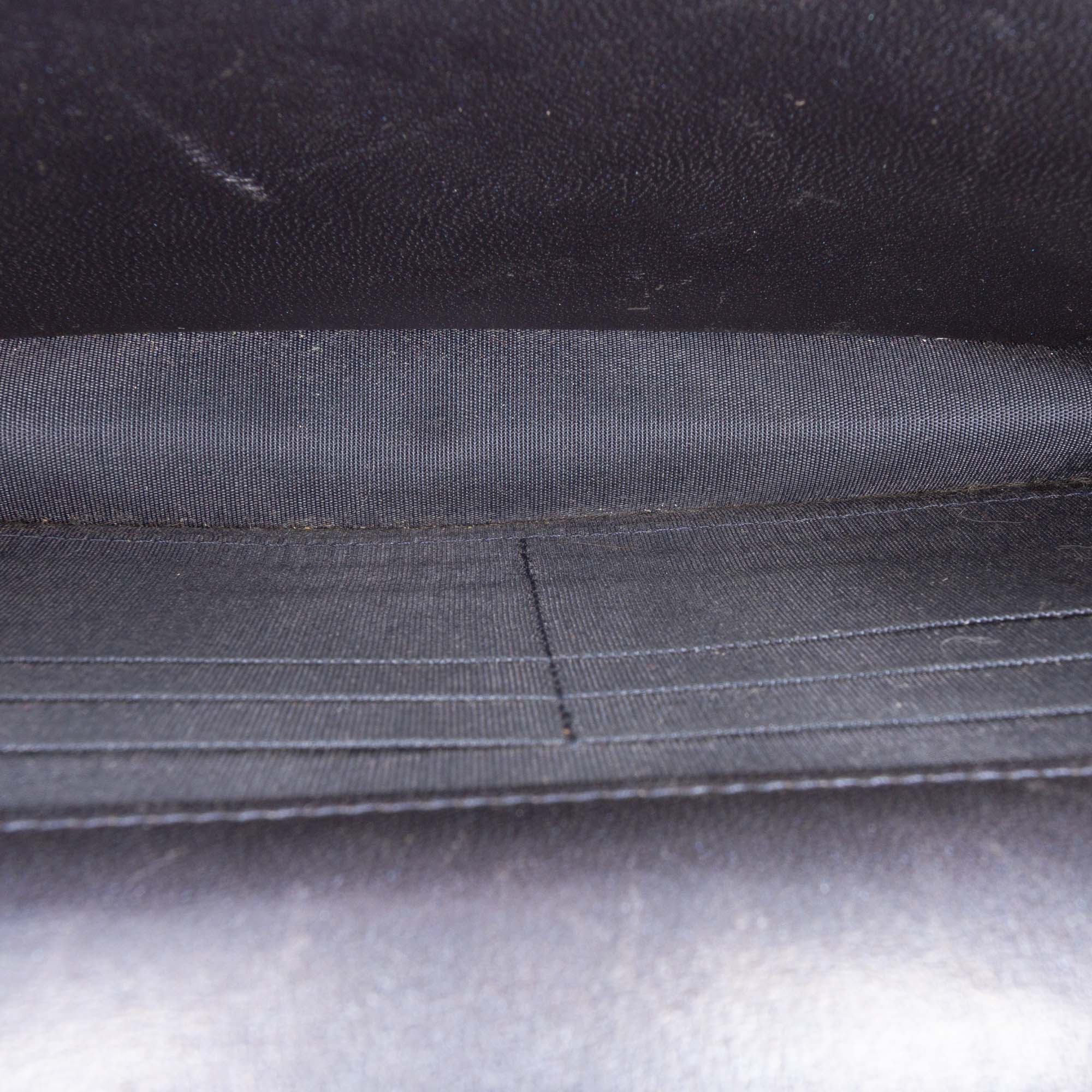 Condition: The leather shows a few slight creases. There is slight wear visible at the corners. The shoulder strap with chain shows slight signs of wear. The hardware and clasp show fine surface scratches. There are slight signs of wear on the inside.