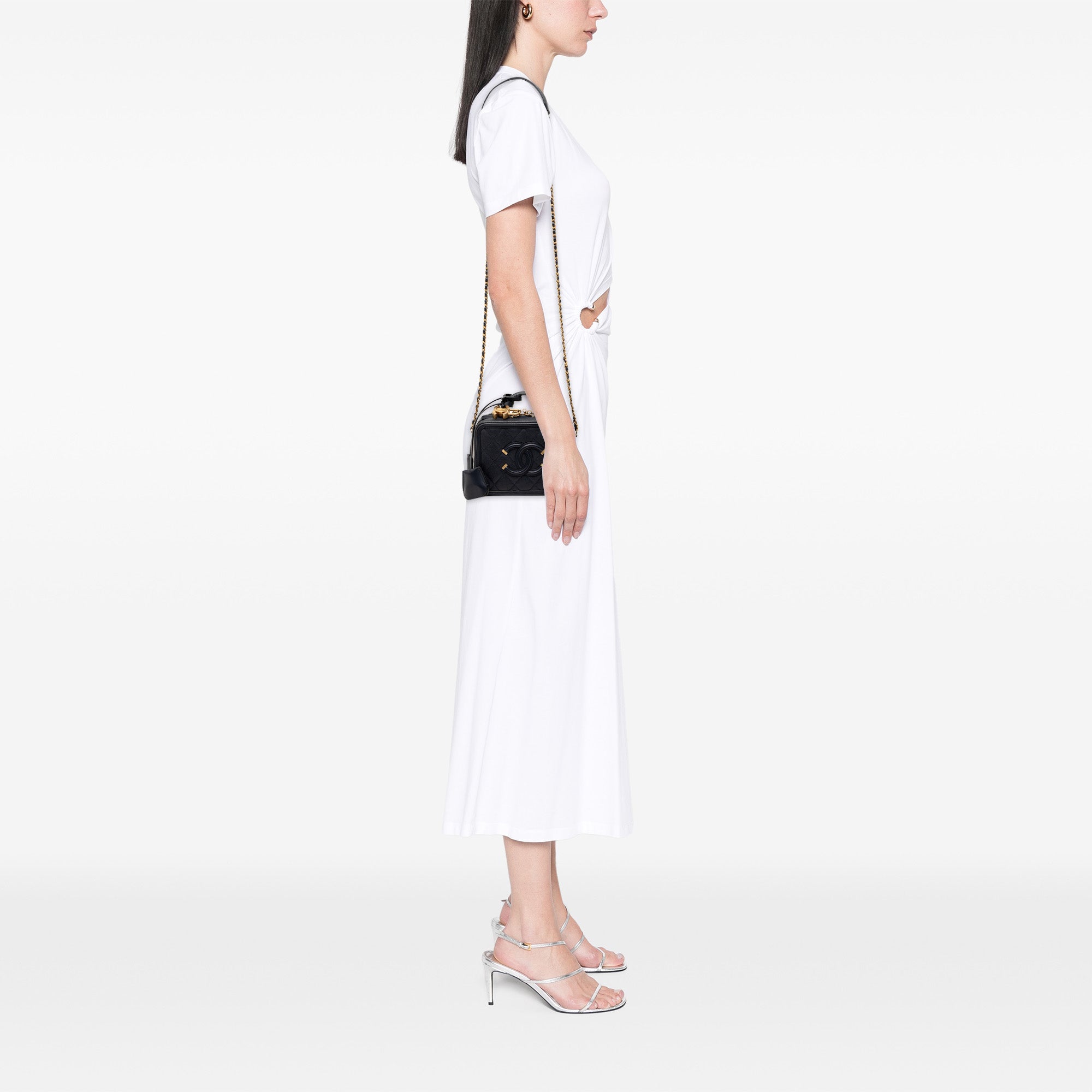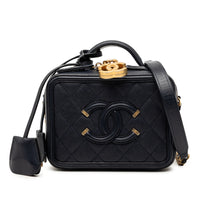 The Chanel Small Caviar CC Filigree Vanity Case reimagines the classic vanity shape as a compact handbag with a clean silhouette and elegant proportions. The quilted Caviar leather provides structure and durability, while the CC Filigree detail adds a subtle, graphic accent. A flat leather handle rounds out the design and underscores its polished appearance.