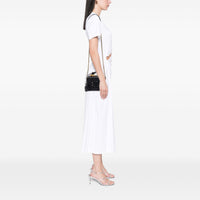 A leather-woven chain strap with a leather overlay offers flexible carrying options, suitable for the shoulder or as a crossbody. The all-around zipper closes securely and allows for easy access to the contents. Inside, a zippered compartment and slip pockets help keep essentials like a smartphone, card holder, keys, and cosmetics organized—ideal for events, dinners, or stylish everyday use.