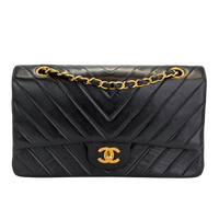 The Chanel Classic Double Flap is probably one of the most sought-after bags in the world. This is quilted in a chevron pattern Bag a beautiful rarity and difficult to find. The elegant and timeless shape of the Bag can be traced back to a creation by Coco Chanel from 1955: the model 2.55. The iconic CC Lock However, it was only created later by the magic of Karl Lagerfeld. Made from the finest lamb leather, the Bag via an outside compartment on the back. On the inside of the front flap, you can find Coco Chanel's secret zipper compartment. The inner flap can be closed at the push of a button. There are two pockets inside. In addition, the Bag another open compartment on the inside front.