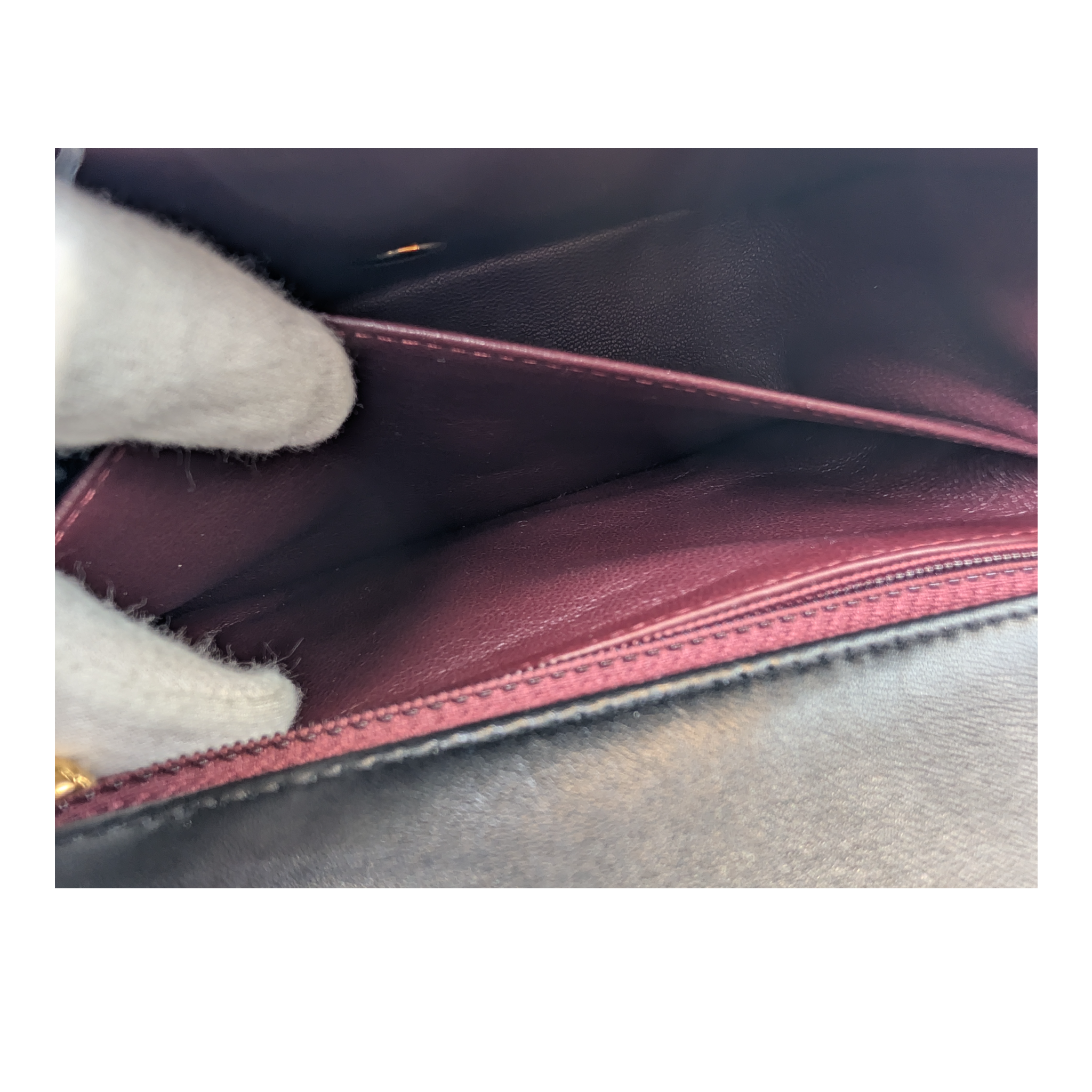 Condition: The Bag is located in an exceptionally well maintained Condition. The lamb leather is supple and almost flawlessly preserved. Due to age, the shape shows minimal loosening, as is usual with vintage models. The hardware only has very fine, superficial scratches. Overall, it presents itself Bag in excellent overall condition.