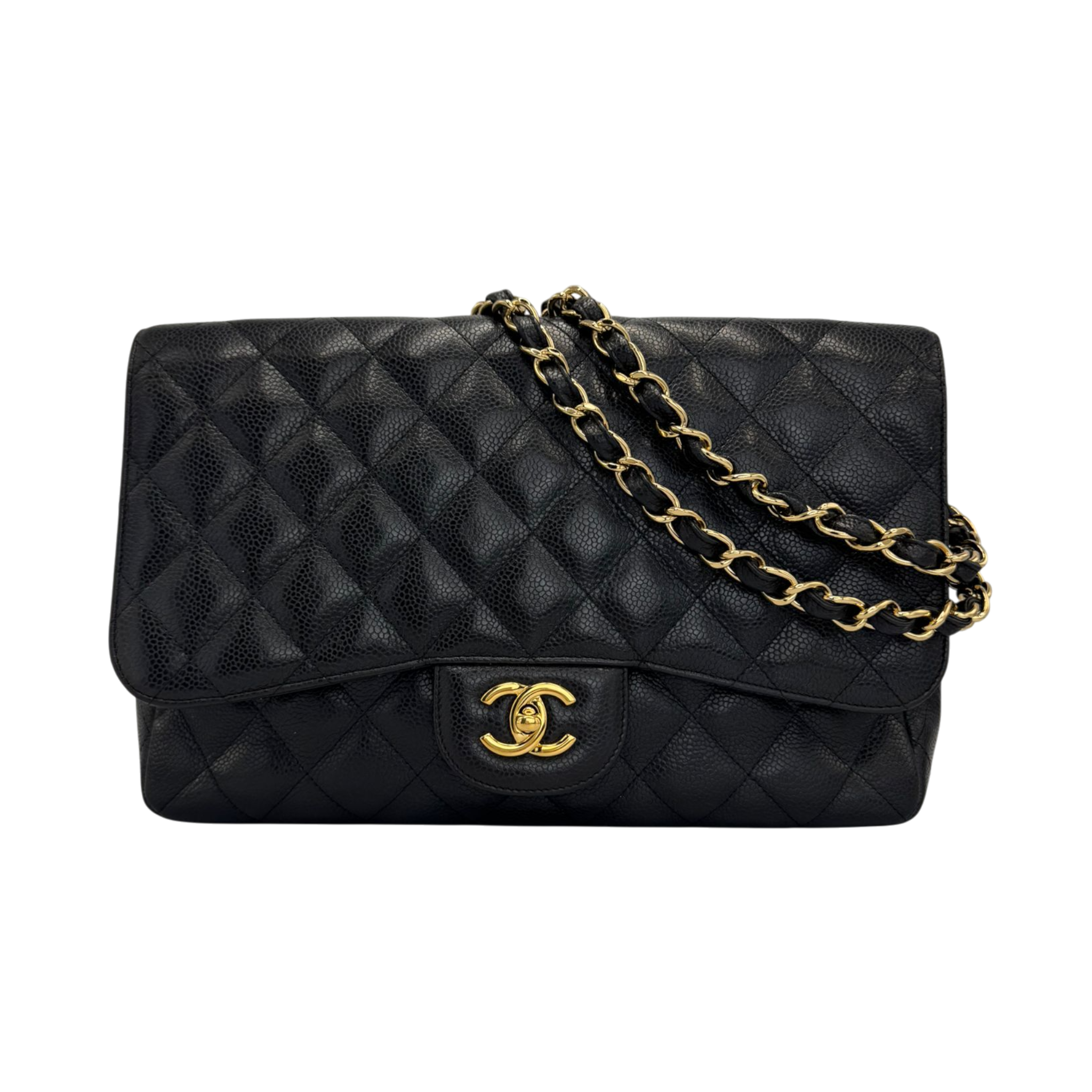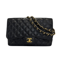 A Chanel Classic Flap in size Jumbo made of black Caviar-Leather with gold-tone hardware. The characteristic diamond quilting, the CC twist lock and the clearly defined silhouette represent the timeless design of the Classic line.