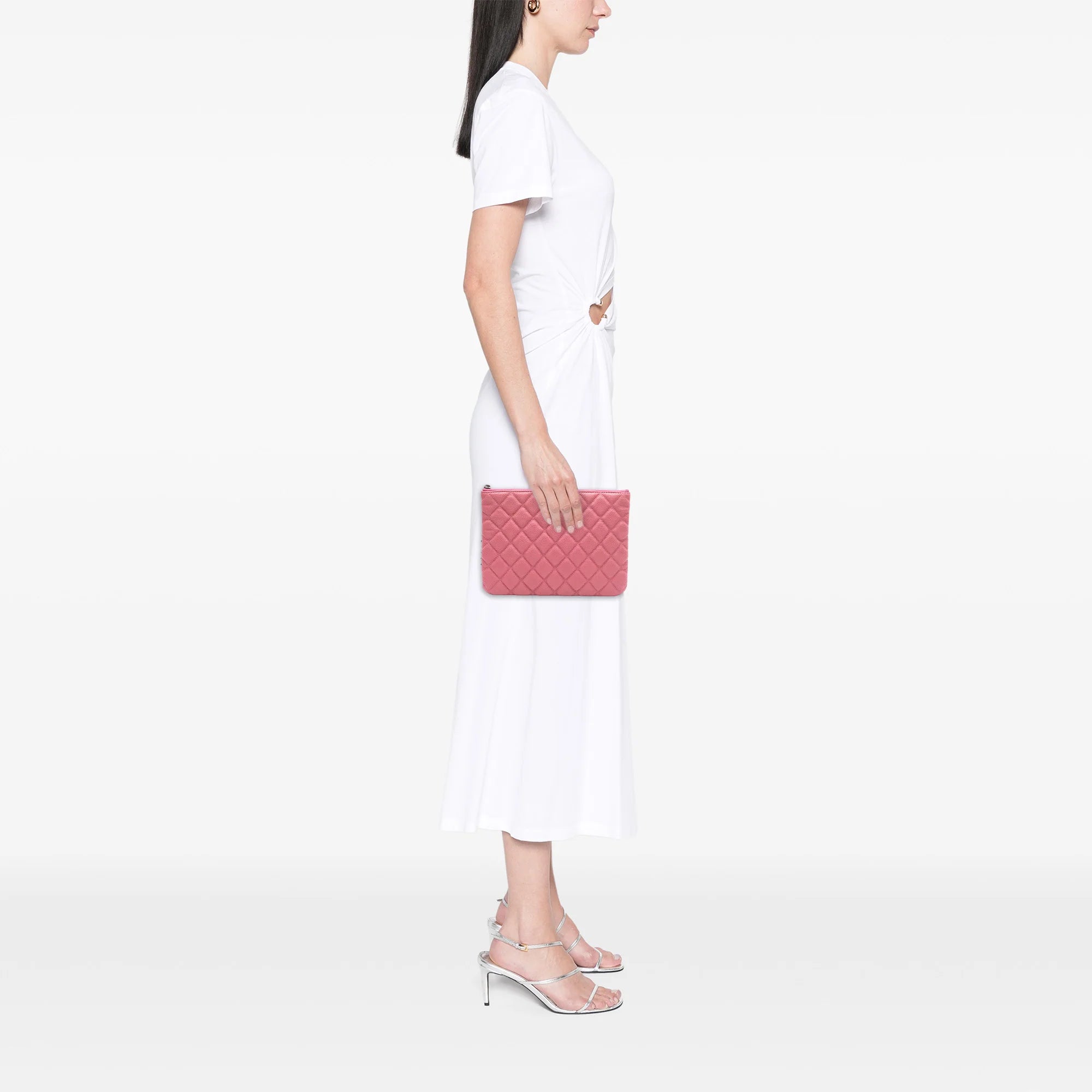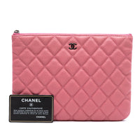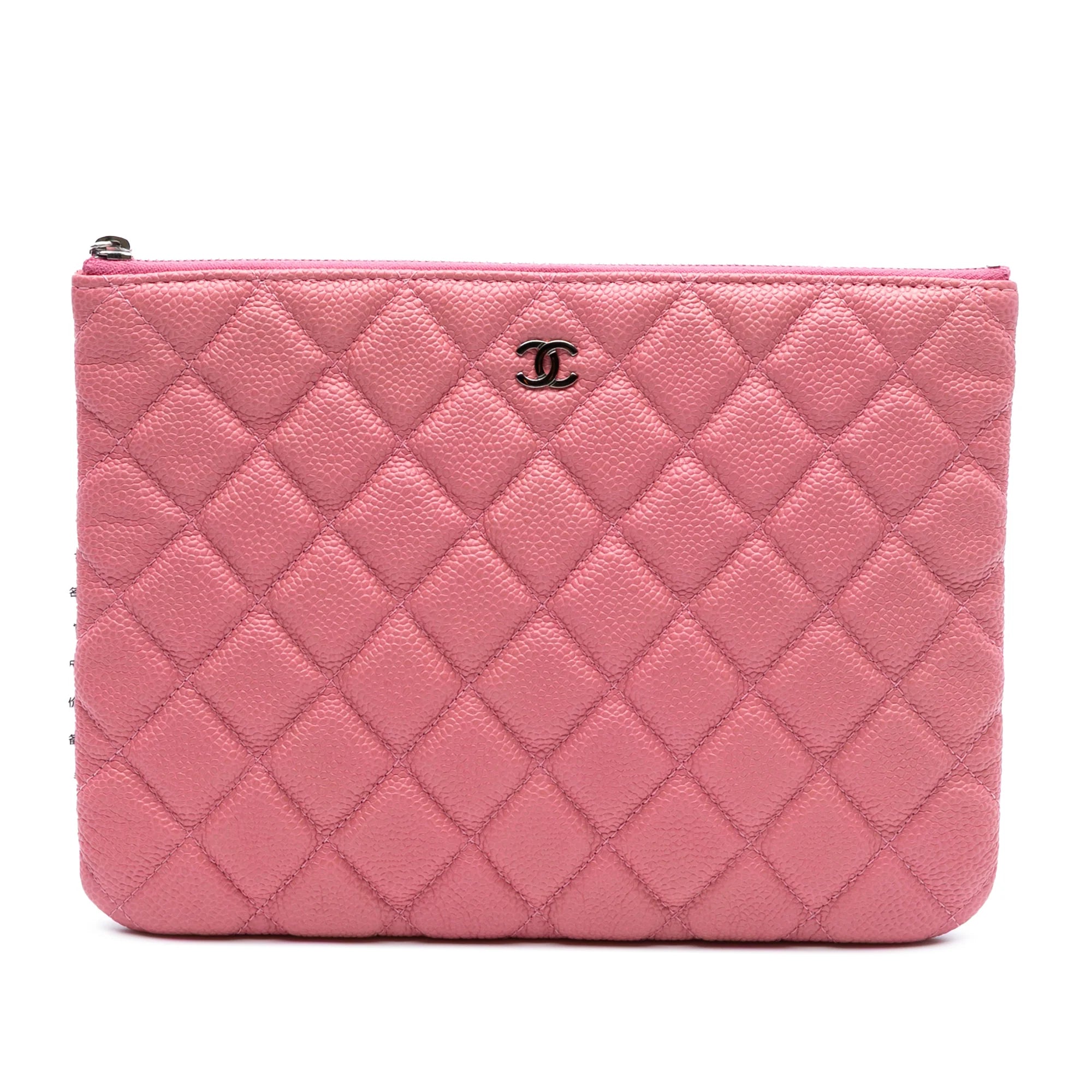 This clutchBag has a quilted Kaviar-Leather body, a top zip closure, an exterior back slip pocket, and an interior zip pocket.