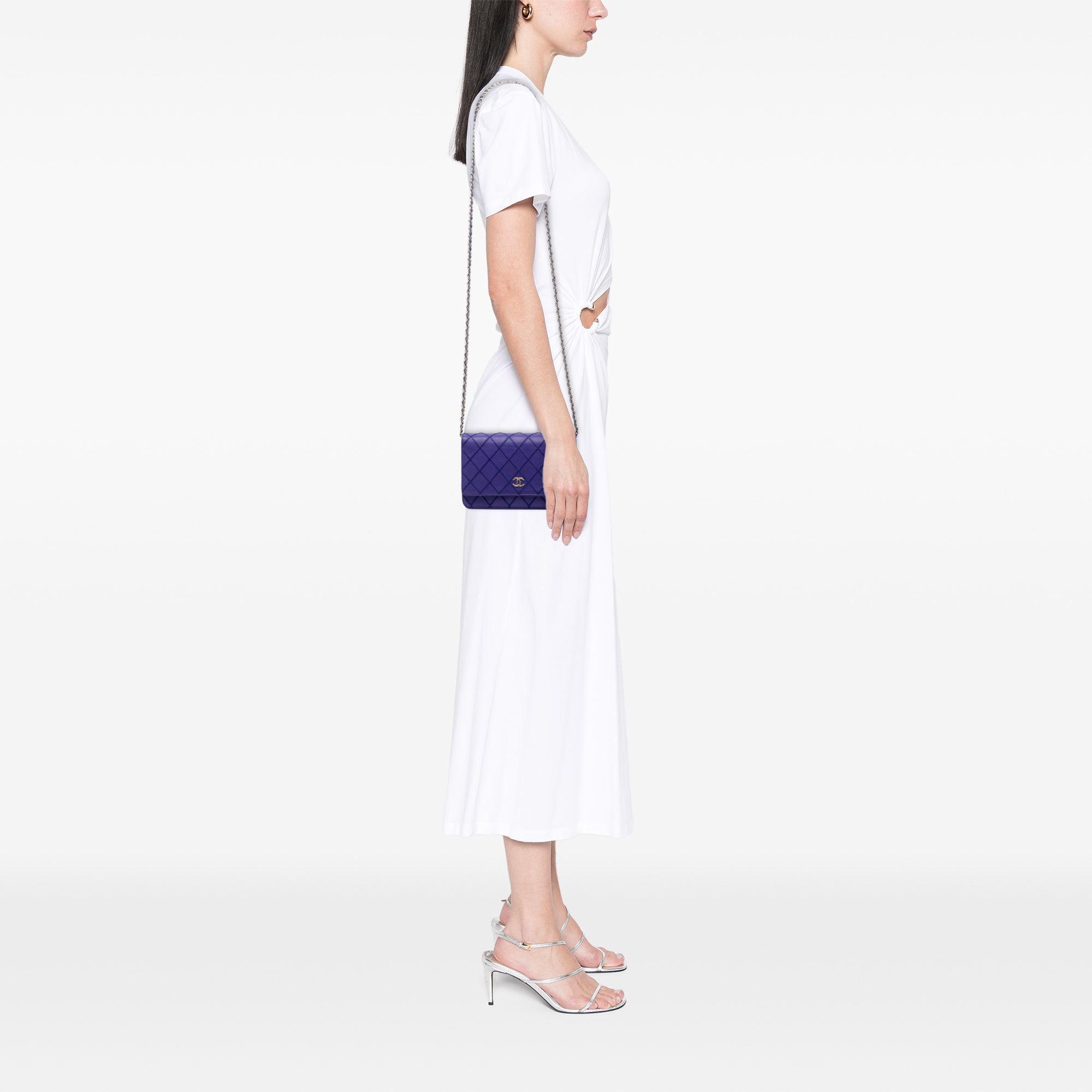 The Chanel CC Quilted Calfskin Fancy Wallet On Chain combines the clean lines of a wallet with the elegance of a small shoulder bag. Crafted from calfskin, the design features diamond quilting and delicate double-stitched details. On the front, the CC emblem adds a subtle signature touch, while the front flap with a snap closure neatly completes the silhouette.
