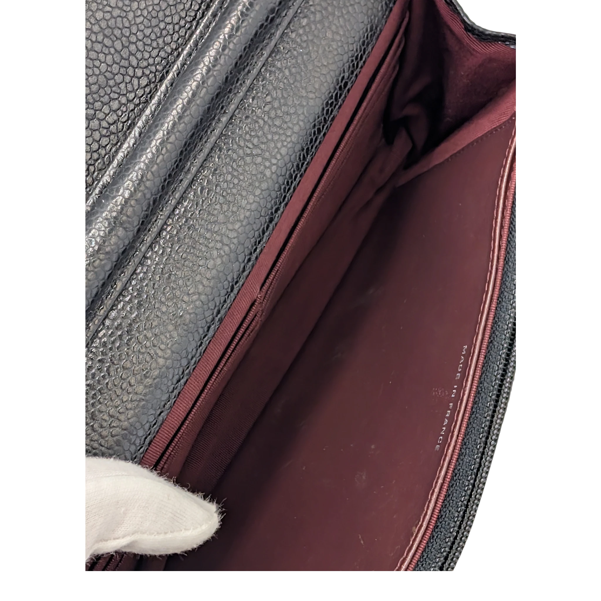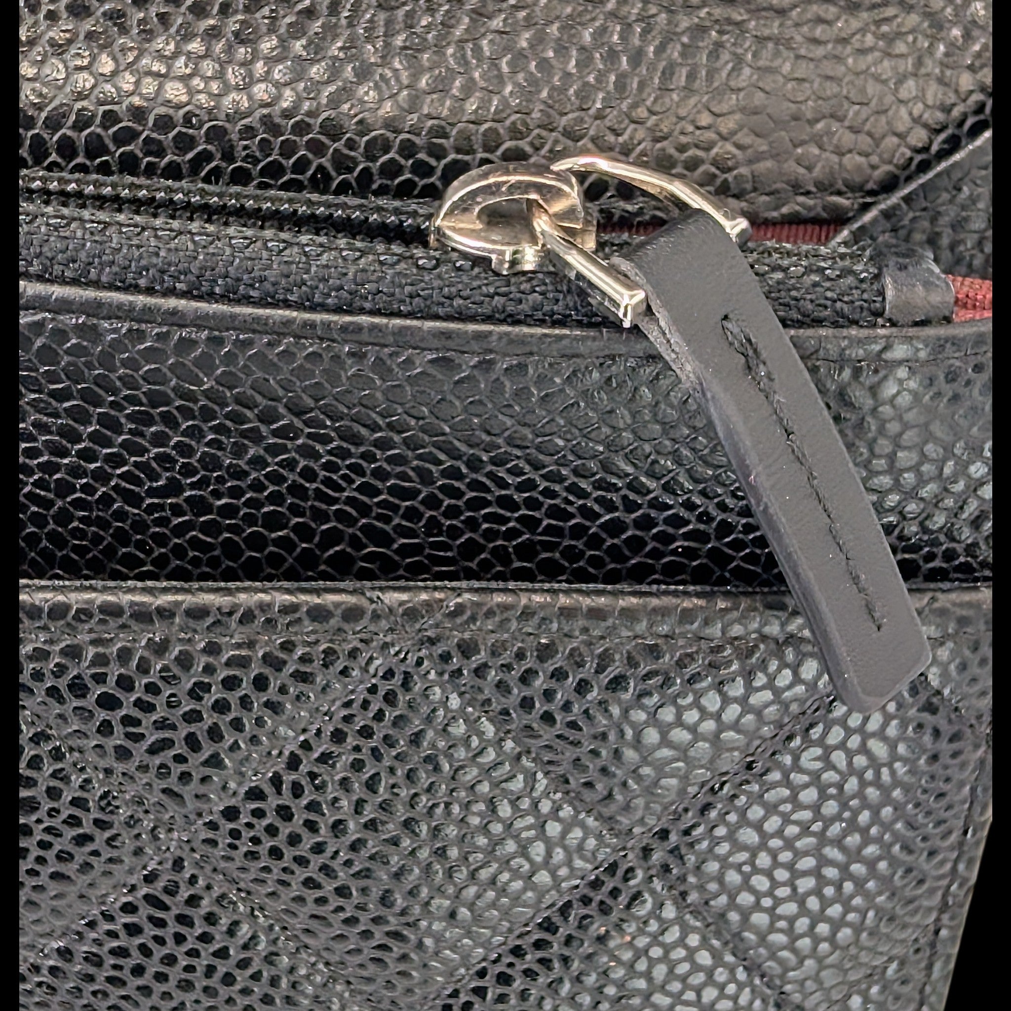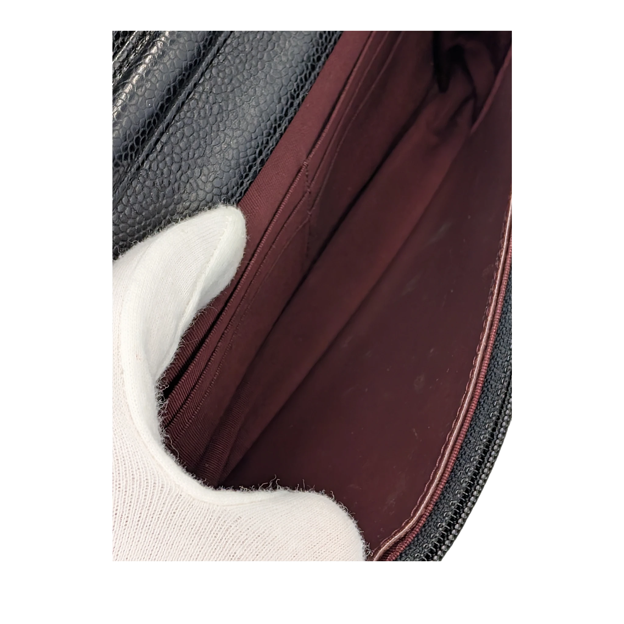 Condition: The Caviar The leather is used but in good overall condition Condition. The hardware shows visible scratches and signs of wear. There is slight scuffing on the corners. The Bag It is slightly out of shape. There are some light scratches and stains on the inside. The zipper pull is a non-original replacement part.