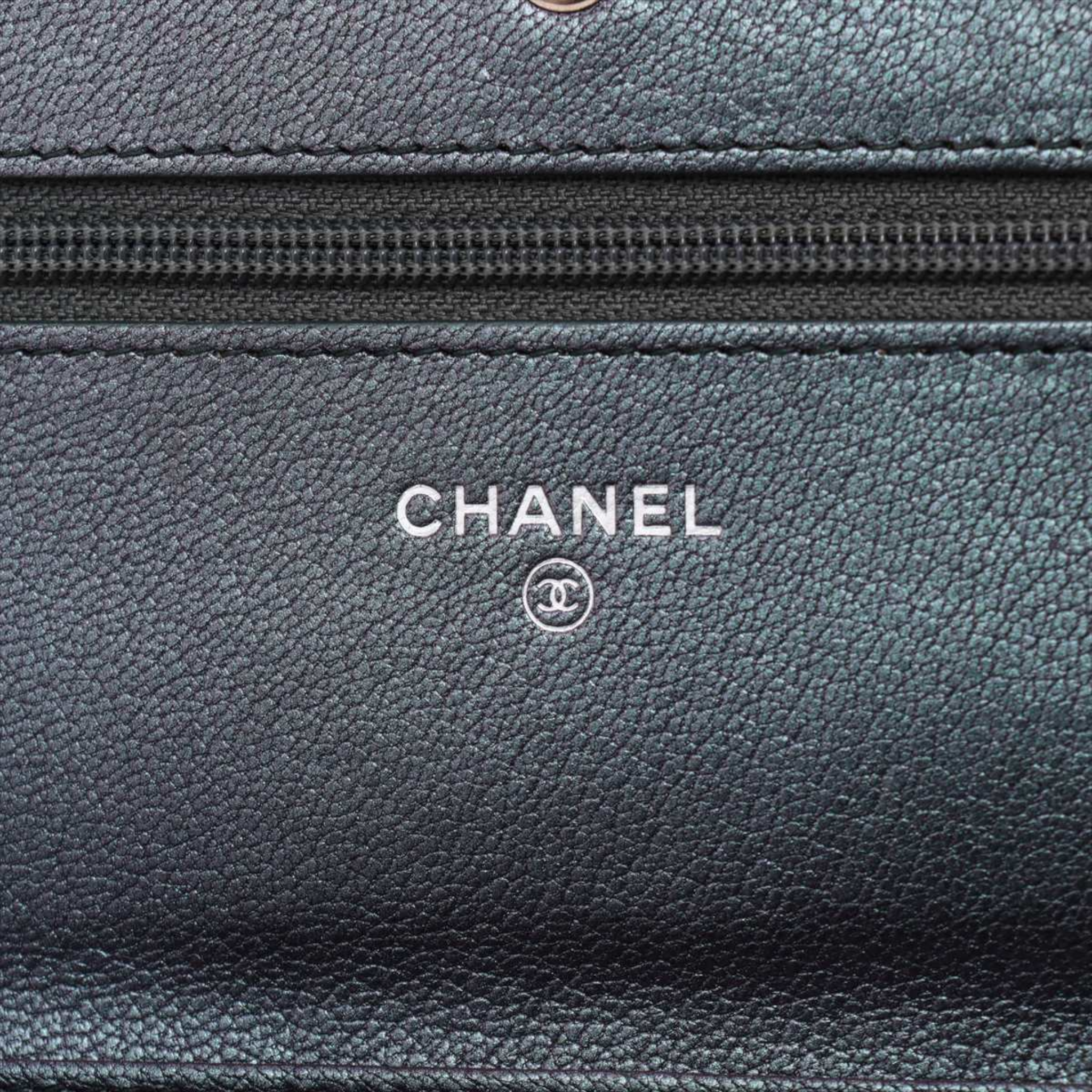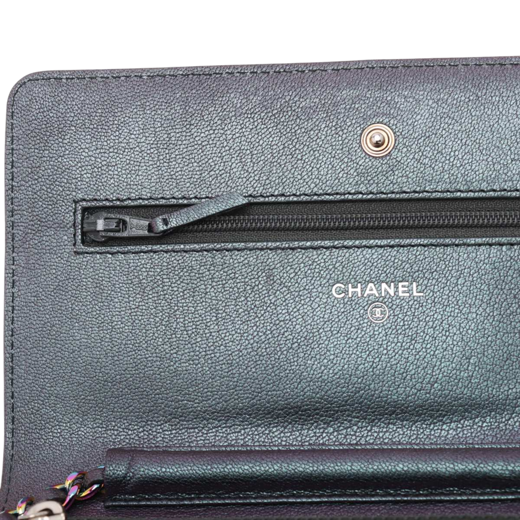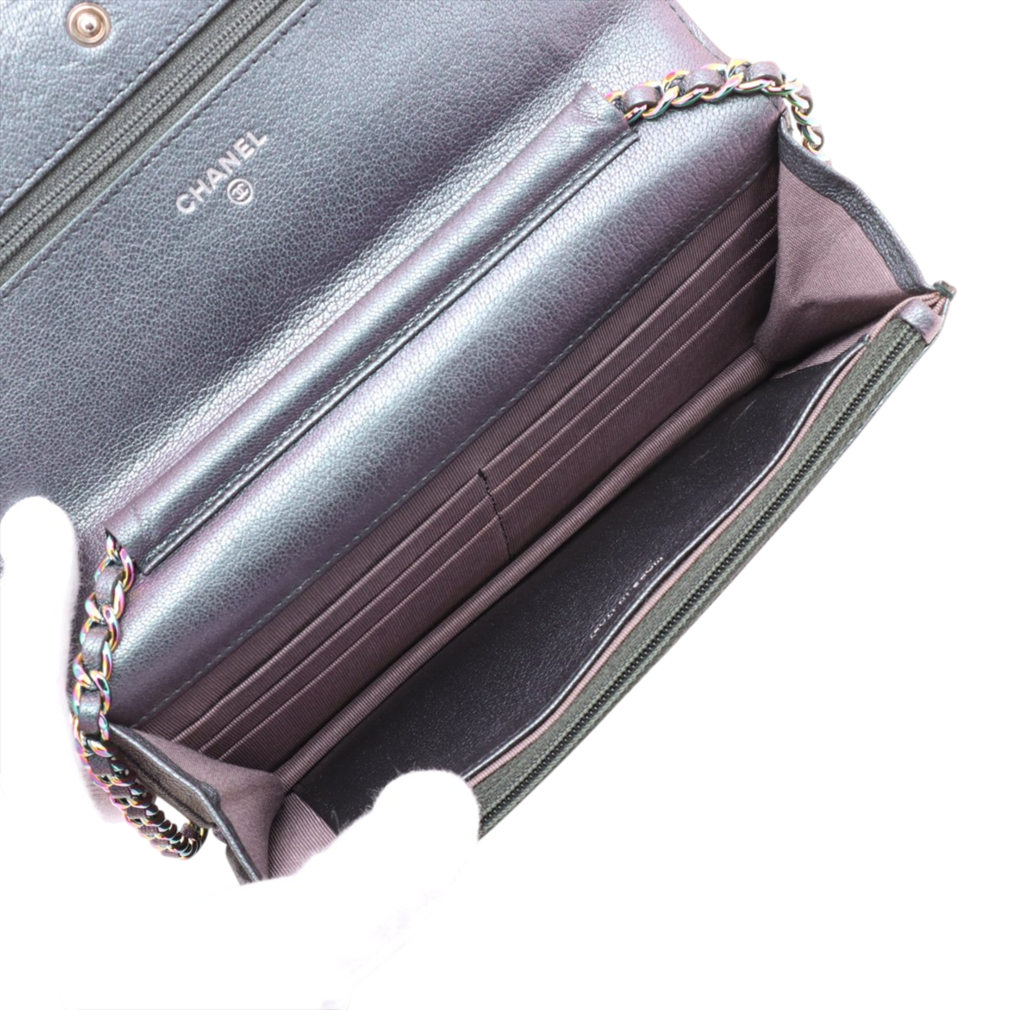 This Chanel Wallet on Chain impresses with its unusual color scheme: a deep dark purple with a subtle shimmer that shimmers elegantly between eggplant and grey depending on the light. In combination with the rare rainbow hardware, it creates a modern, almost artistic look that clearly stands out from classic Chanel models.