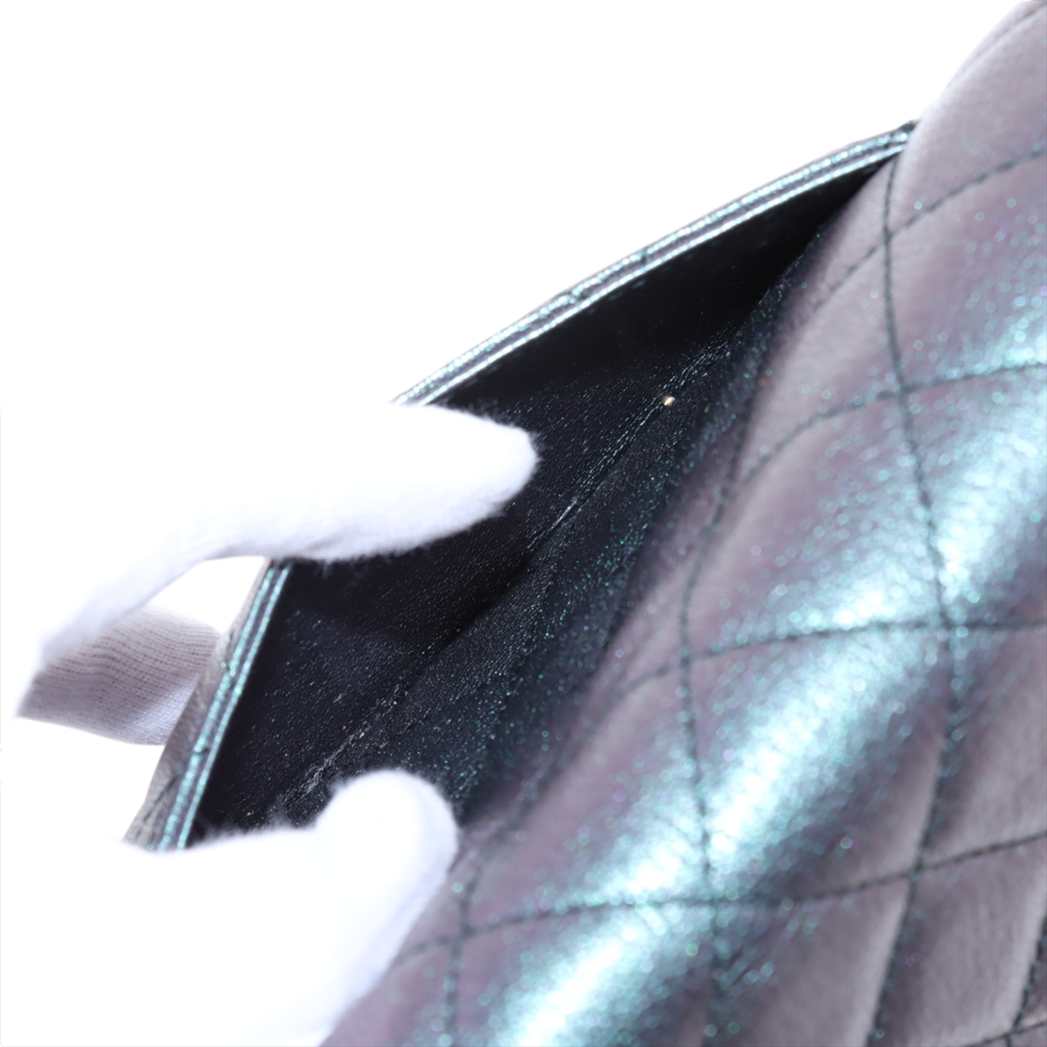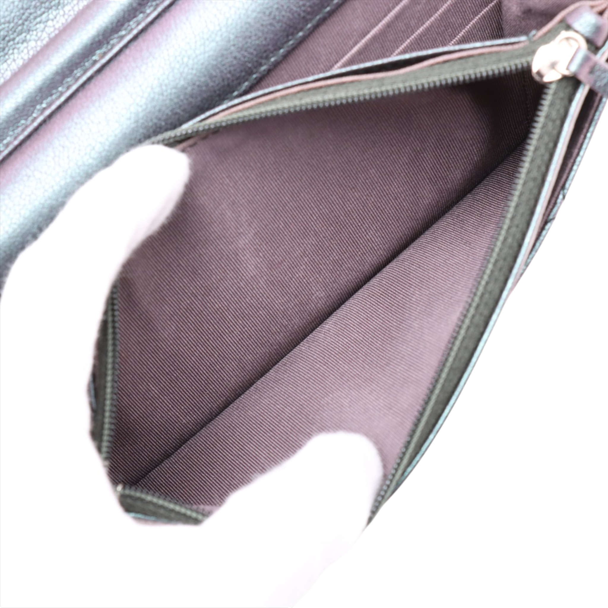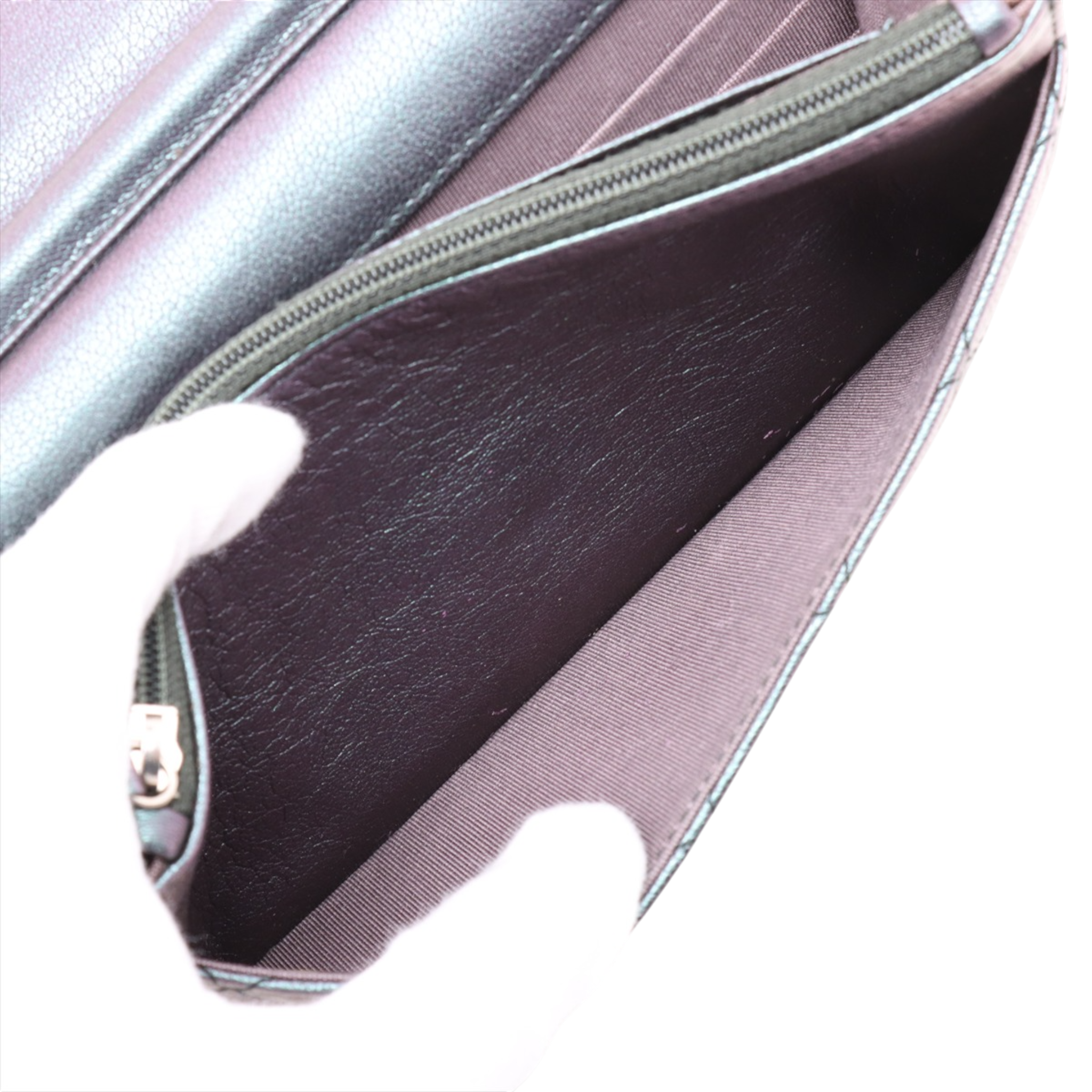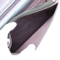This Chanel Wallet on Chain impresses with its unusual color scheme: a deep dark purple with a subtle shimmer that shimmers elegantly between eggplant and grey depending on the light. In combination with the rare rainbow hardware, it creates a modern, almost artistic look that clearly stands out from classic Chanel models.