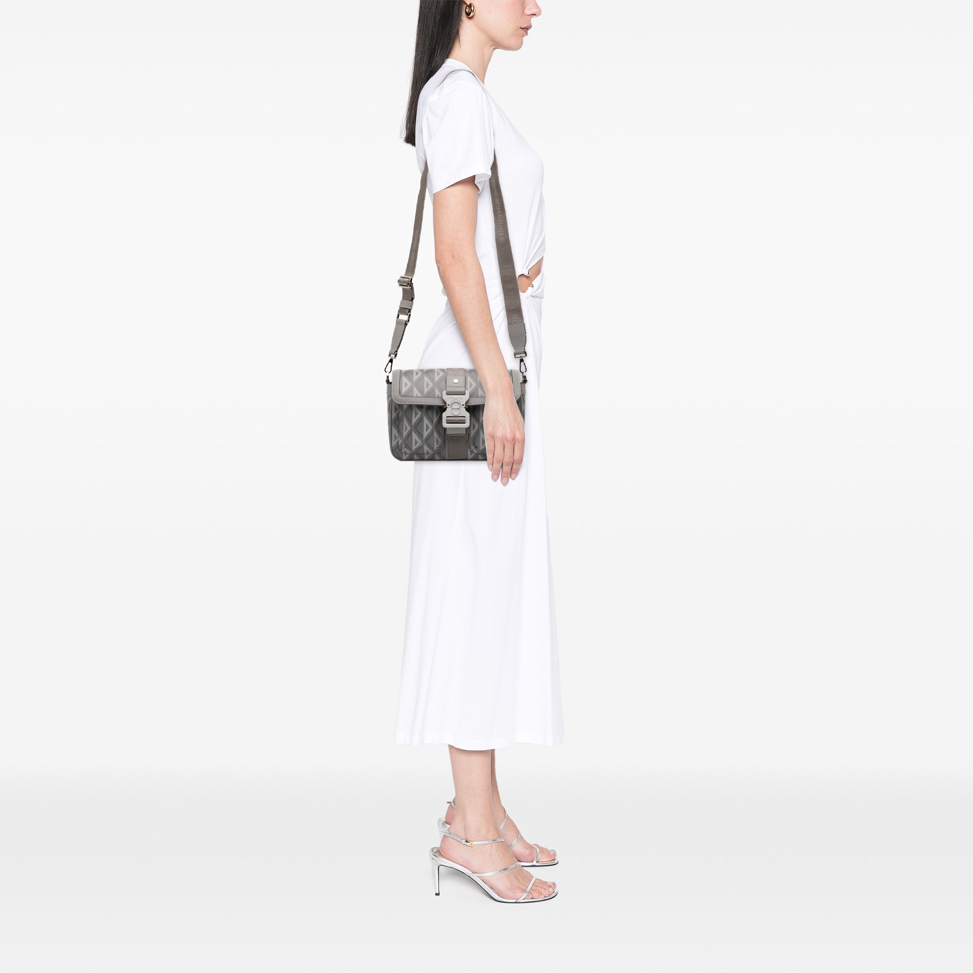 The Dior Mini Coated Canvas CD Diamond Hit The Road Messenger Bag reinterprets the messenger silhouette in a compact format with clean, precise lines. The coated canvas features the CD Diamond motif and is edged with leather trim, creating a textured, modern look. A front flap with a buckle closure adds a functional detail and emphasizes the utilitarian character of the design.