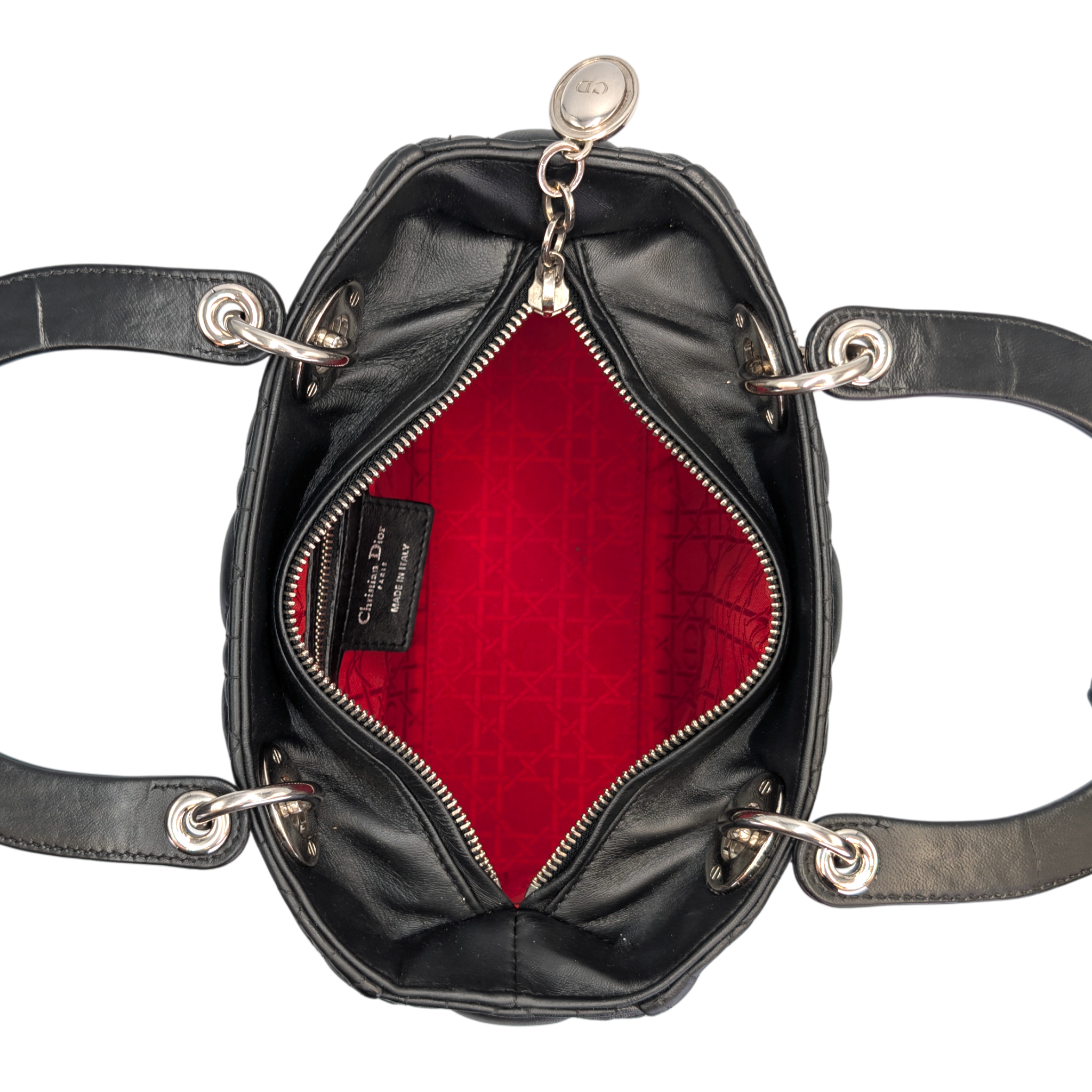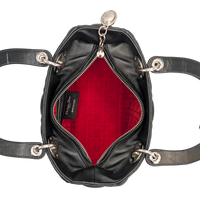 The Lady Dior Cannage is a classic companion. With its quilted lambskin and leather details on the sides, clasp and handle, it stands for simple elegance. It is named in honor of the Princess of Wales, Lady Diana, who is often associated with her Bag was seen. The Bag Can be worn with the strap on the shoulder, crossboy or comfortably in the hand. It has rolled leather handles and an interior zippered compartment.