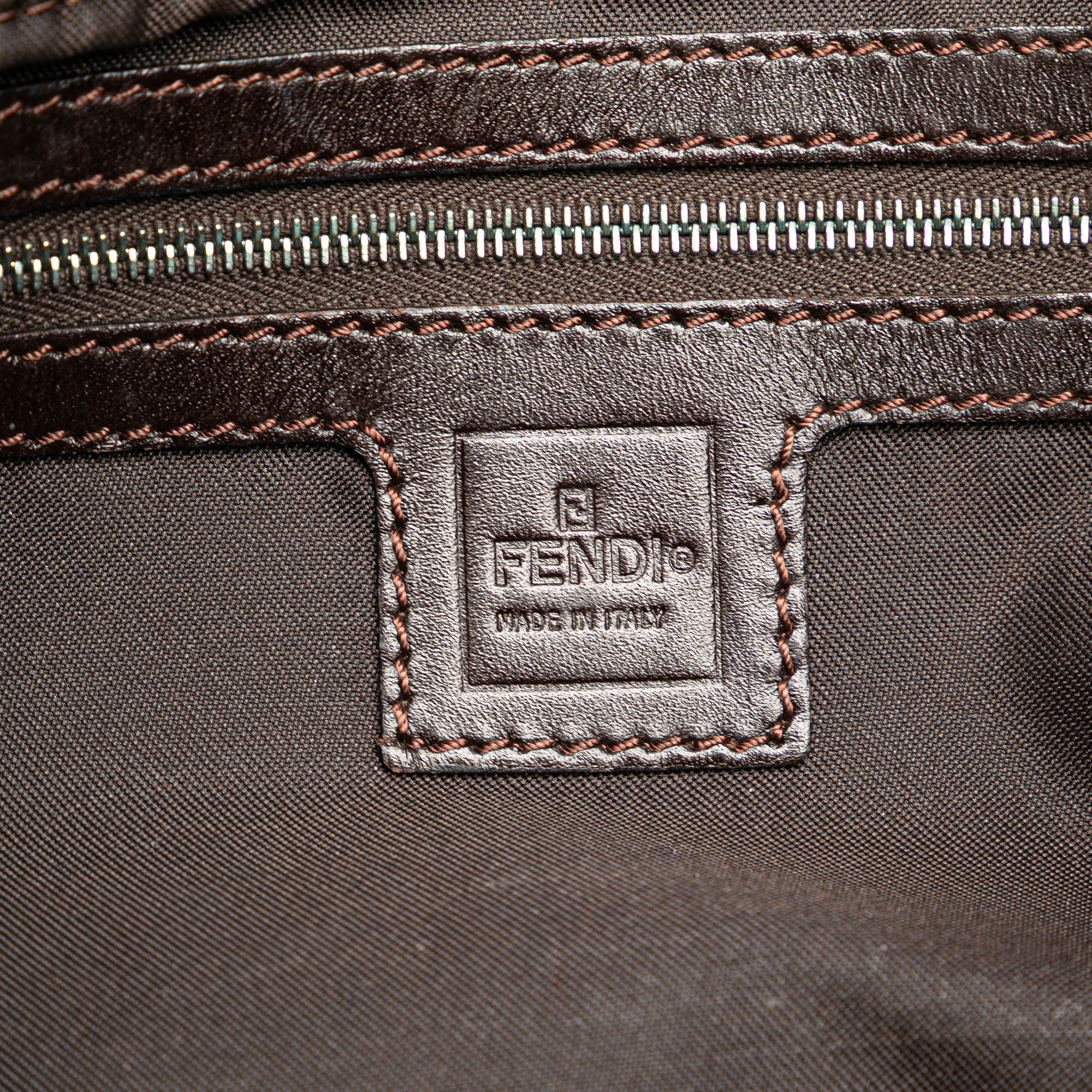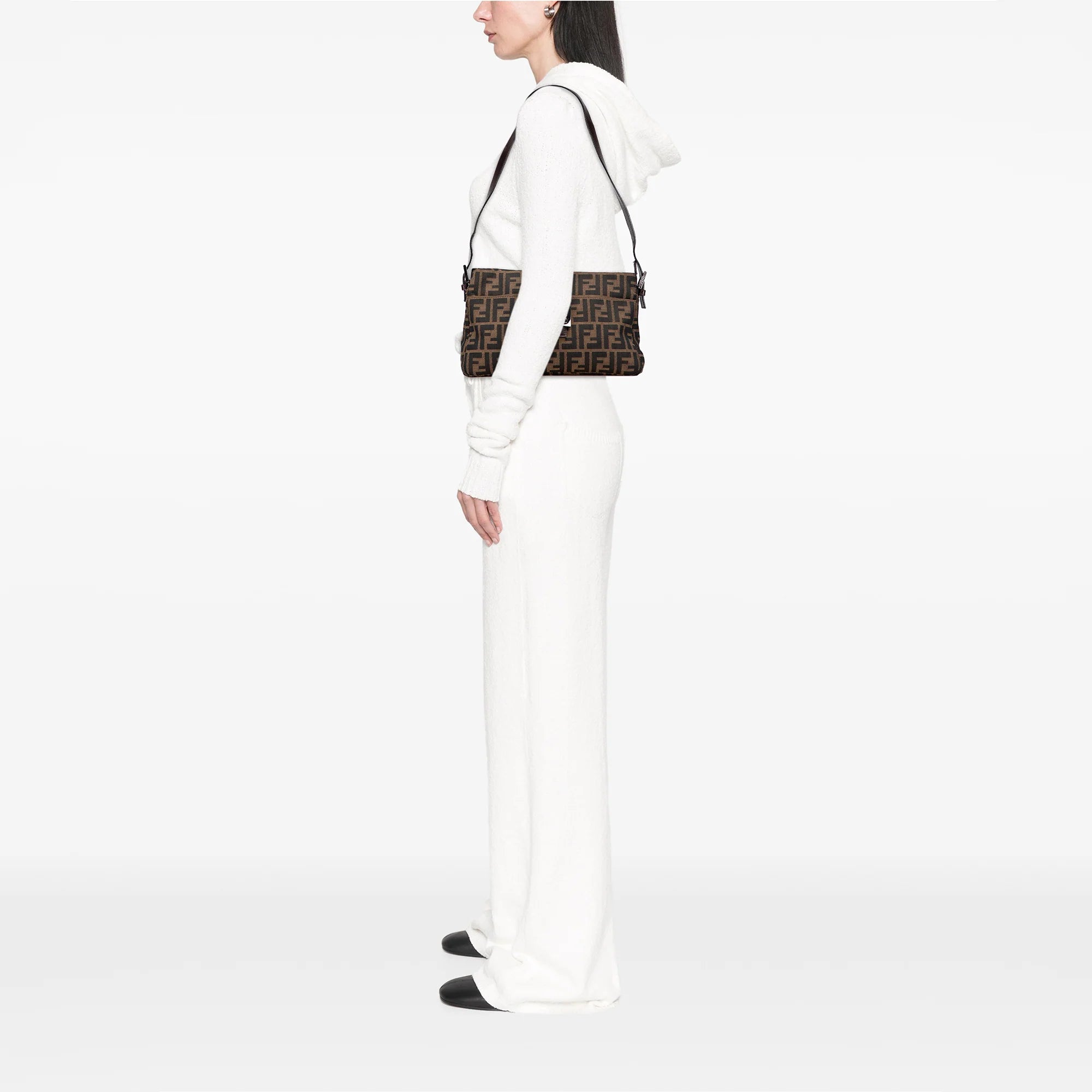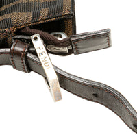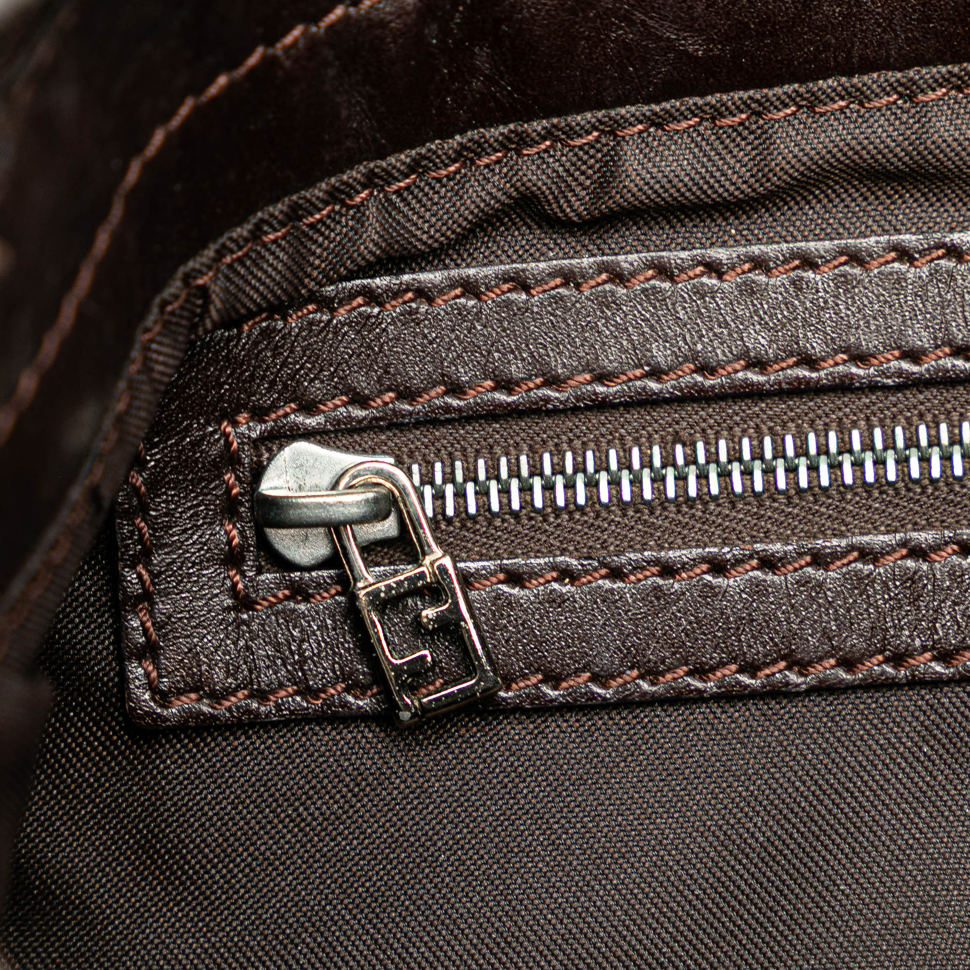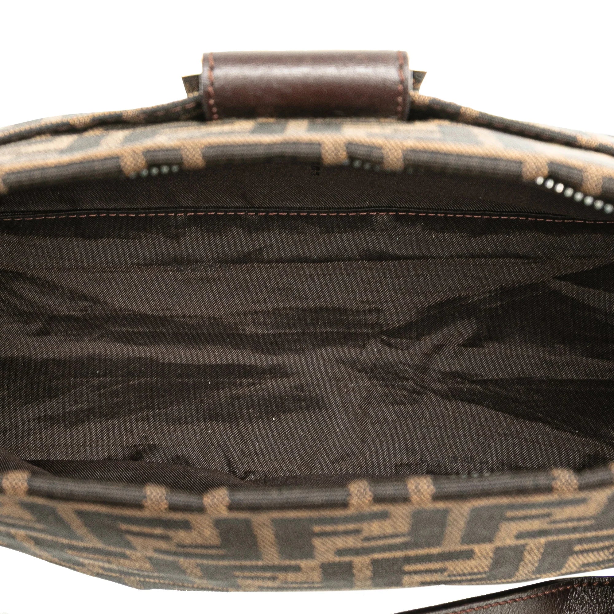 This Fendi shoulder bag is crafted from brown Zucca canvas and features silver detailing, brown leather trim and shoulder strap, a strap with a silver FF buckle and a magnetic clasp underneath, a front slip pocket and an interior zip pocket. The Bag is best worn over the shoulder.