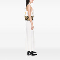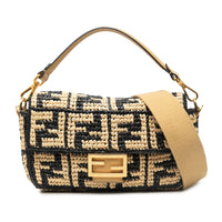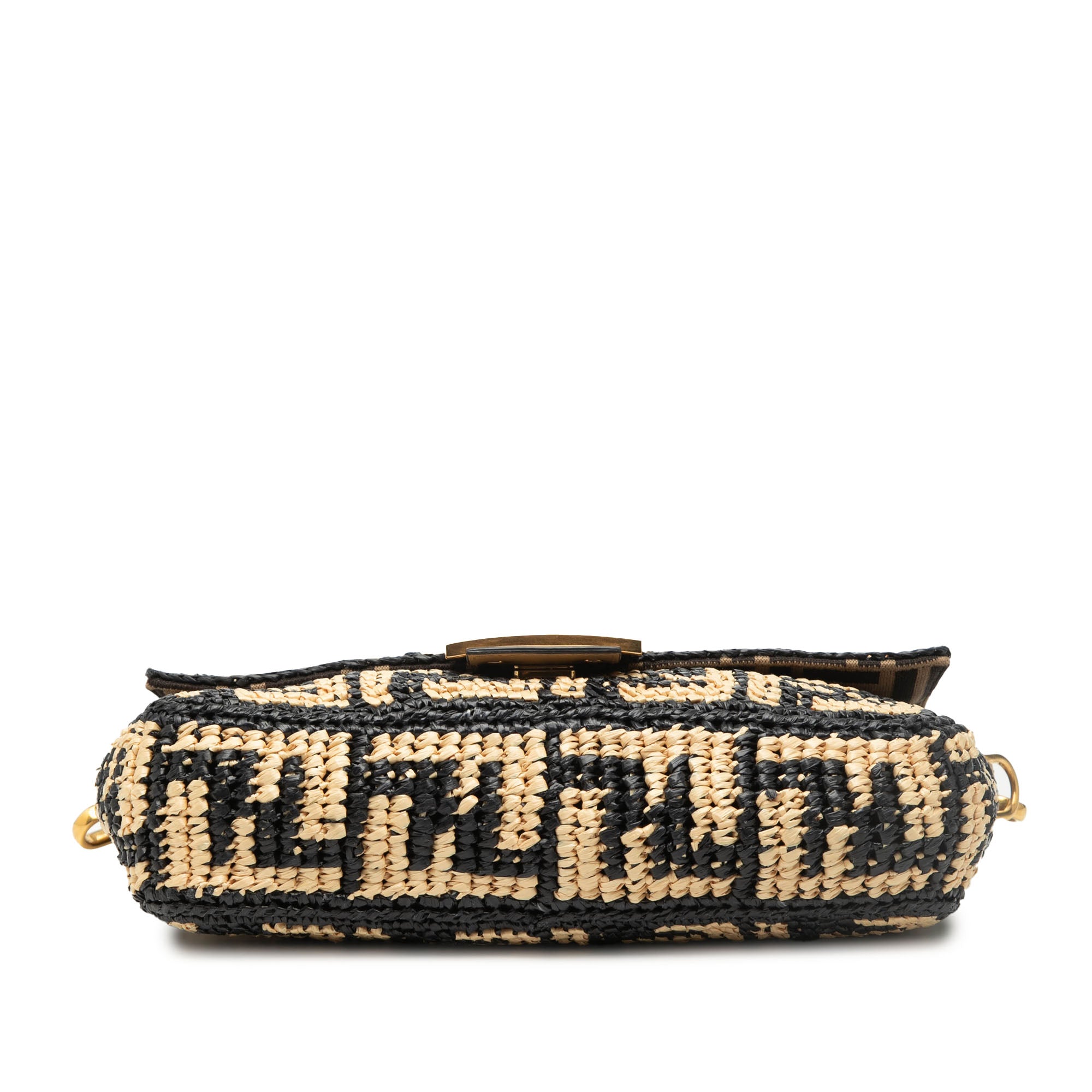 The Fendi Zucca Raffia Baguette Satchel reinterprets the iconic Baguette silhouette with a summery raffia body featuring the signature Zucca pattern. The compact shape is defined by a front flap with a magnetic closure, giving it a clean, structured look. Leather details provide a sophisticated contrast to the woven texture and emphasize the characteristic Fendi look.