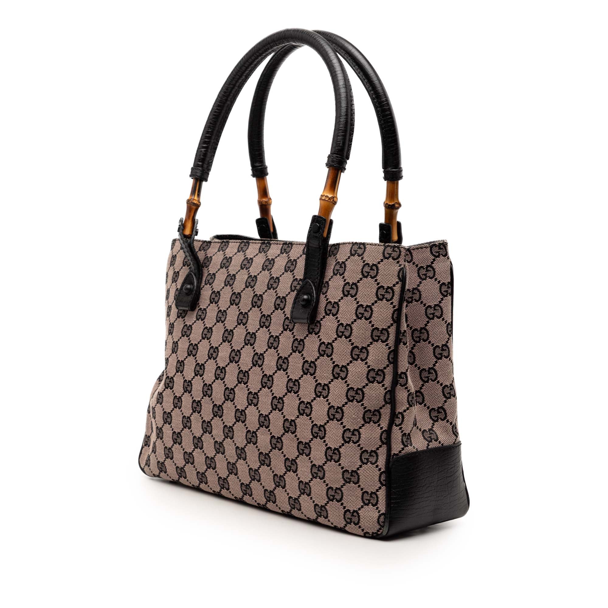 The open top allows for quick access, making it ideal for city life, business meetings, or travel. Inside, a zippered compartment provides additional organization, complemented by another zippered pocket for valuables and smaller essentials. The combination of a classic pattern, natural bamboo elements, and a functional interior layout makes this Tote a versatile companion with a distinct Gucci aesthetic.