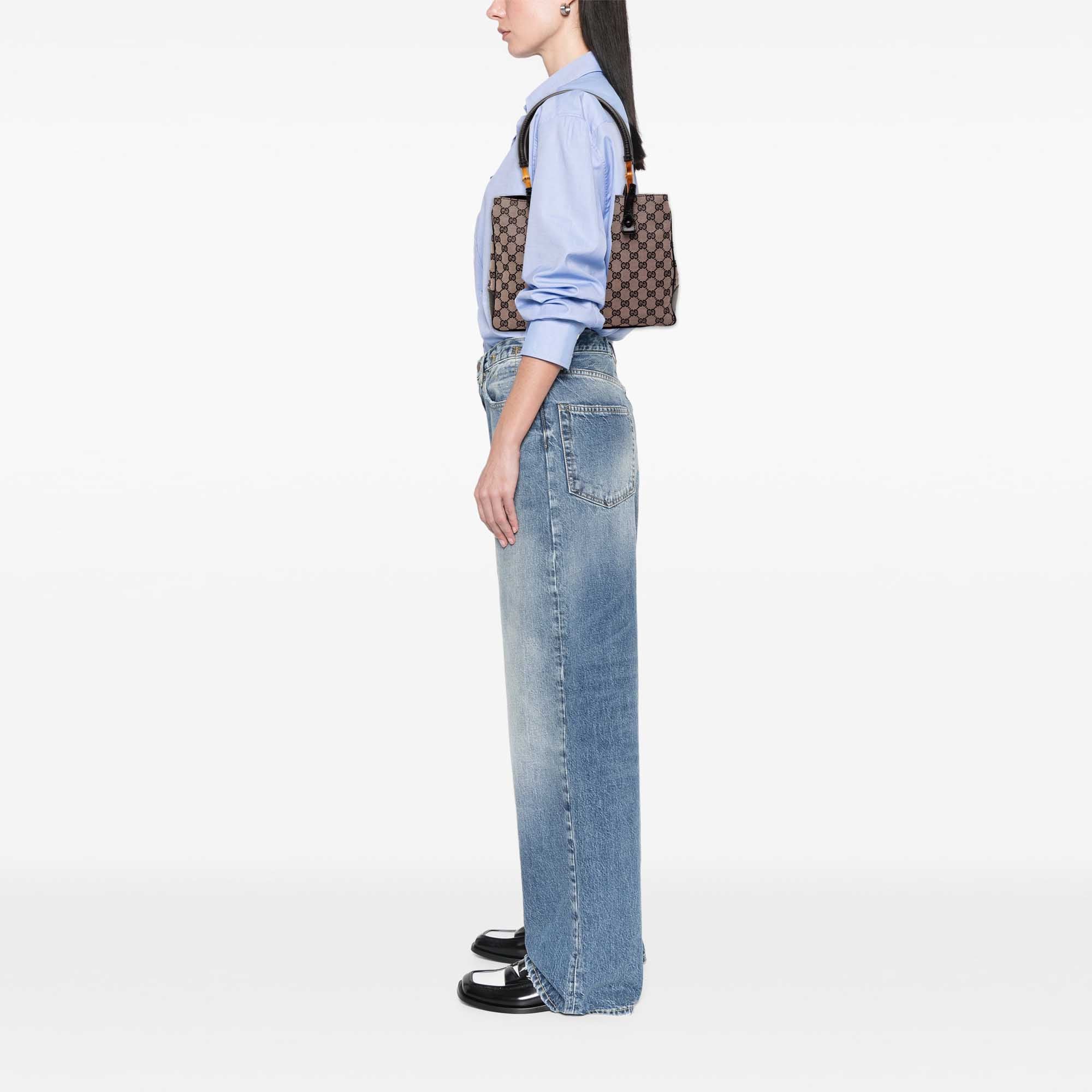 The Gucci GG Canvas Bamboo Tote combines the iconic GG canvas with fine leather trim to create an elegant Tote silhouette. A defining feature is the rolled leather handles, accented by bamboo details that give the bag a distinctive touch. The durable canvas ensures it’s suitable for everyday use, while the leather precisely frames the contours and stylishly defines the shape.