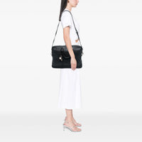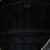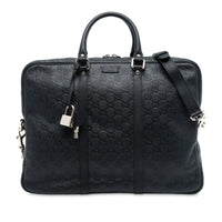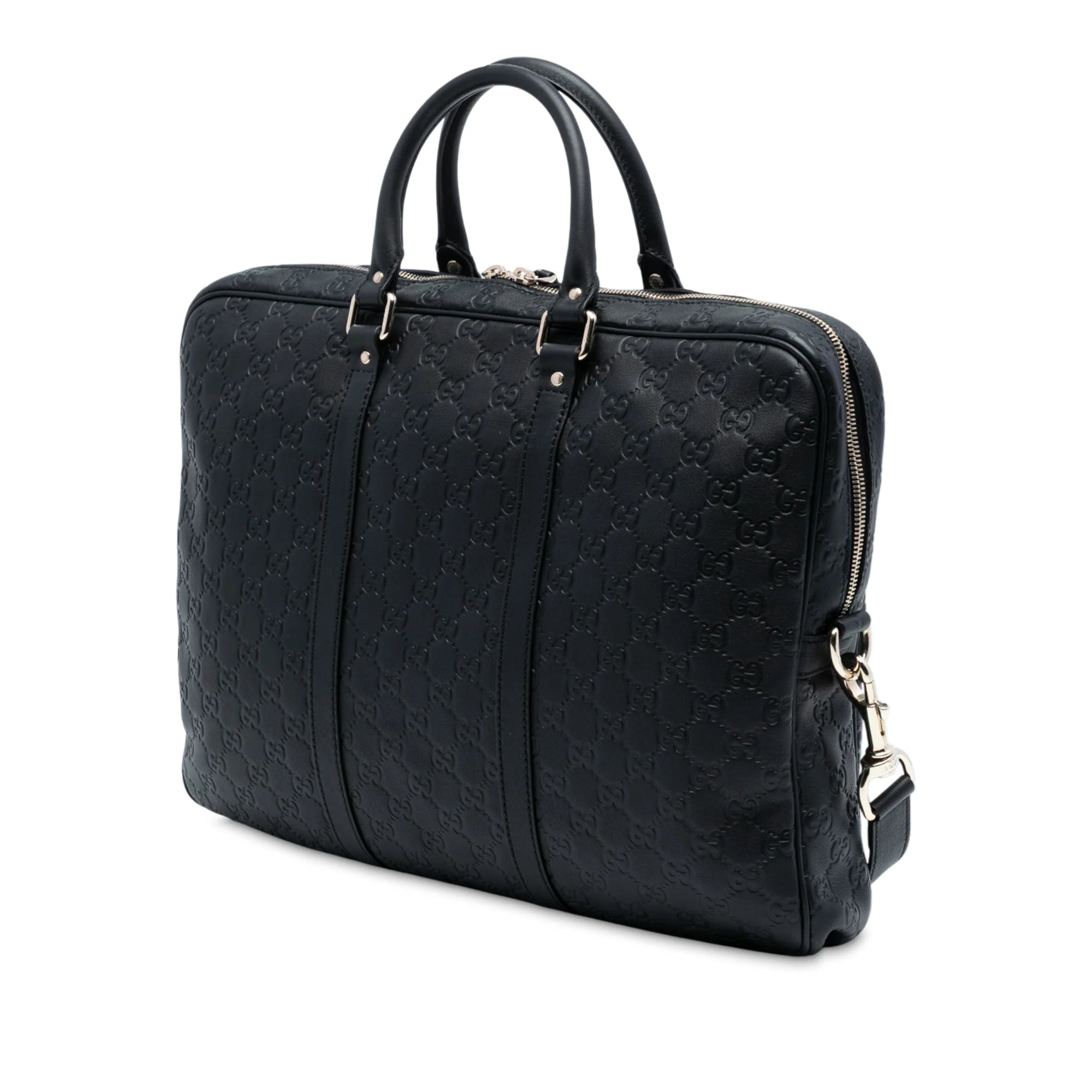 This businessBag features a leather body, rolled leather handles, a double zipper closure, a removable and adjustable flat leather strap, and an exterior pocket.