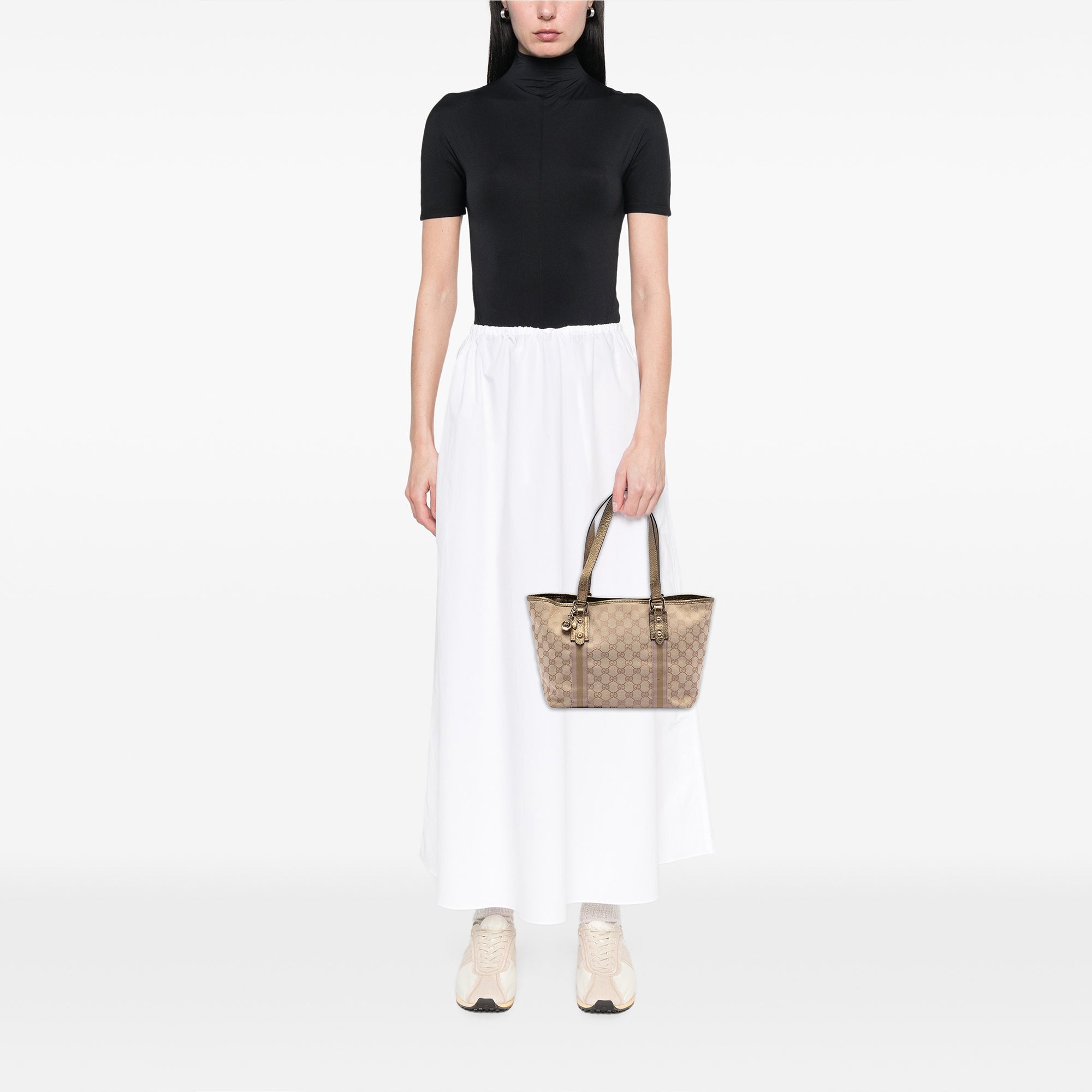 The Gucci GG Canvas Web Jolicoeur Tote reimagines the classic shopper, featuring the iconic GG canvas as its base and precise leather trim along the edges and handle attachments. The signature webbing adds a subtle, sporty touch, while the clean lines and flat leather straps create a balanced silhouette. The open-top design highlights the bag’s ease of use and emphasizes its relaxed, urban aesthetic.