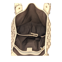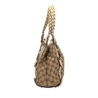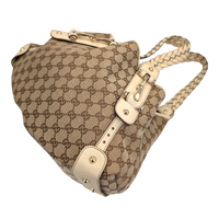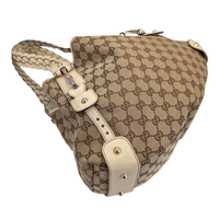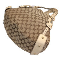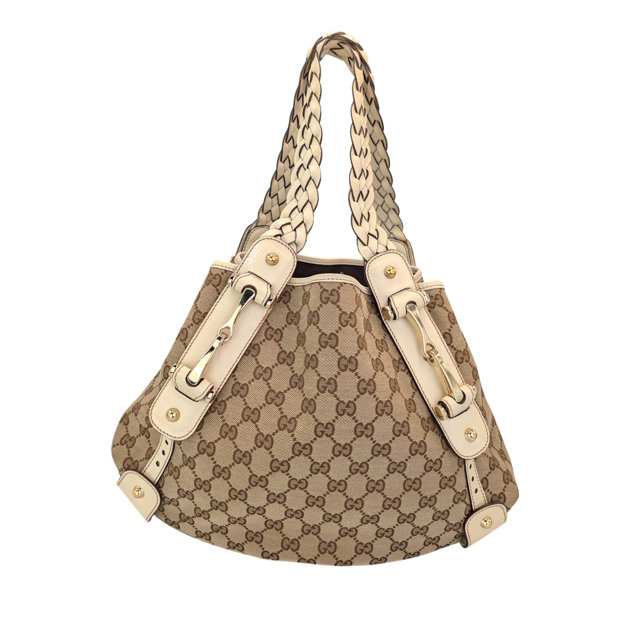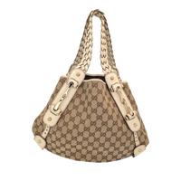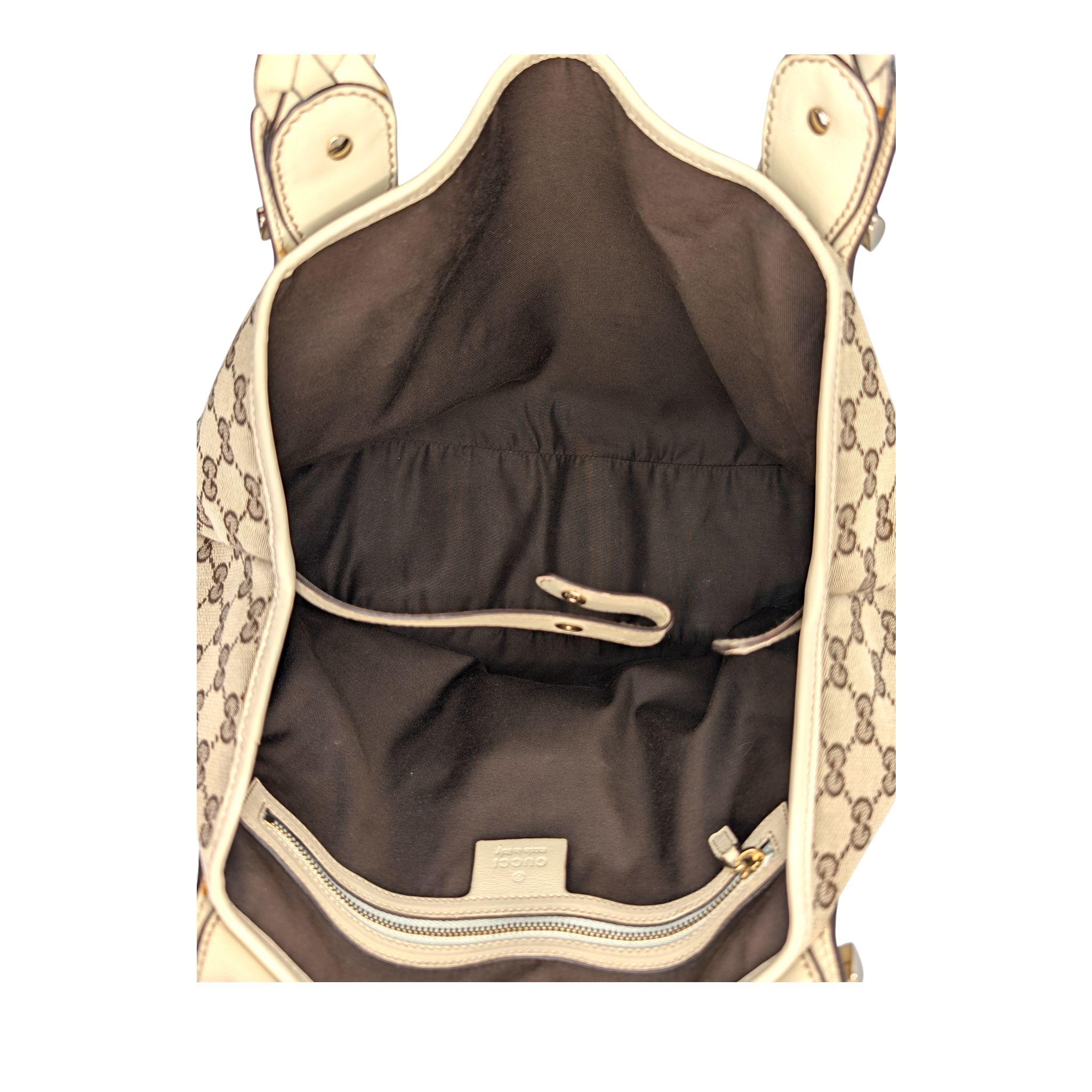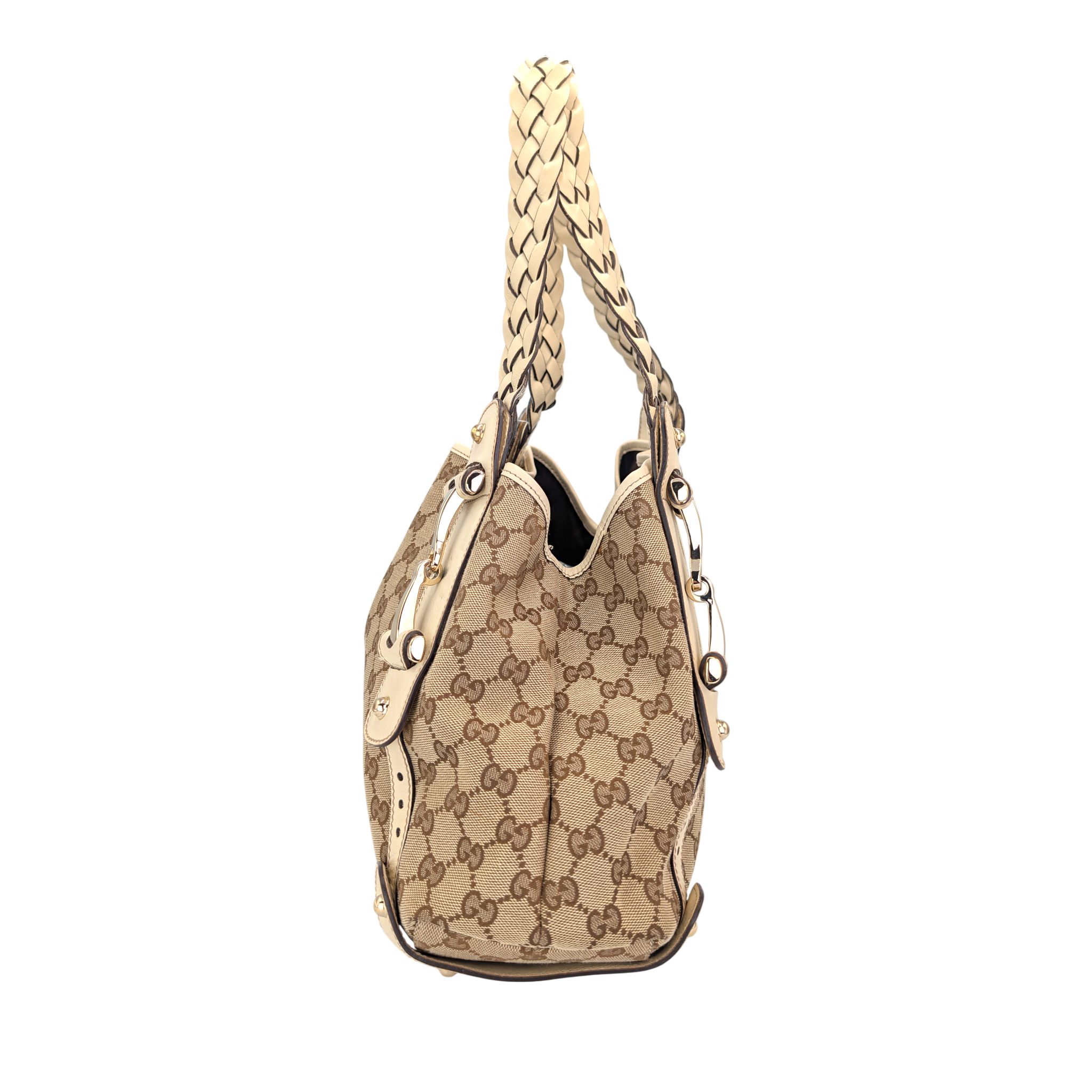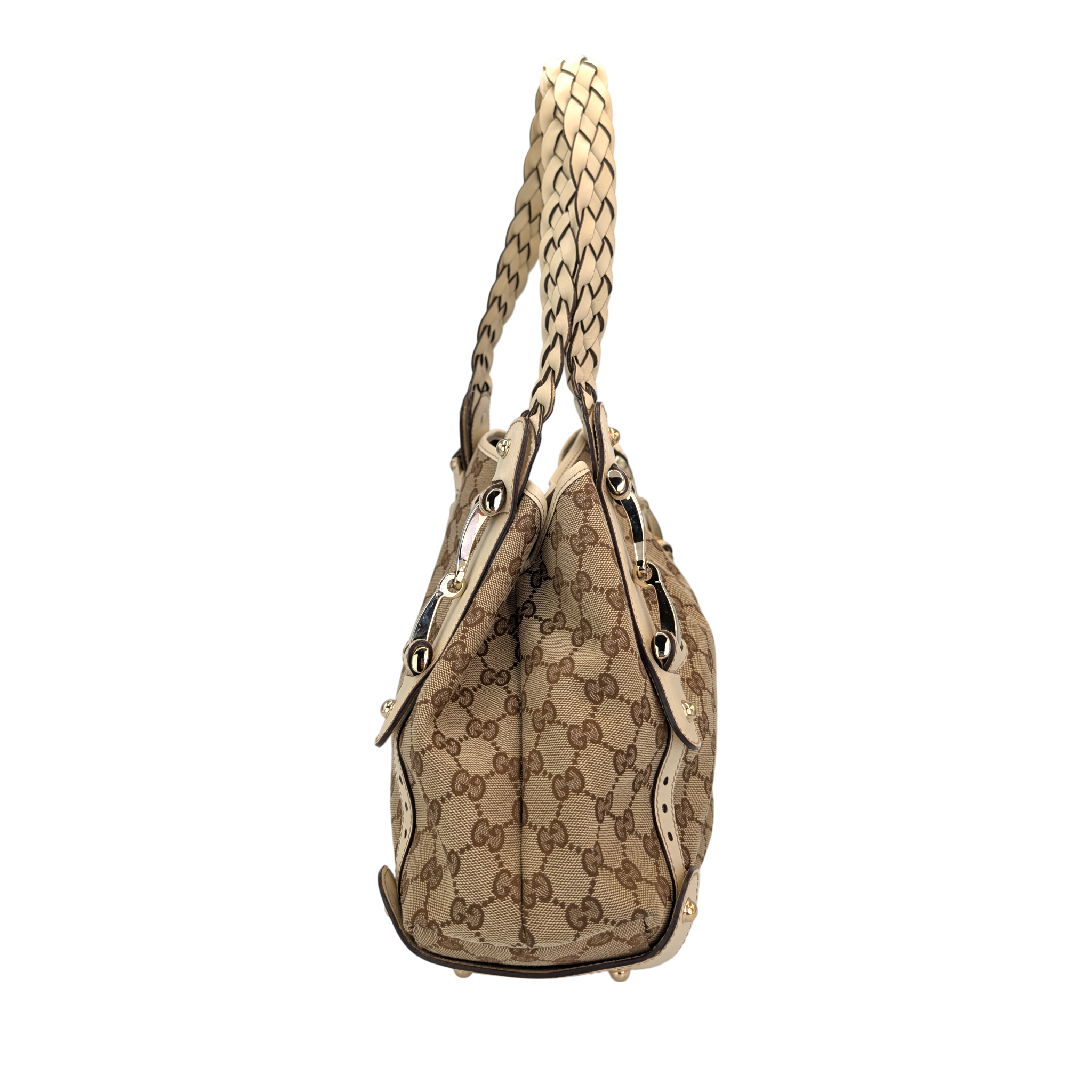 This Gucci Pelham Tote Bag is made of brown GG canvas. The Bag has brown, leather strap details and handles as well as gold rings and rivets. The top opening provides easy access to the interior. Here it has Bag with a zip compartment and slip pockets. With its flat leather shoulder straps it can Bag can be carried comfortably over the shoulder.