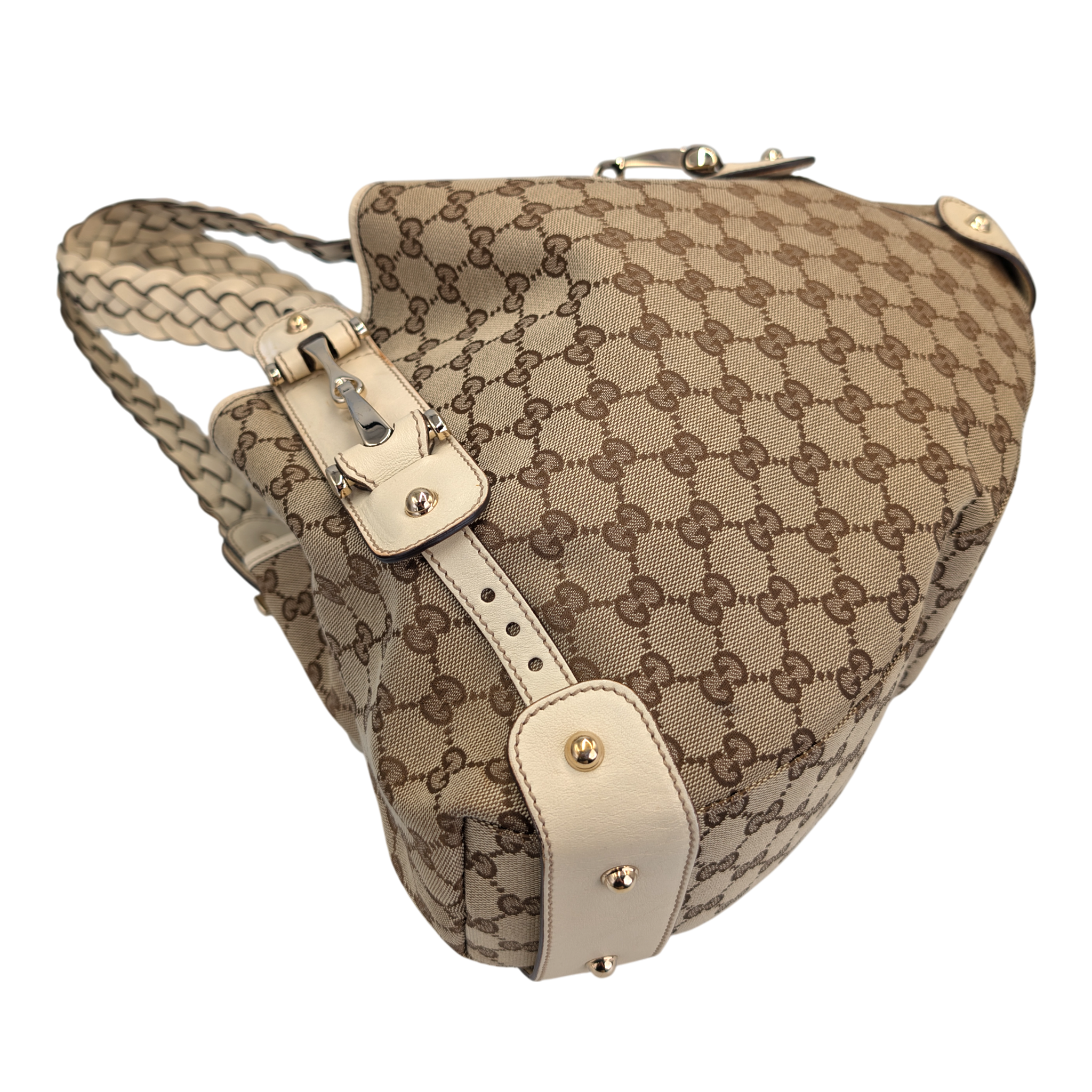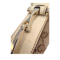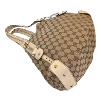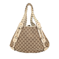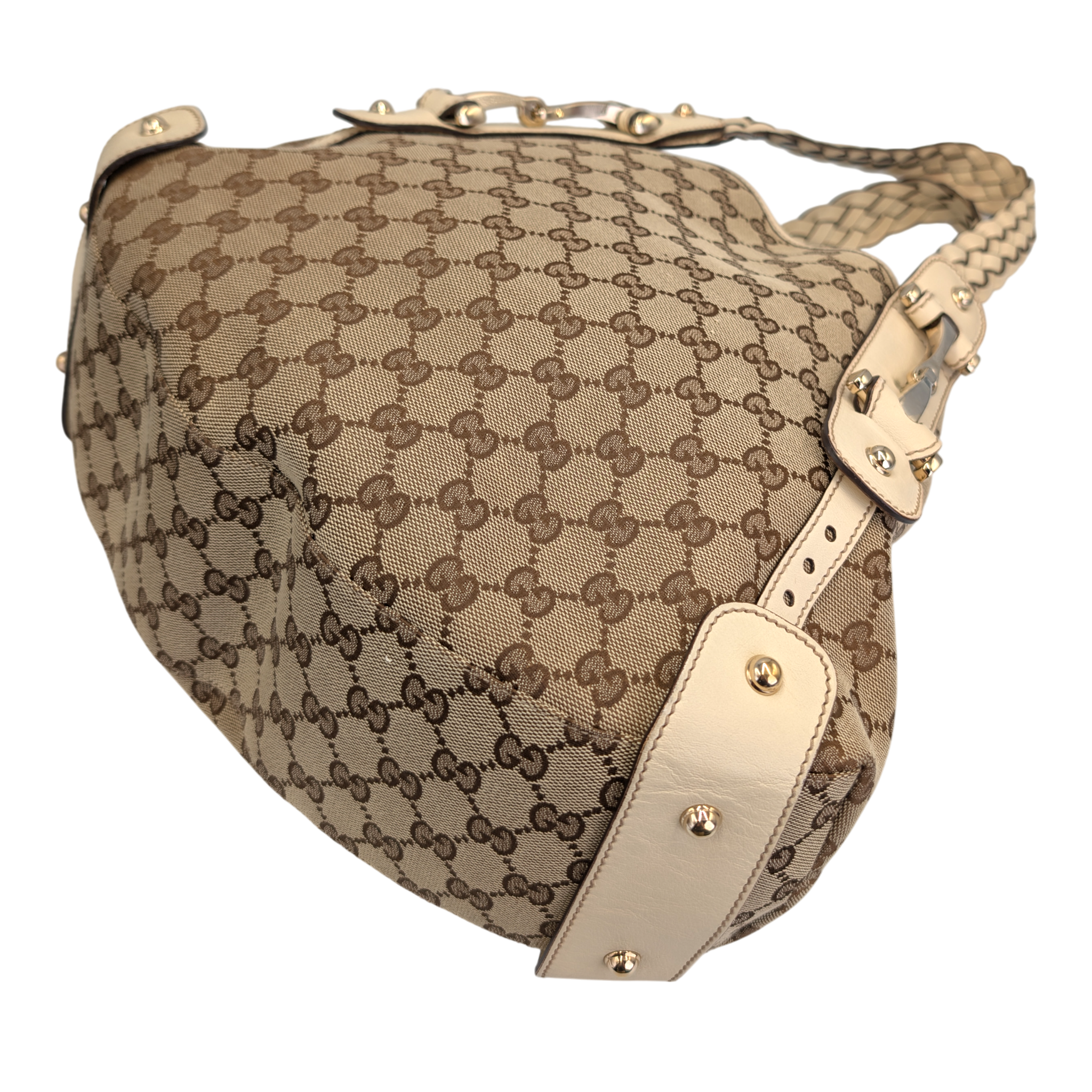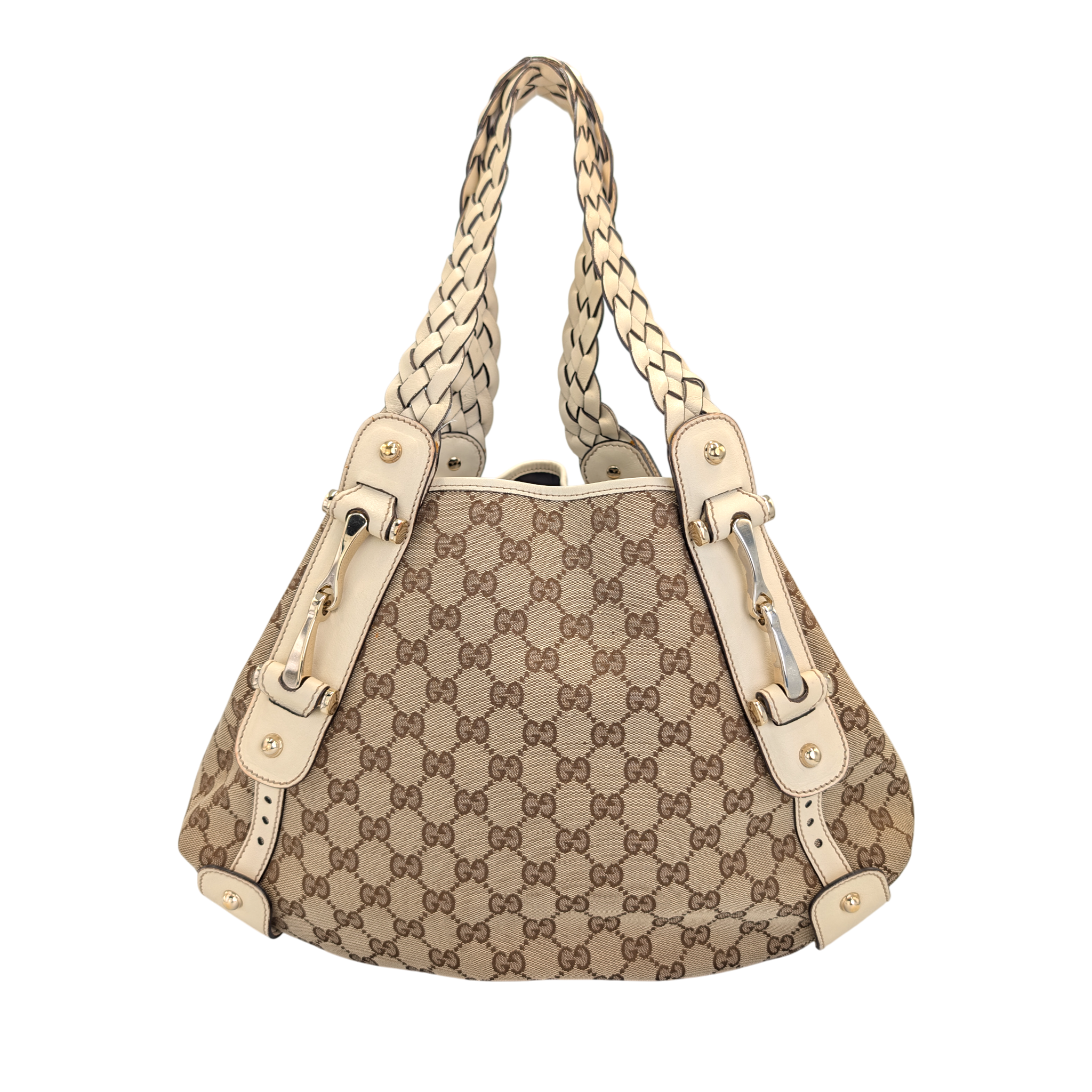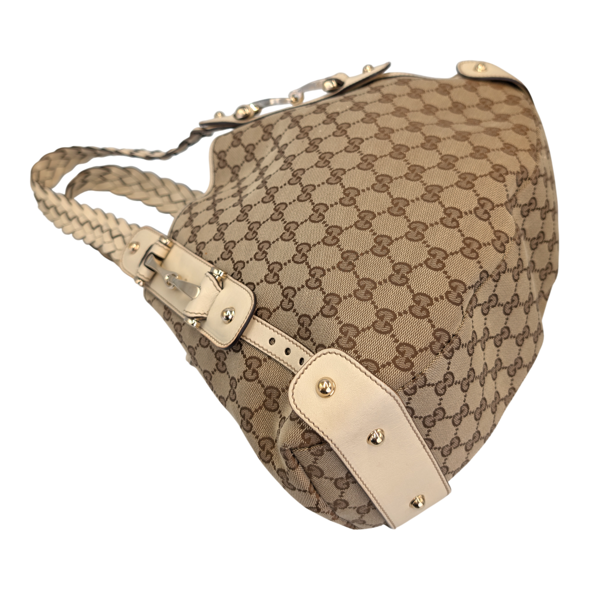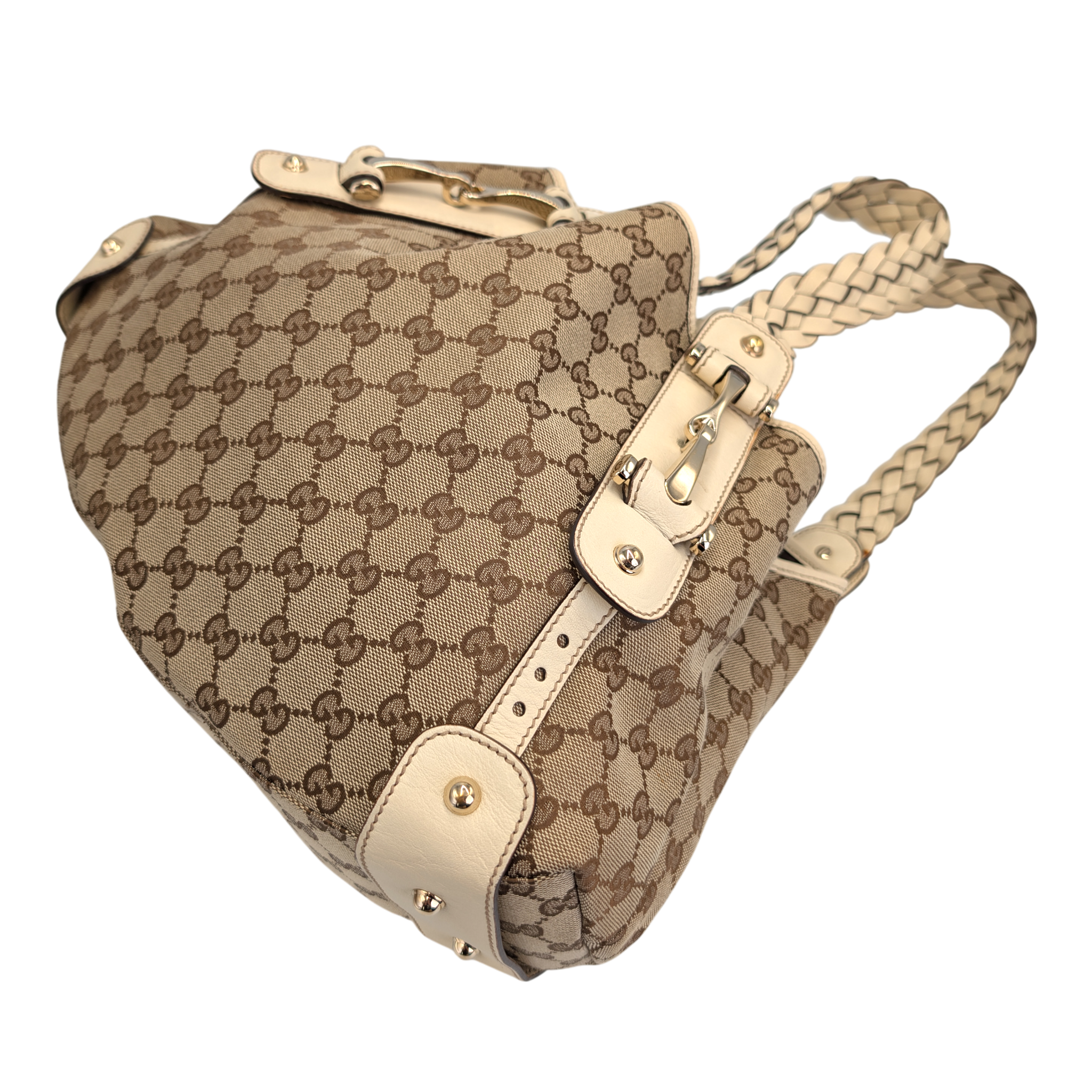 This Gucci Pelham Tote Bag is made of brown GG canvas. The Bag has brown, leather strap details and handles as well as gold rings and rivets. The top opening provides easy access to the interior. Here it has Bag with a zip compartment and slip pockets. With its flat leather shoulder straps it can Bag can be carried comfortably over the shoulder.