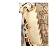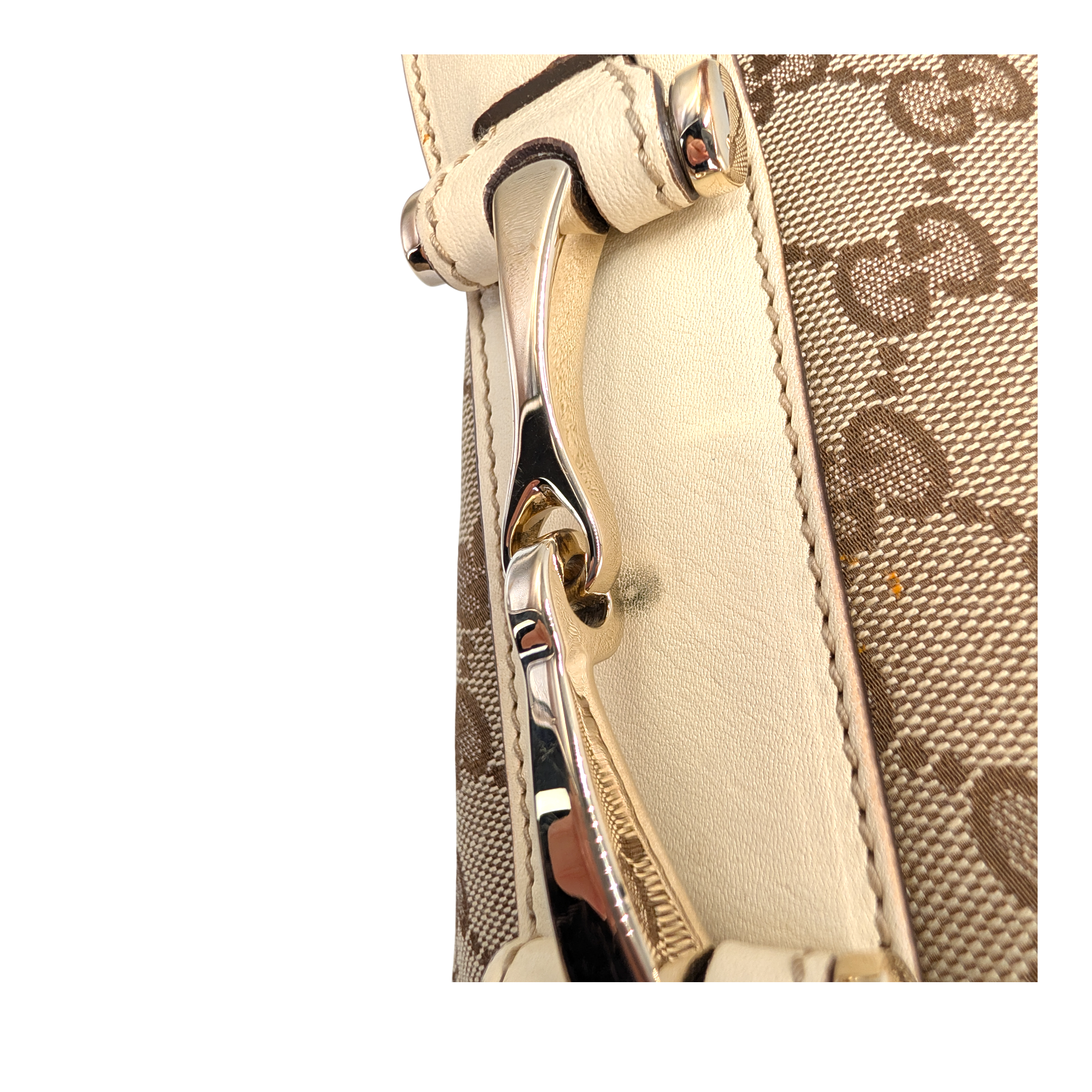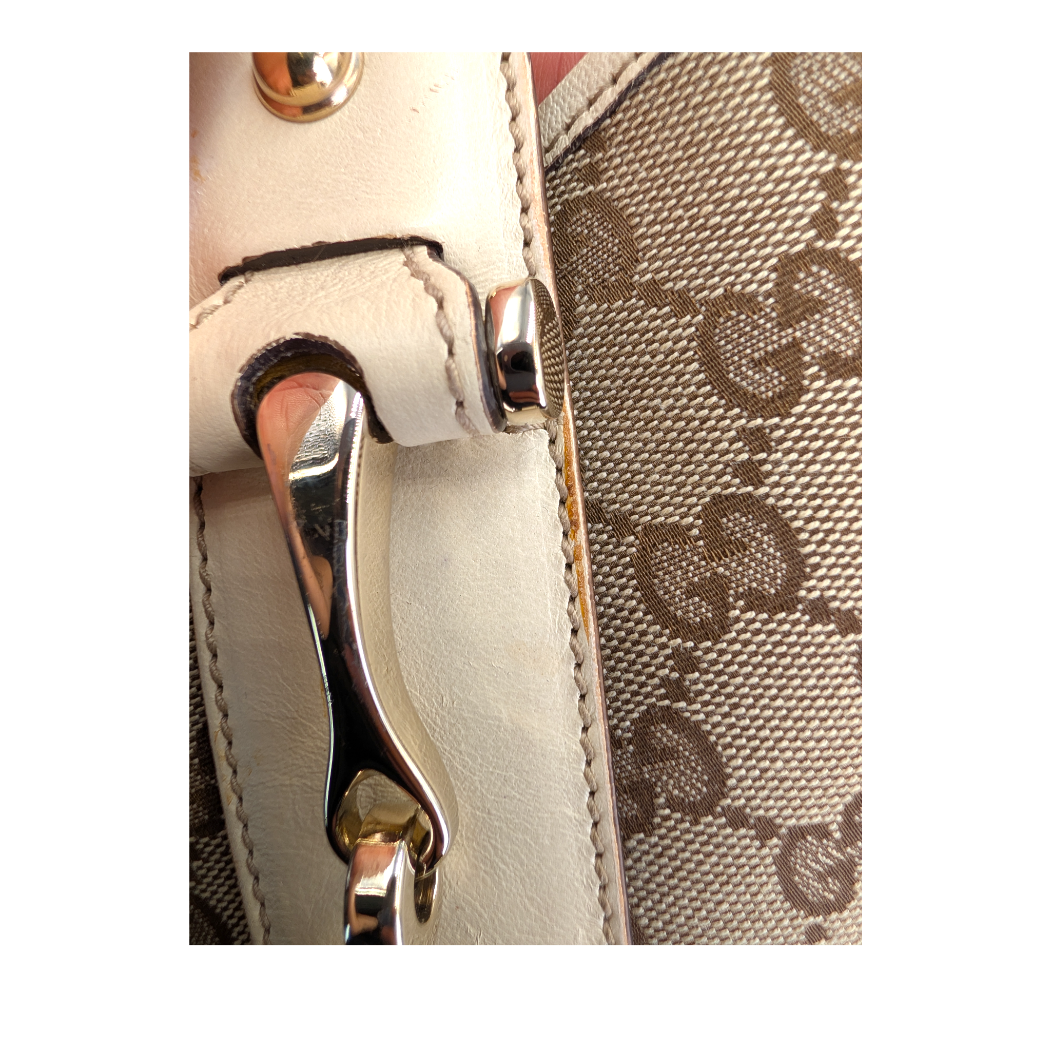 Condition: The canvas on the outside of the Bag falls a little looser, but leaves a clean and well-groomed impression. The leather trimmings and handles only have a few fine scratches. The leather and canvas show only minor abrasion on the lower corners. The gold rivets have a few fine scratches on the metal. The interior fabric is clean.