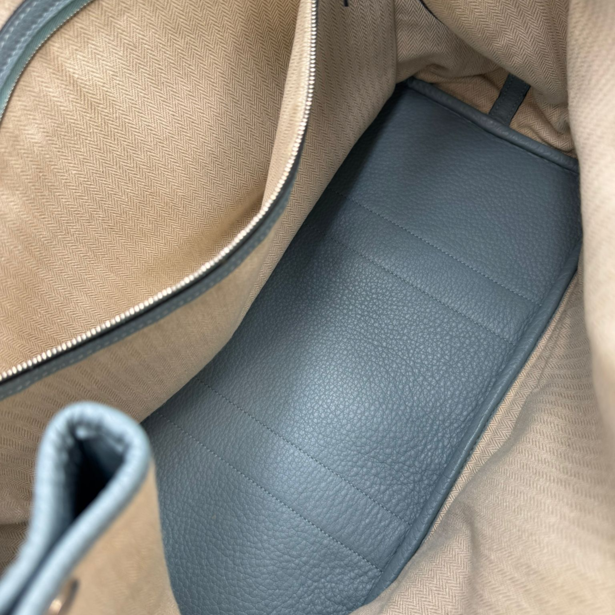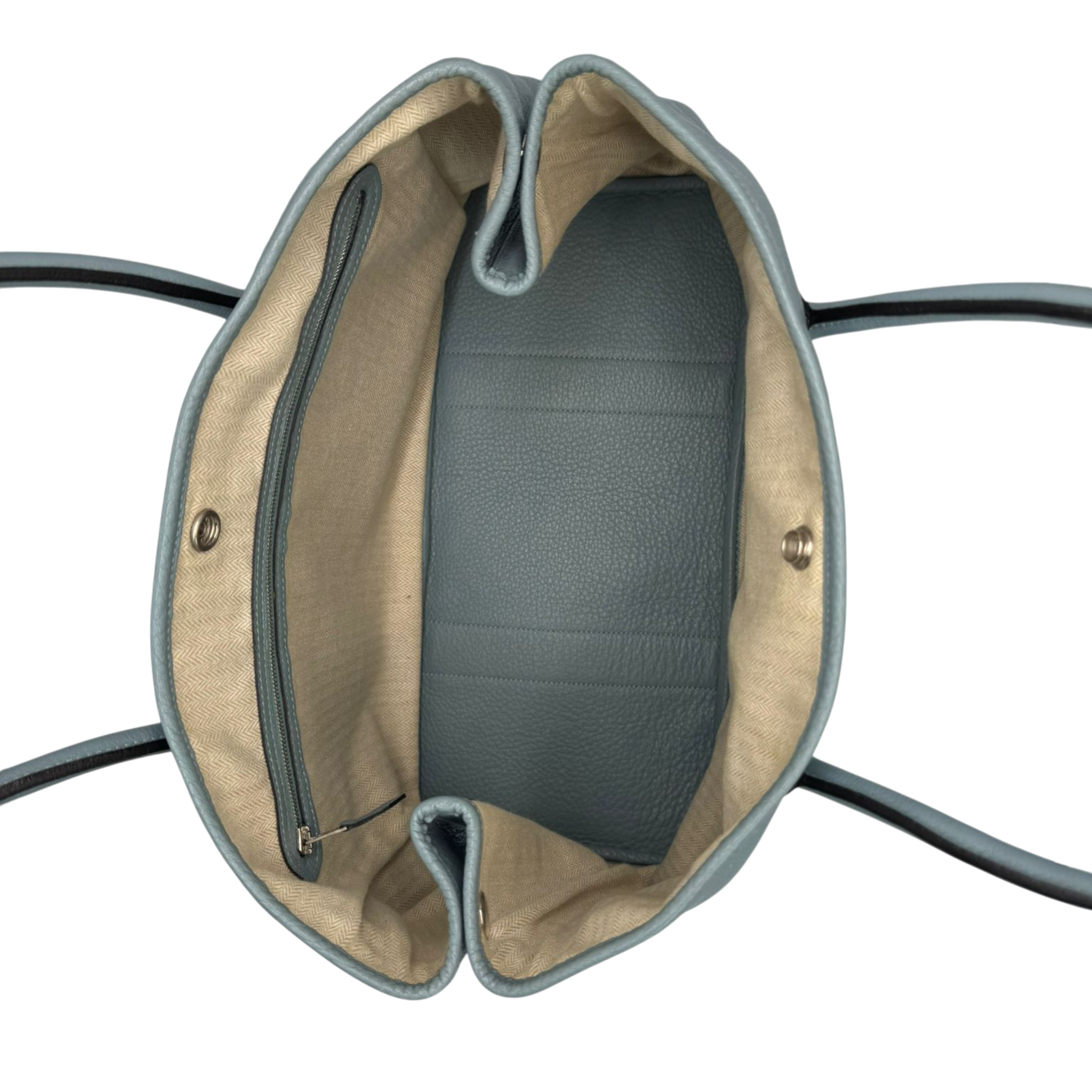 In this version, the Bag is presented in an elegant light blue, a classic Hermès color with a subtle freshness. The clear, timeless silhouette underlines the understated character of the color and makes the model versatile to combine. The open shape with press stud fastening allows quick access, while the sturdy leather handles can be carried comfortably in the hand or over the arm. Subtle palladium hardware harmoniously complements the design.