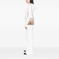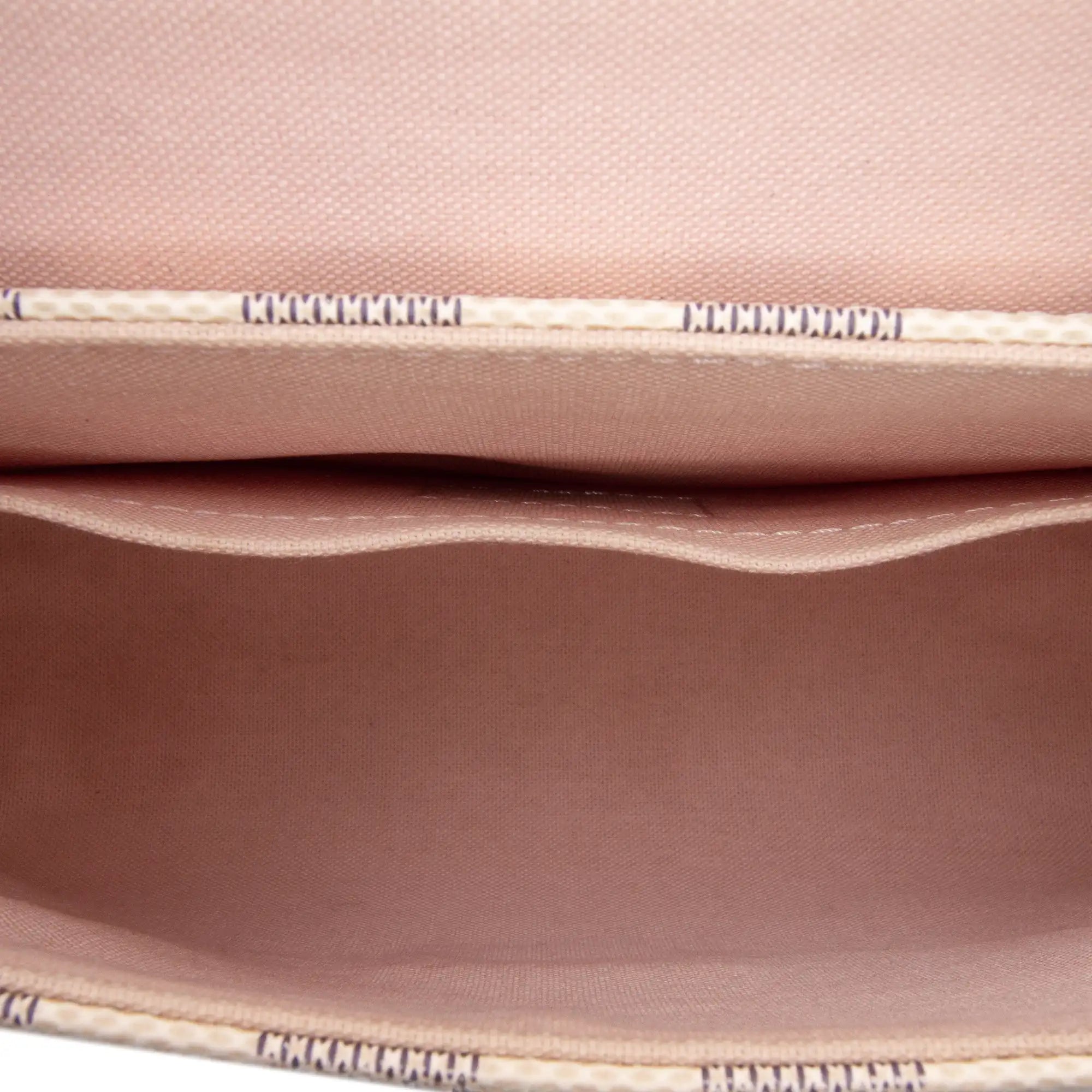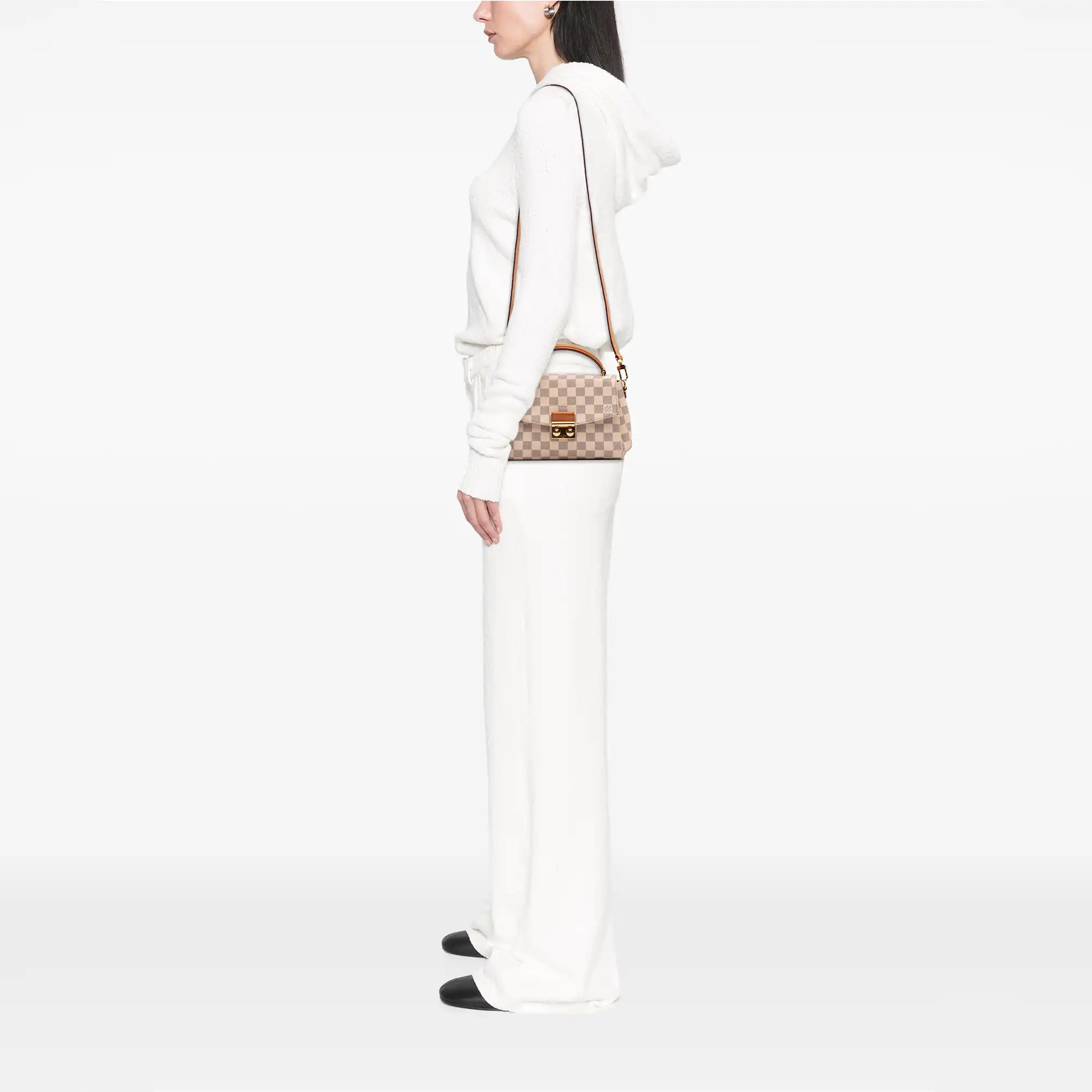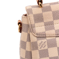 This beautiful Louis Vuitton Croisette Top Handle Bag is made from white Damier Azur canvas. The Bag has light brown trimmings and a handle made of Vachetta leather as well as gold details. The front flap is closed with a gold push lock closure. In the interior it has Bag a pocket. The Bag Can be carried by hand or loosely over the shoulder and crossbody with a removable shoulder strap.