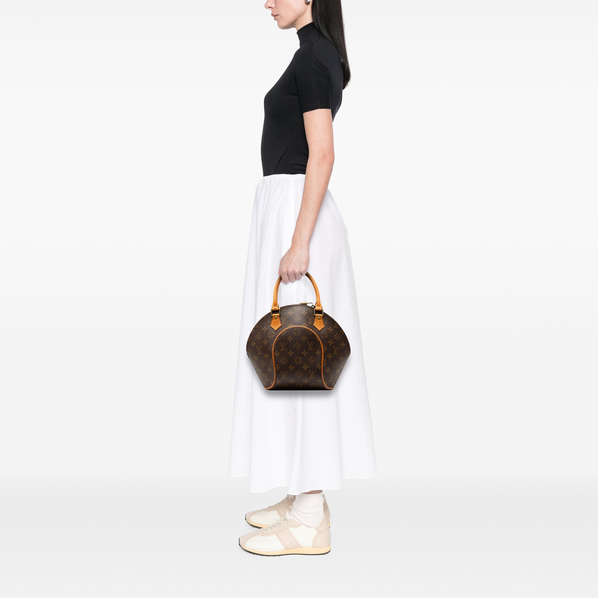 The Louis Vuitton Monogram Ellipse PM is a compact handbag with a characteristic, curved silhouette and clearly structured shape. The model is made from Monogram canvas and is accentuated by trims in natural vachetta leather, which emphasizes the classic Louis Vuitton look. Rounded vachetta handles ensure elegant lines and a comfortable grip.