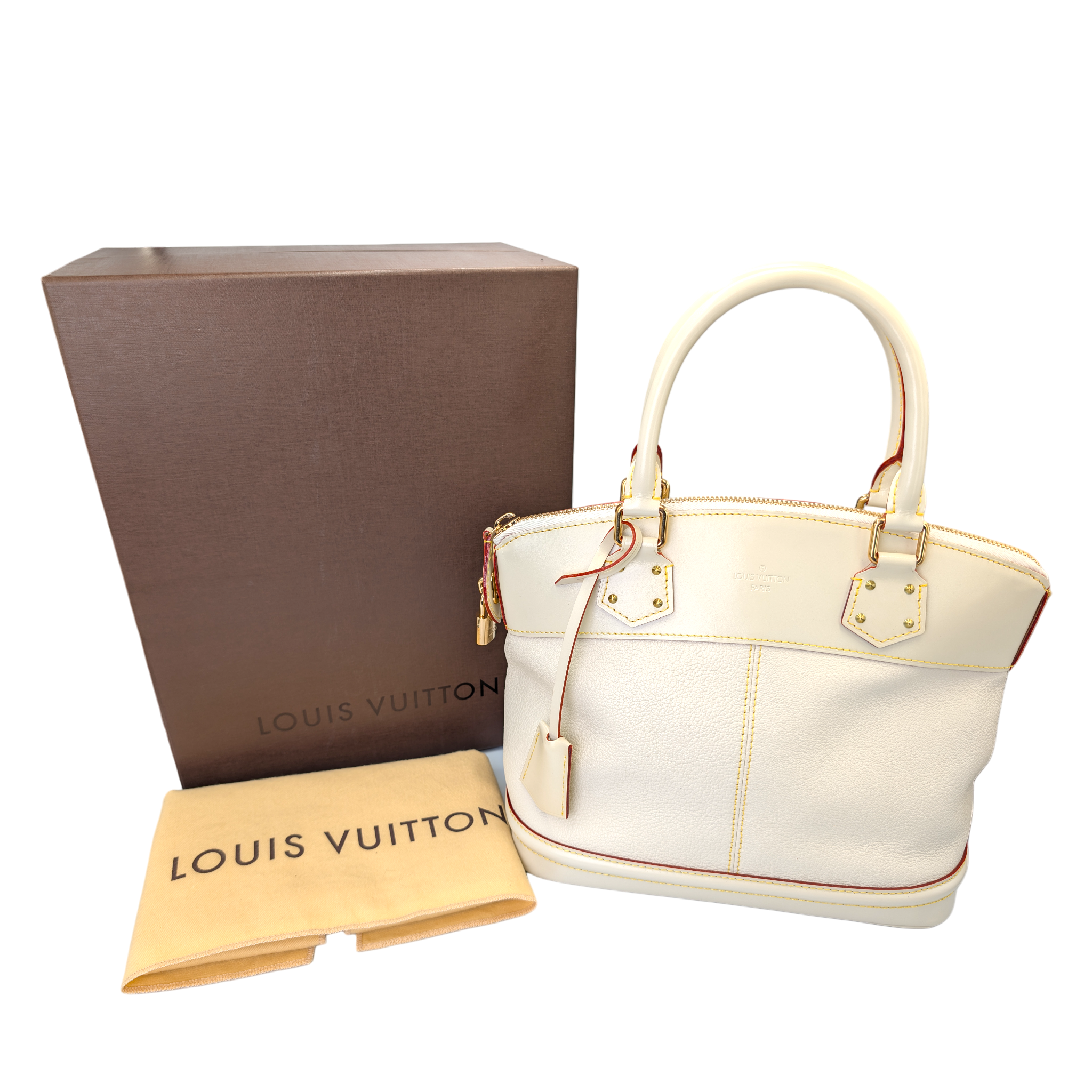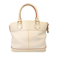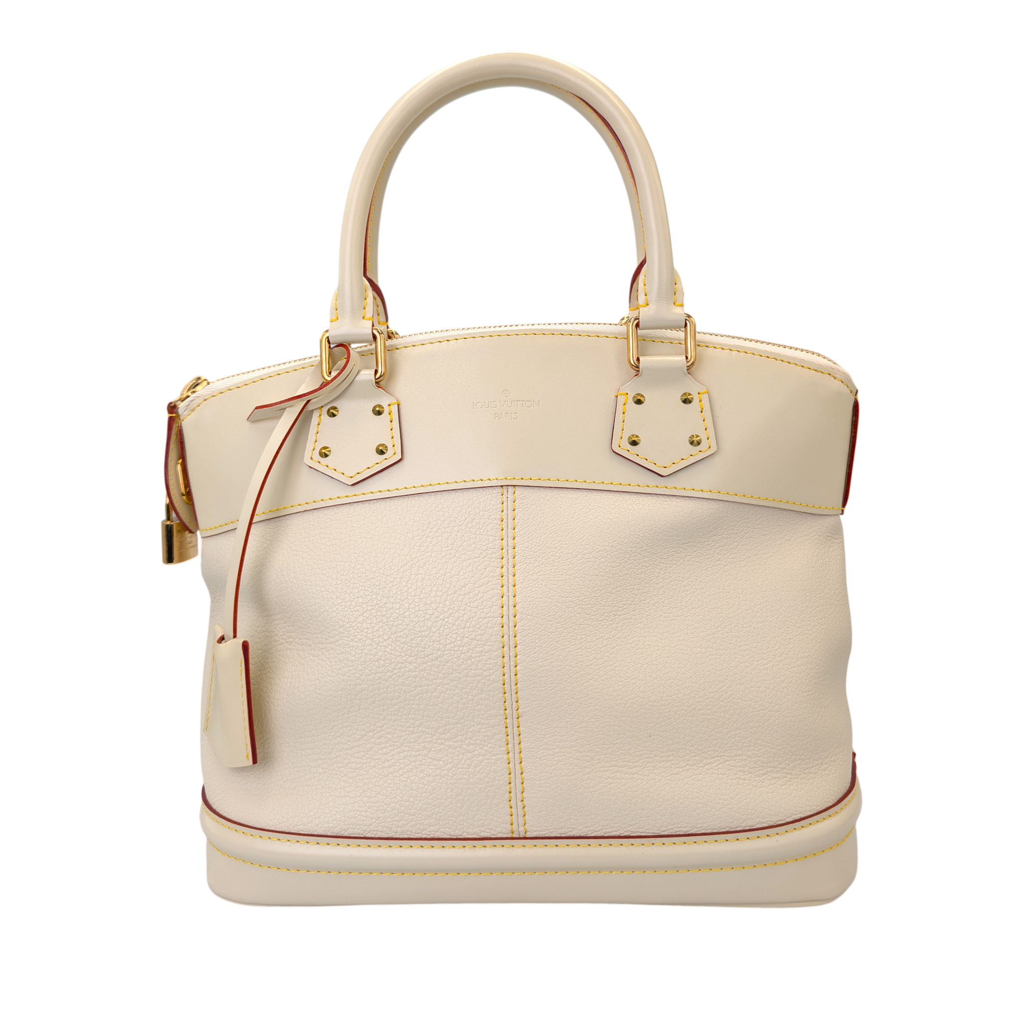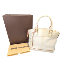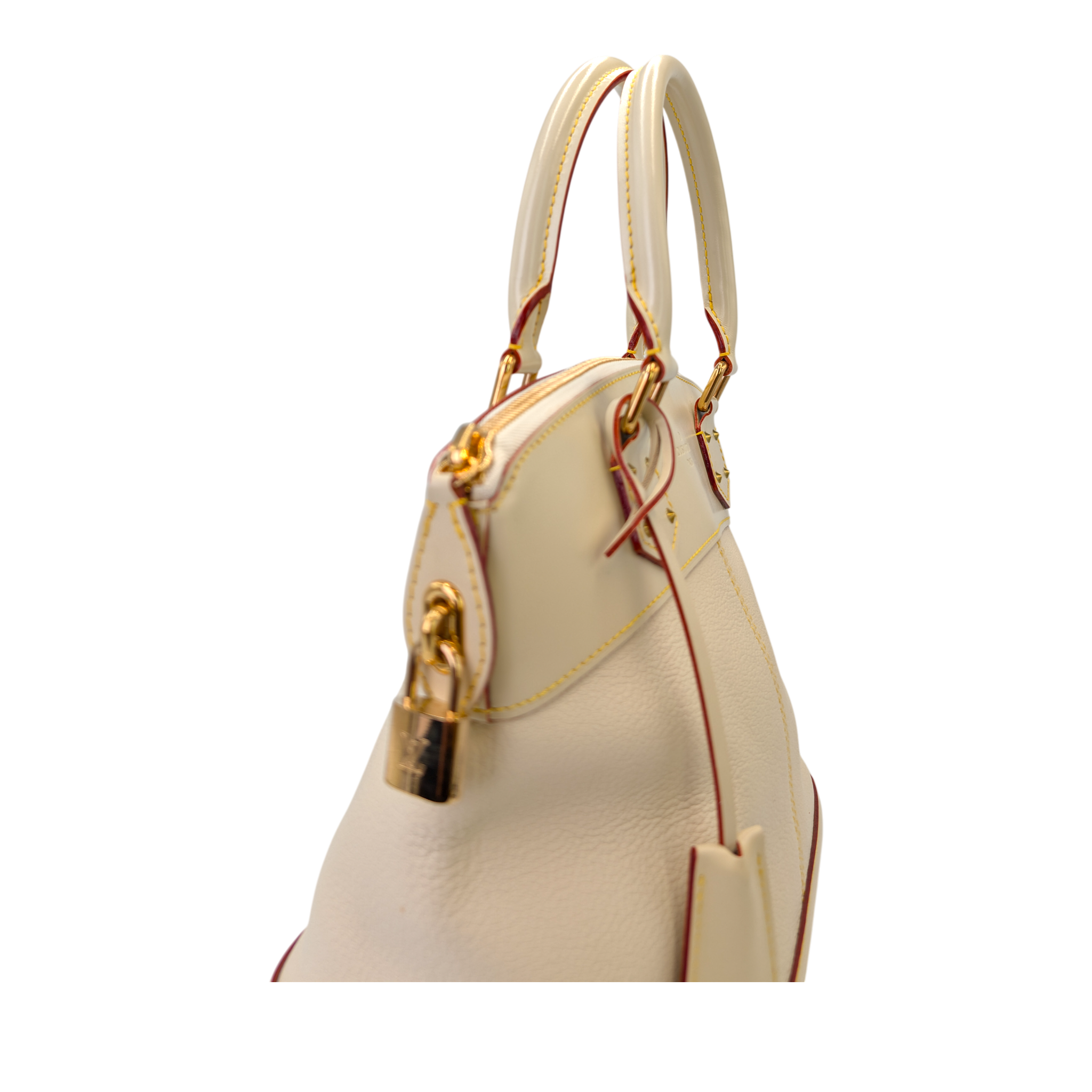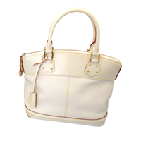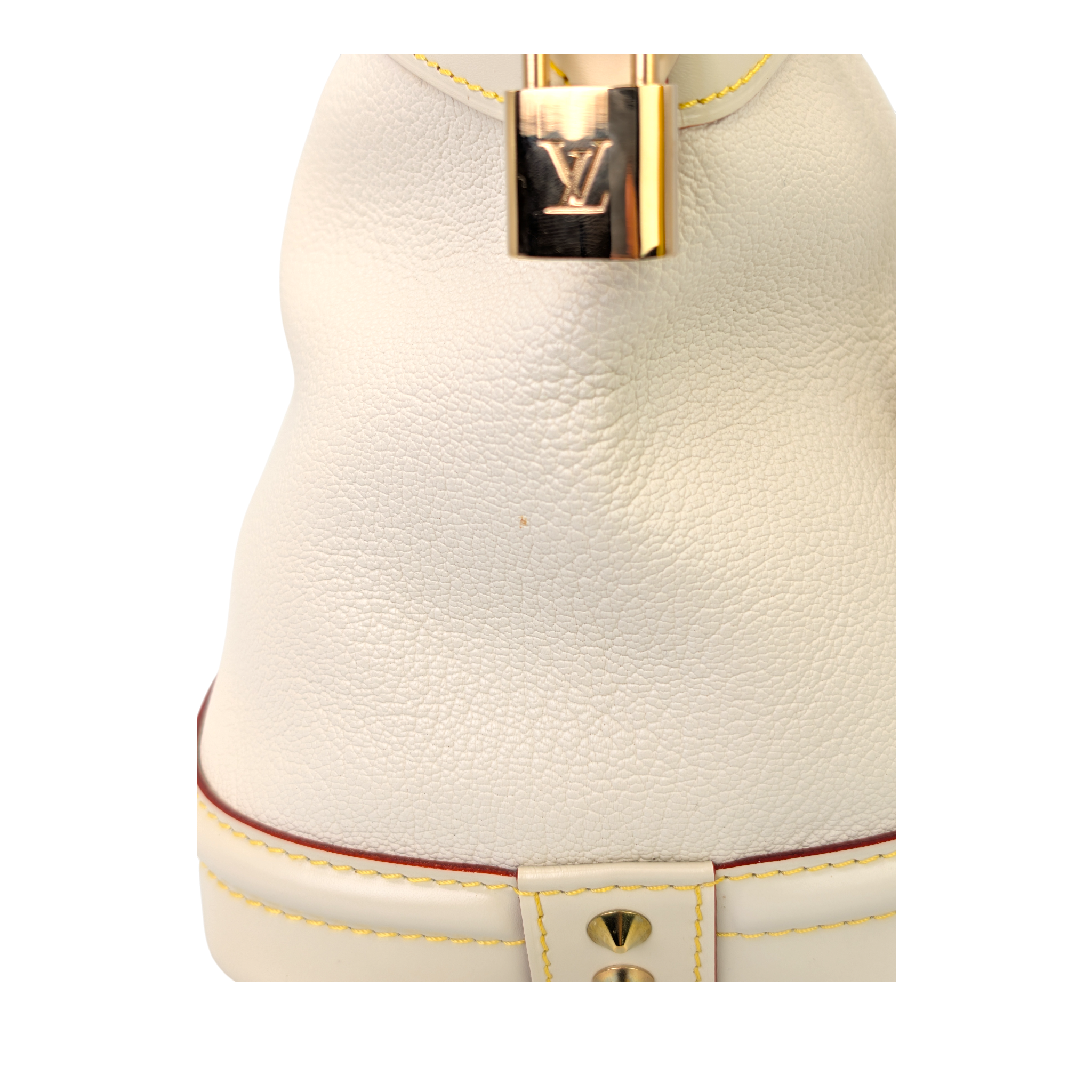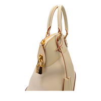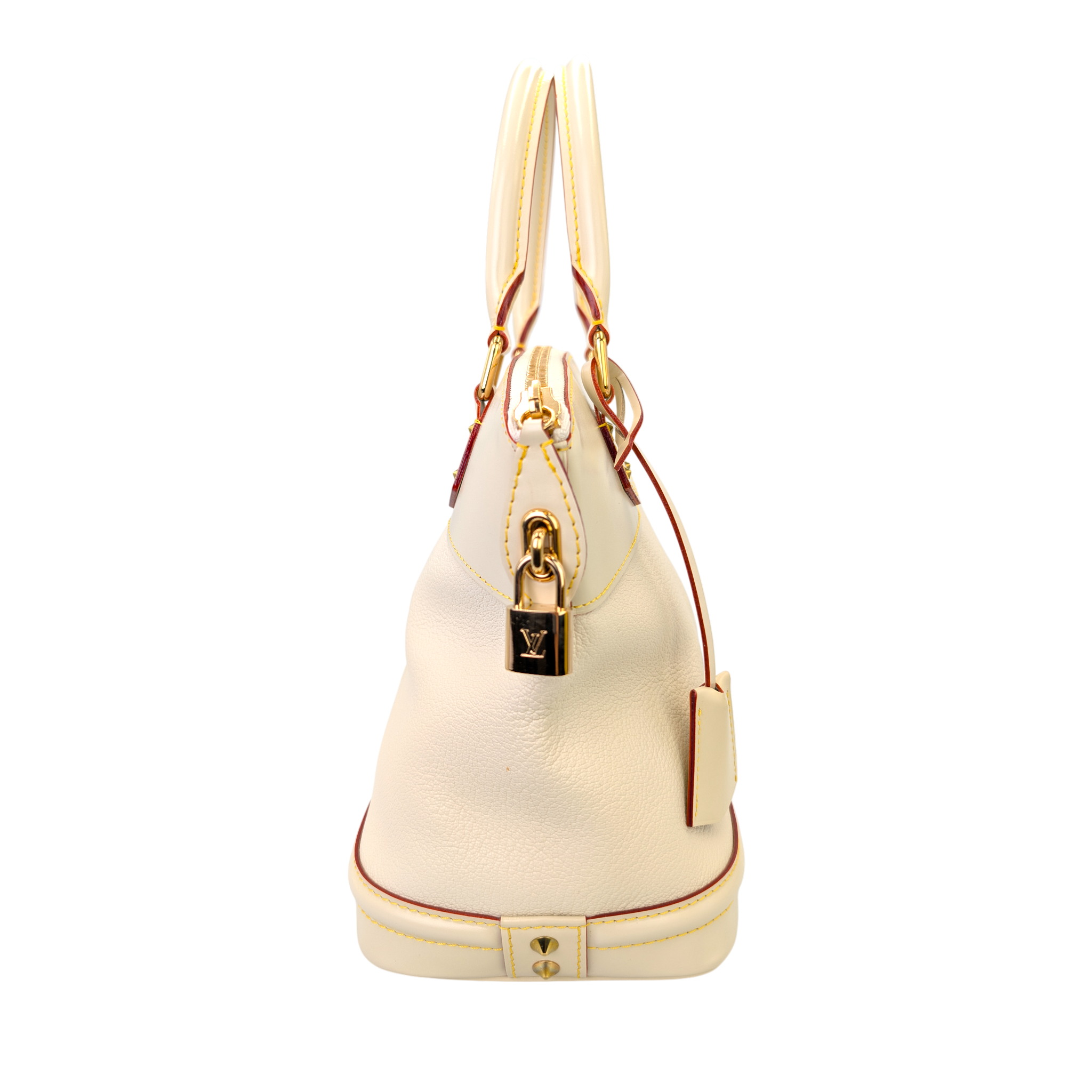 This Louis Vuitton Lockit PM is crafted from off-white Suhali leather and features gold detailing, rolled leather handles, a zip top opening and an interior zip pocket. The zipper can also be secured with a small padlock and can be carried in the hand or arm.