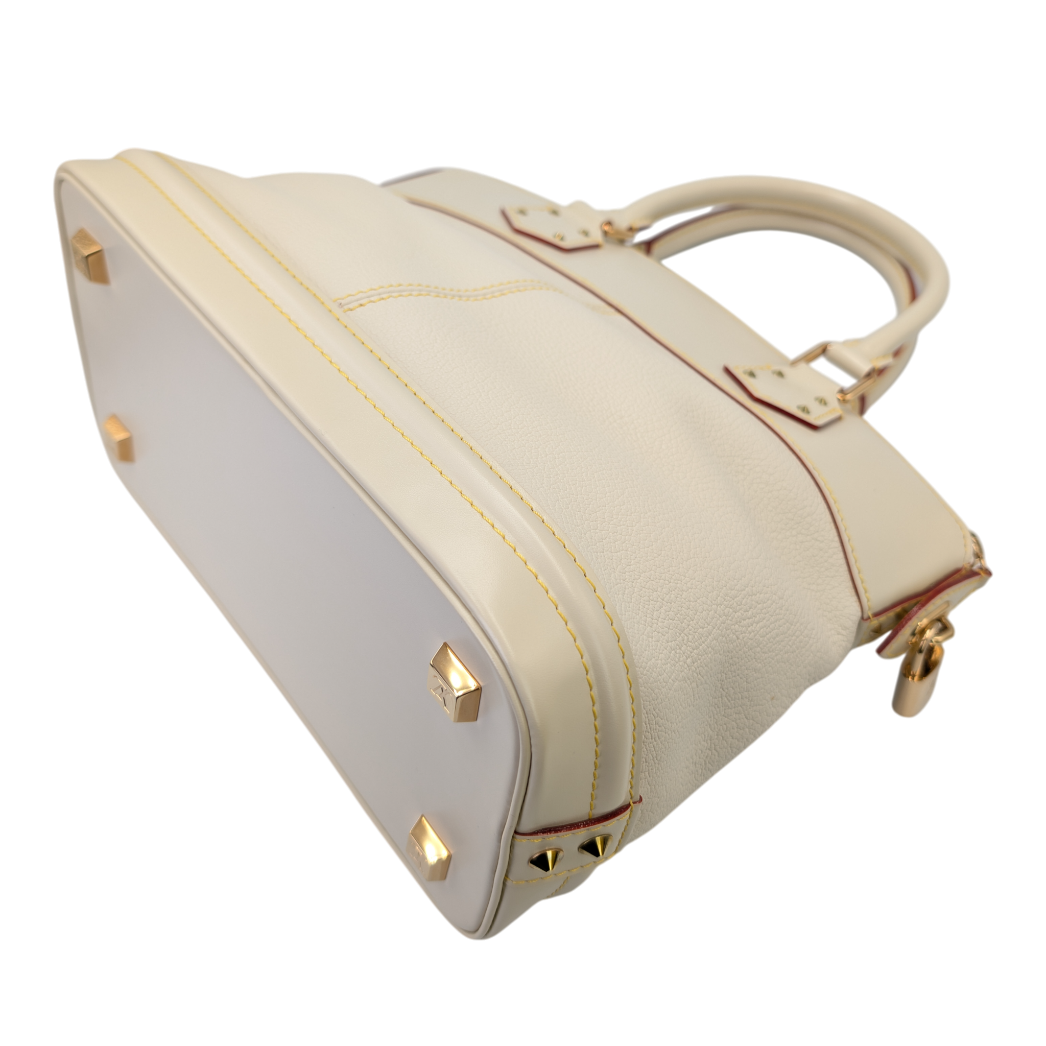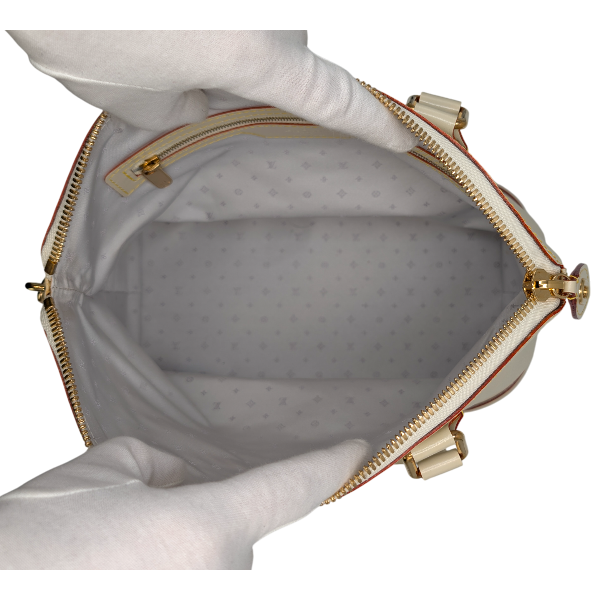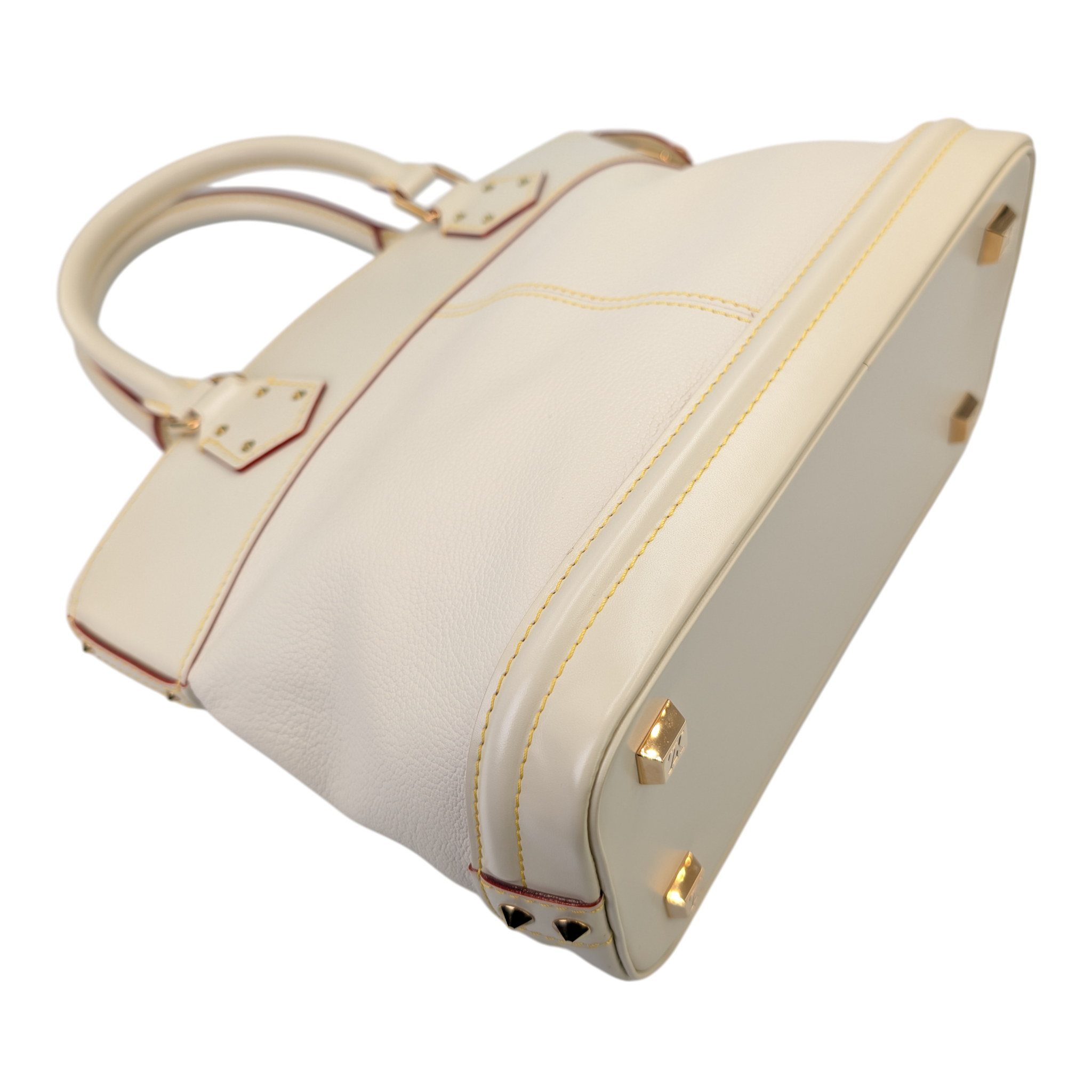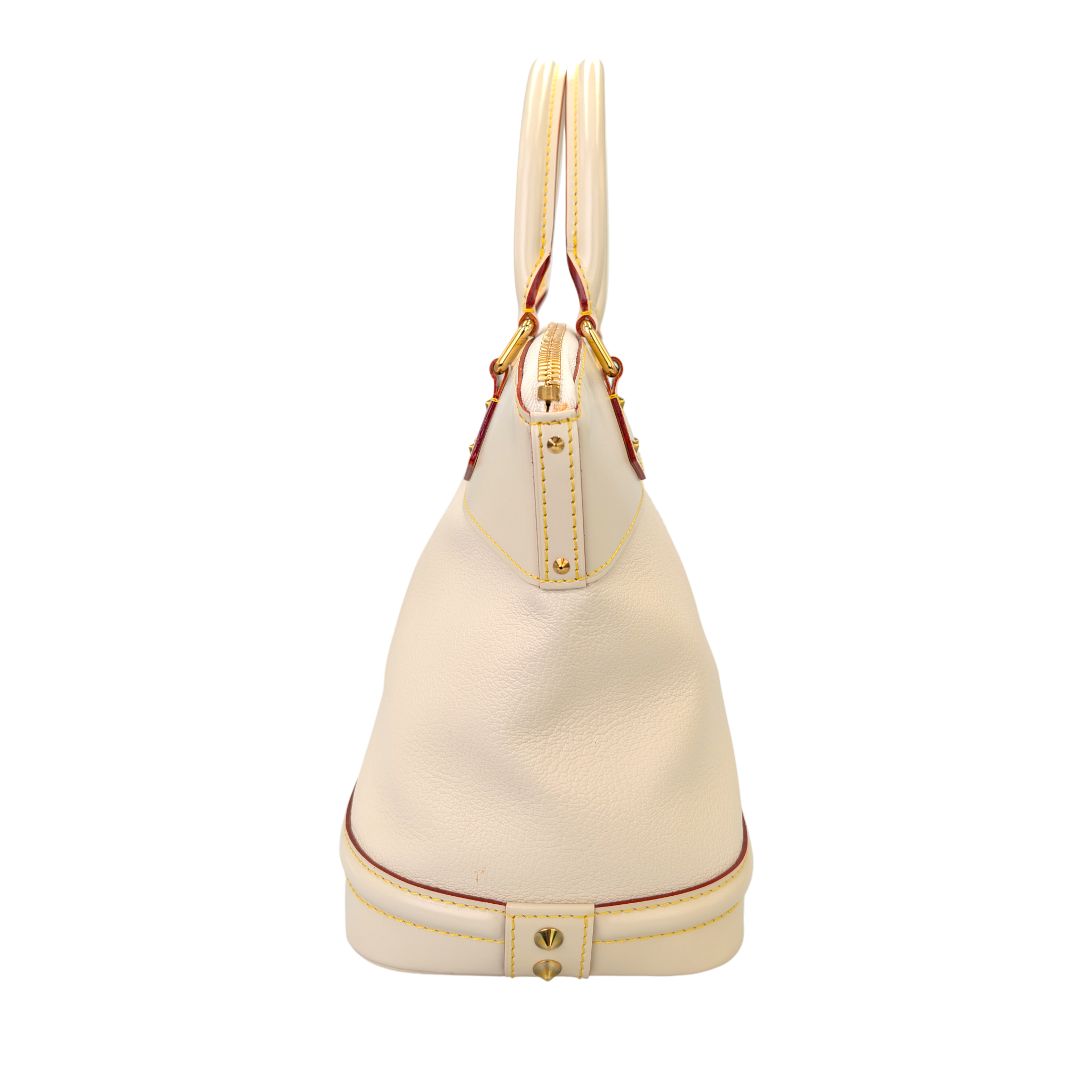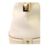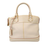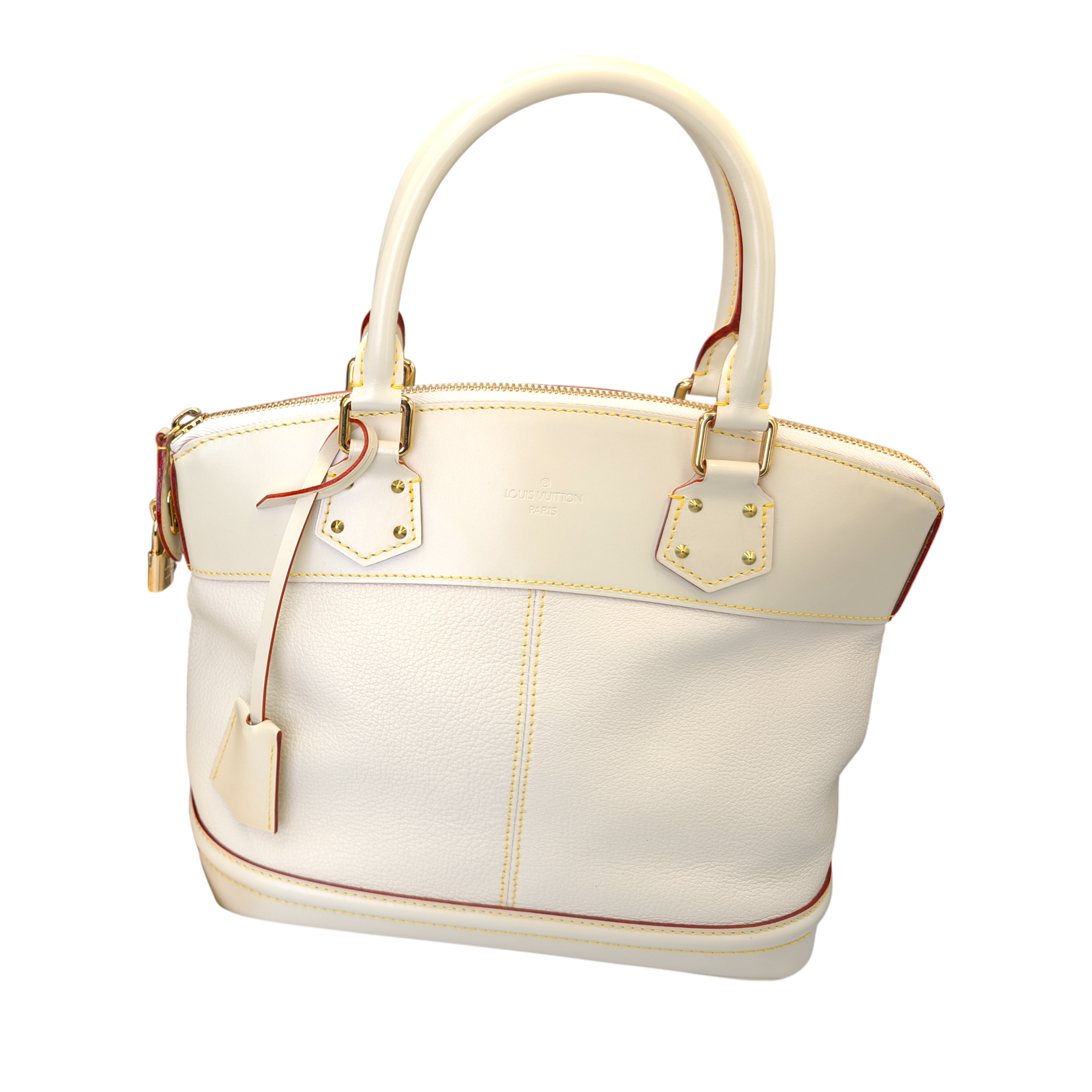 This Louis Vuitton Lockit PM is crafted from off-white Suhali leather and features gold detailing, rolled leather handles, a zip top opening and an interior zip pocket. The zipper can also be secured with a small padlock and can be carried in the hand or arm.