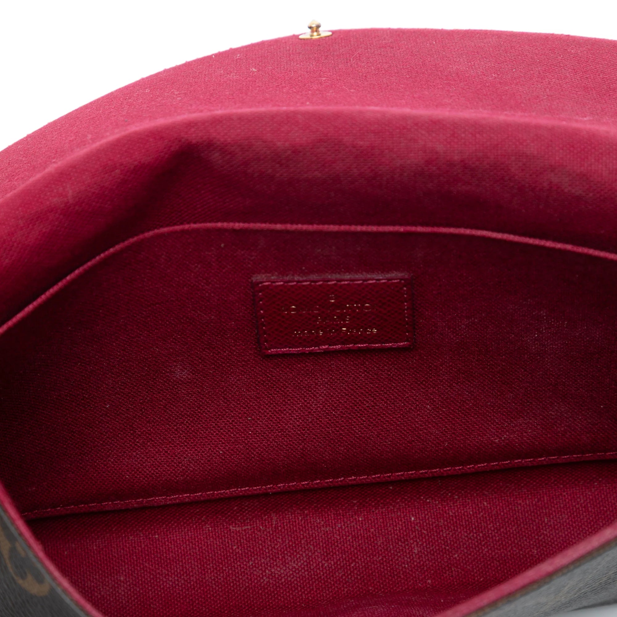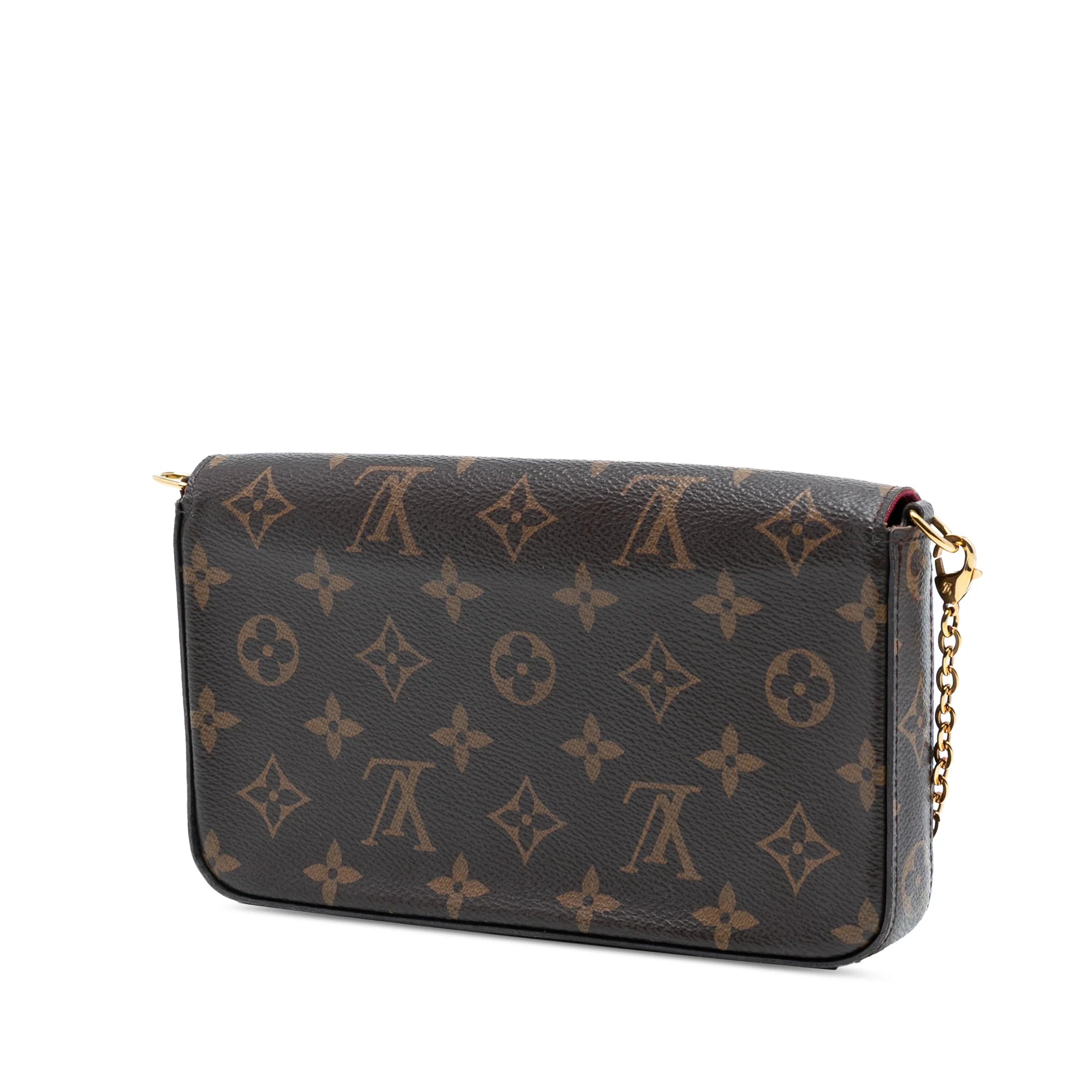 This Louis Vuitton Pochette Félicie is made from Monogram canvas. The Bag Can either be carried in the hand like a clutch or worn crossbody thanks to the removable gold-colored chain strap. It closes with a snap fastener and has pockets on the interior.