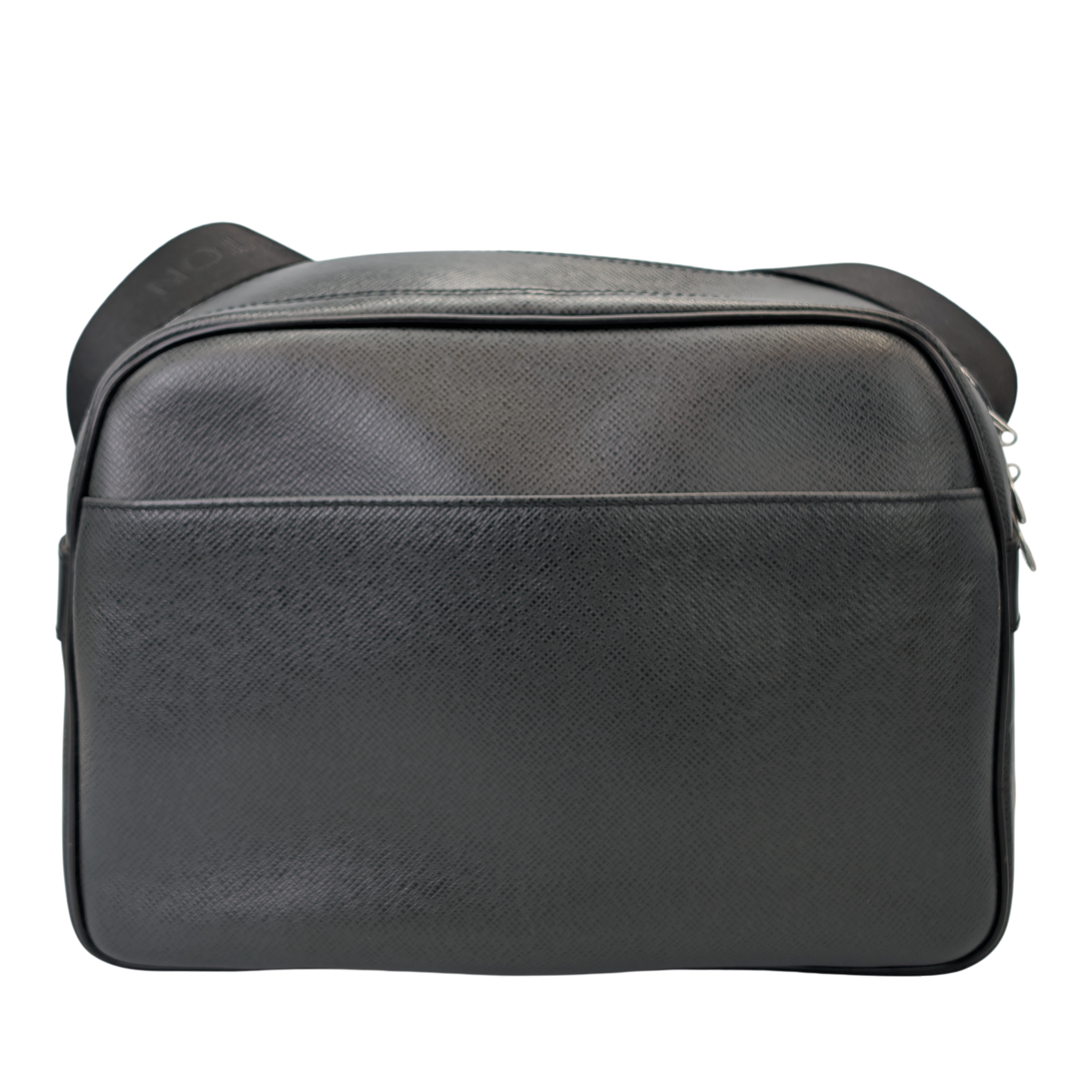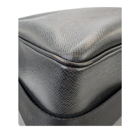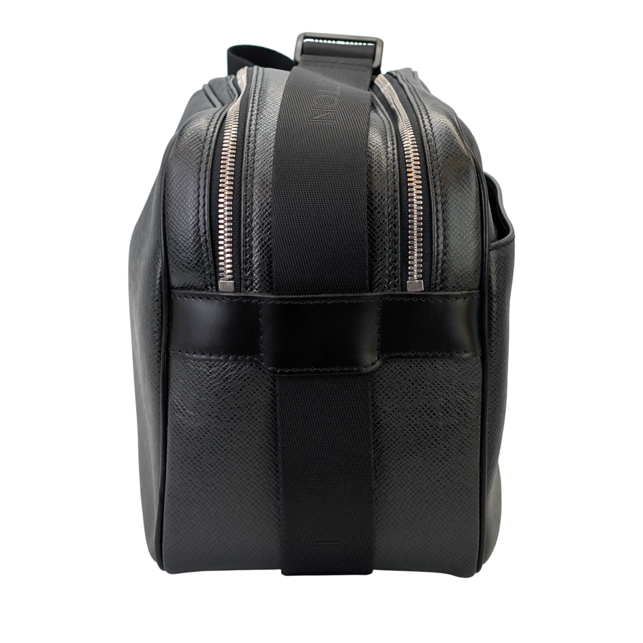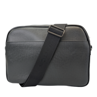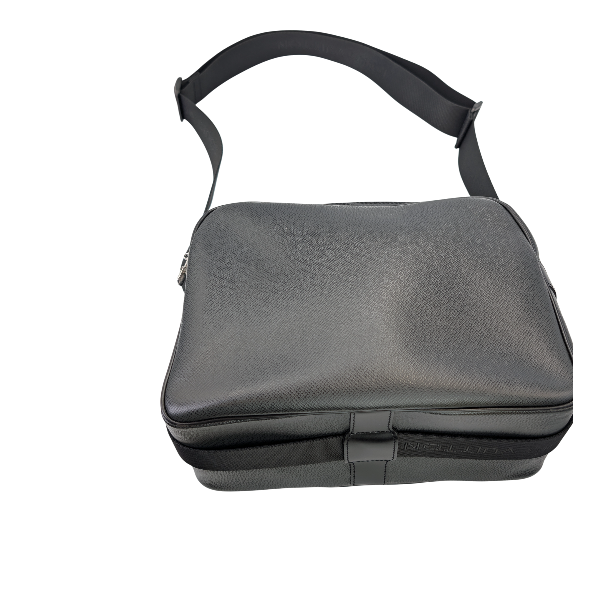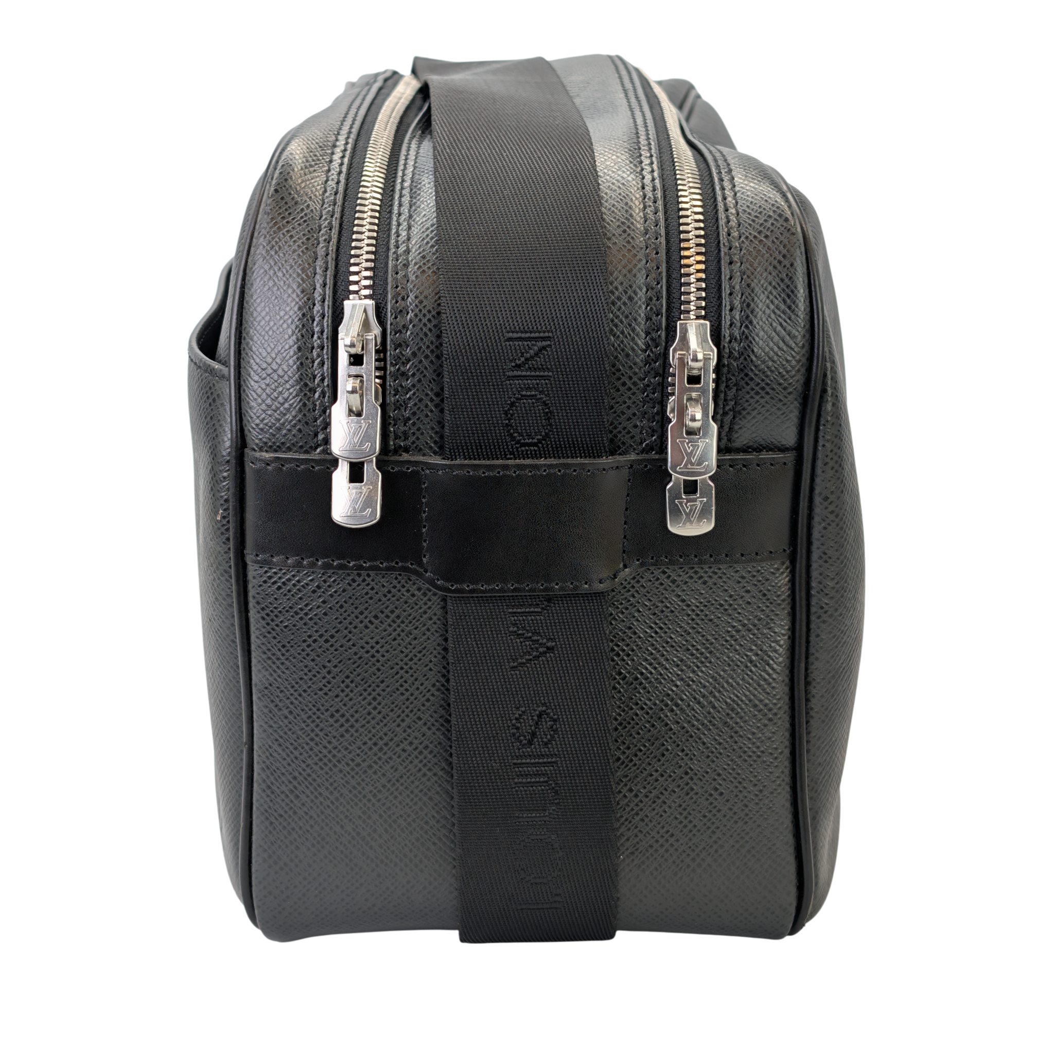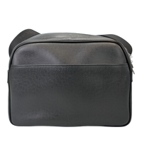 This Louis Vuitton Reporter PM Bag is made of black Taiga leather. This durable calf leather has a fine, natural-looking structure, which is achieved by embossing the leather. There is a large, open outside compartment on the front. Two different compartments can be opened using the two double zippers on the top edge. On the inside it has Bag an open pocket. The Bag has a comfortable, adjustable canvas shoulder strap. The model was inspired by photographers' bags.