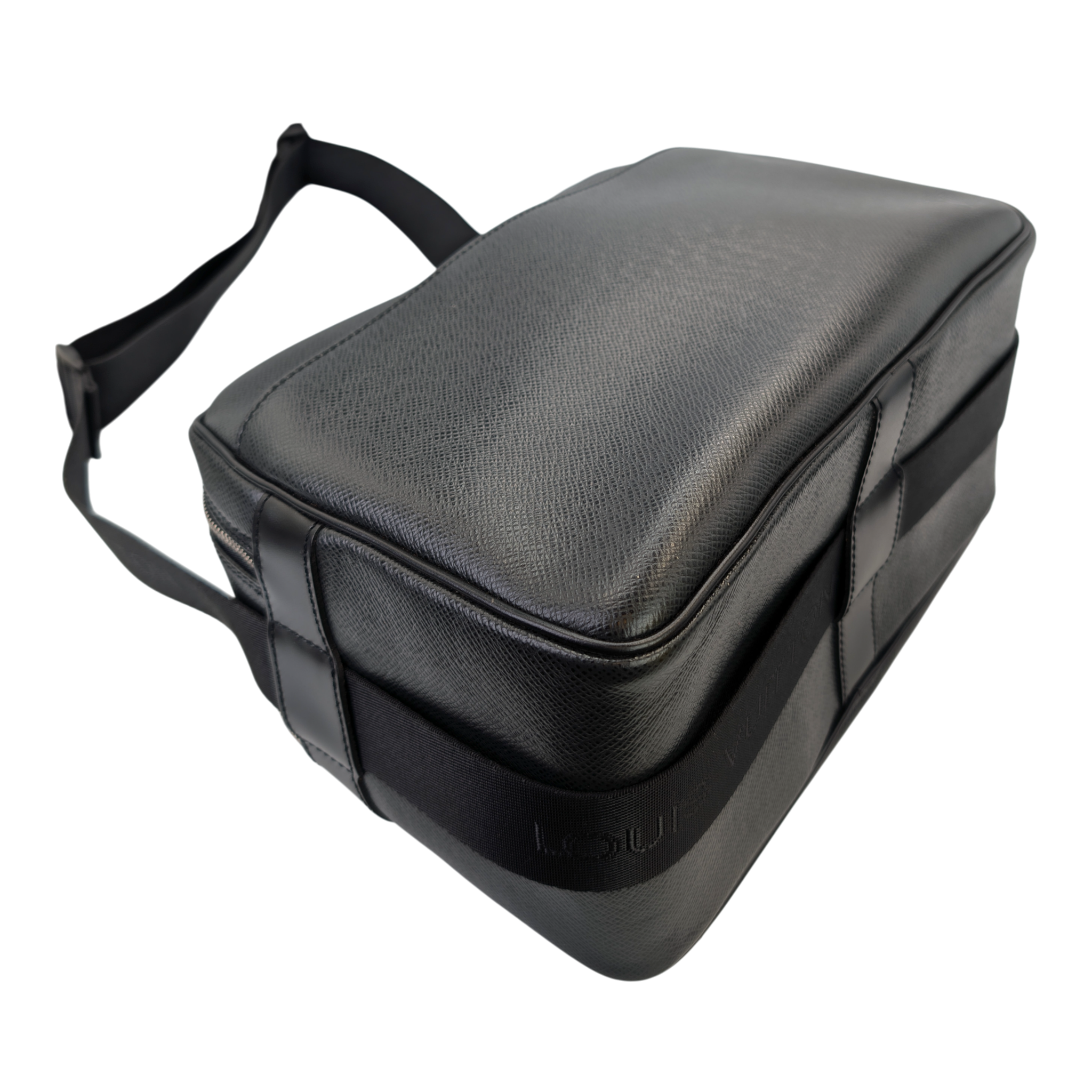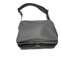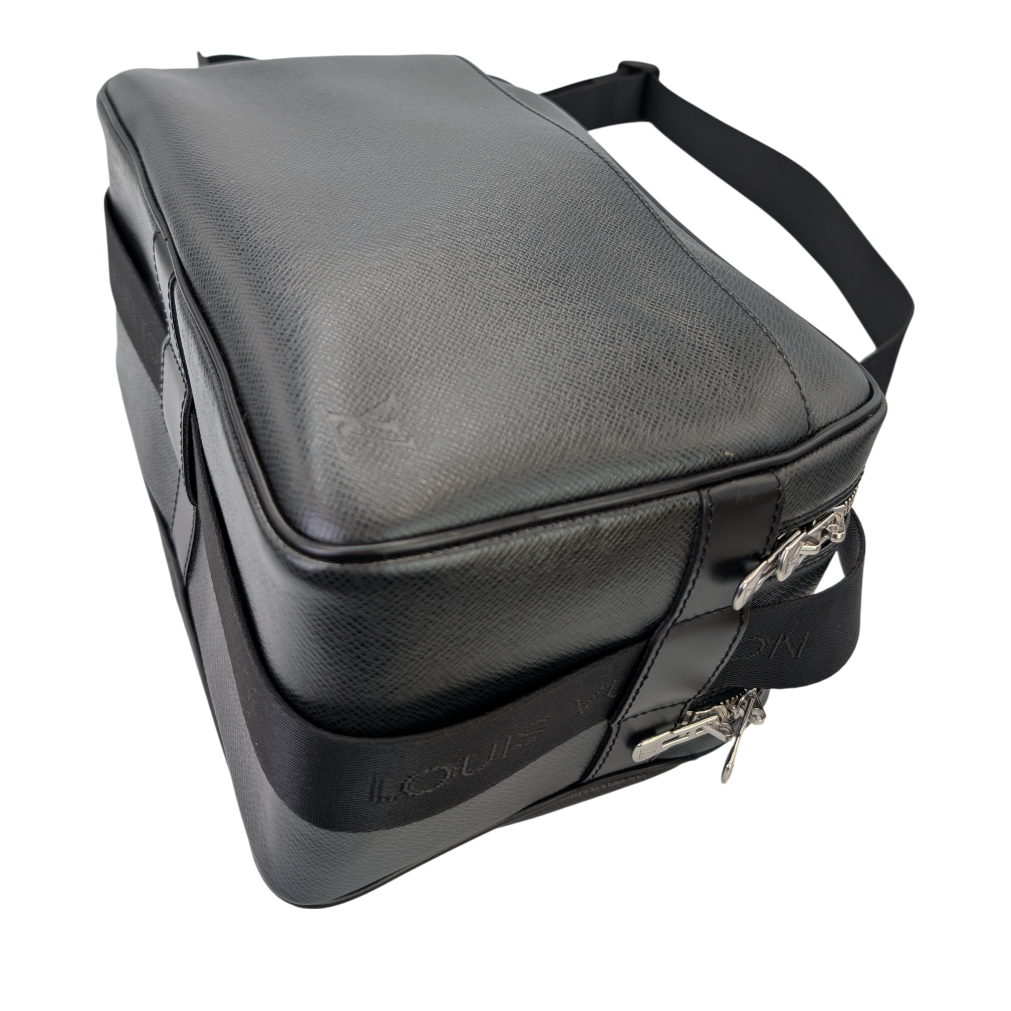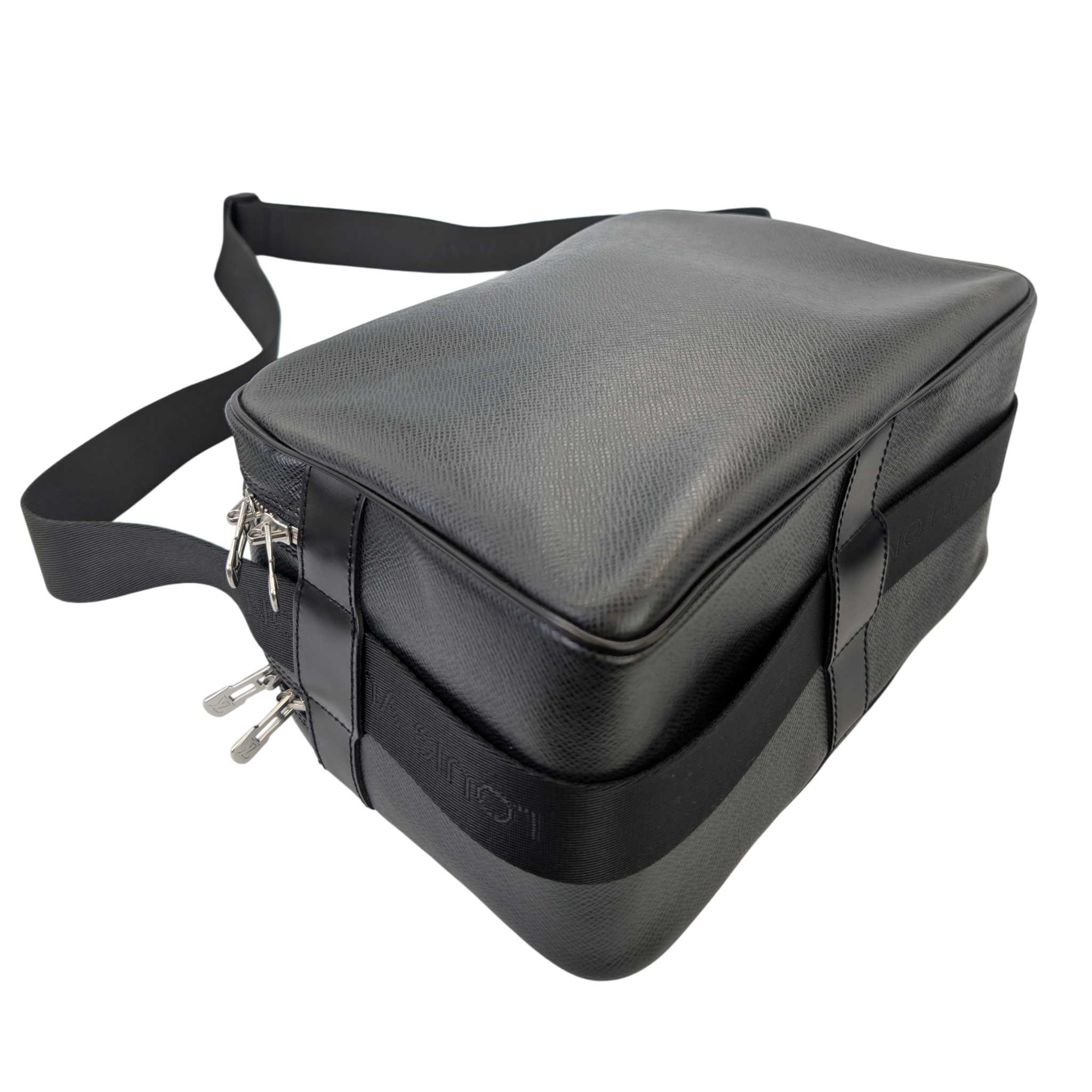 This Louis Vuitton Reporter PM Bag is made of black Taiga leather. This durable calf leather has a fine, natural-looking structure, which is achieved by embossing the leather. There is a large, open outside compartment on the front. Two different compartments can be opened using the two double zippers on the top edge. On the inside it has Bag an open pocket. The Bag has a comfortable, adjustable canvas shoulder strap. The model was inspired by photographers' bags.
