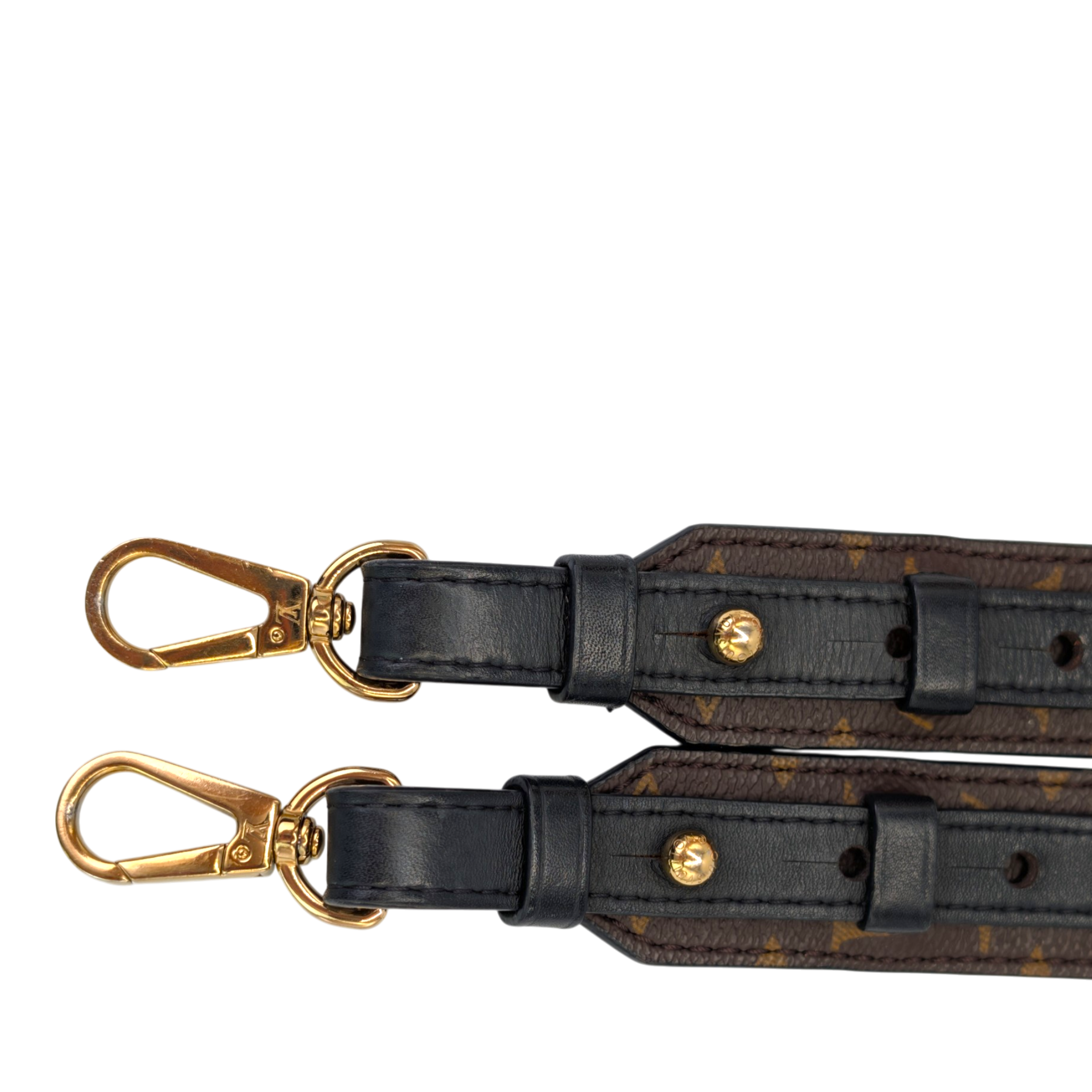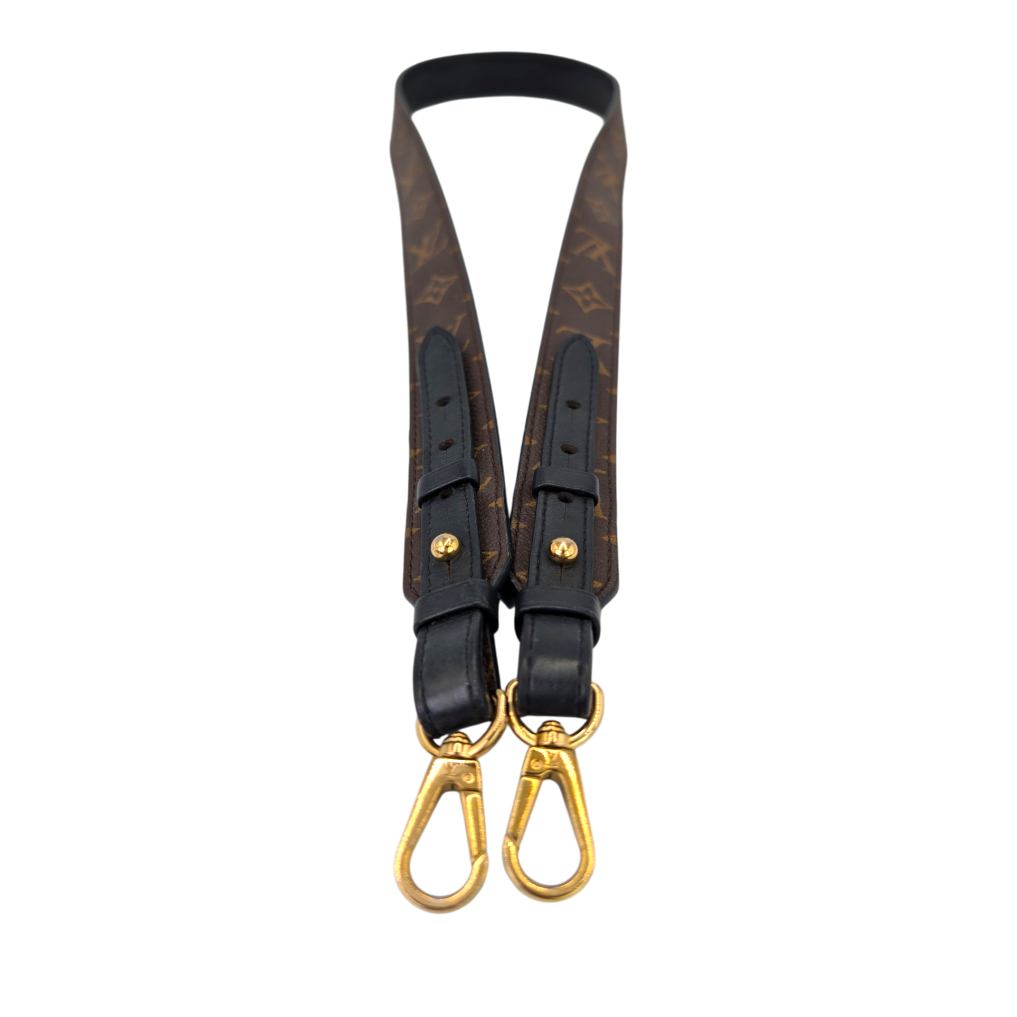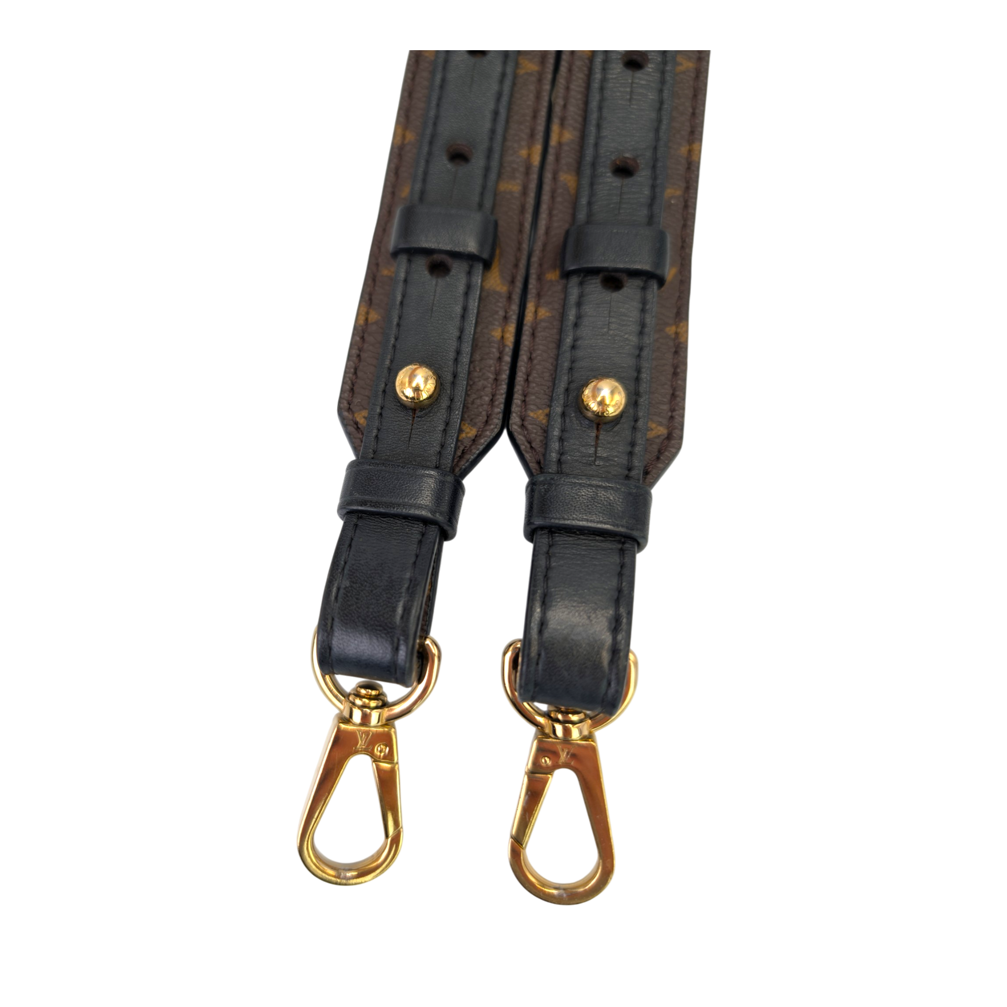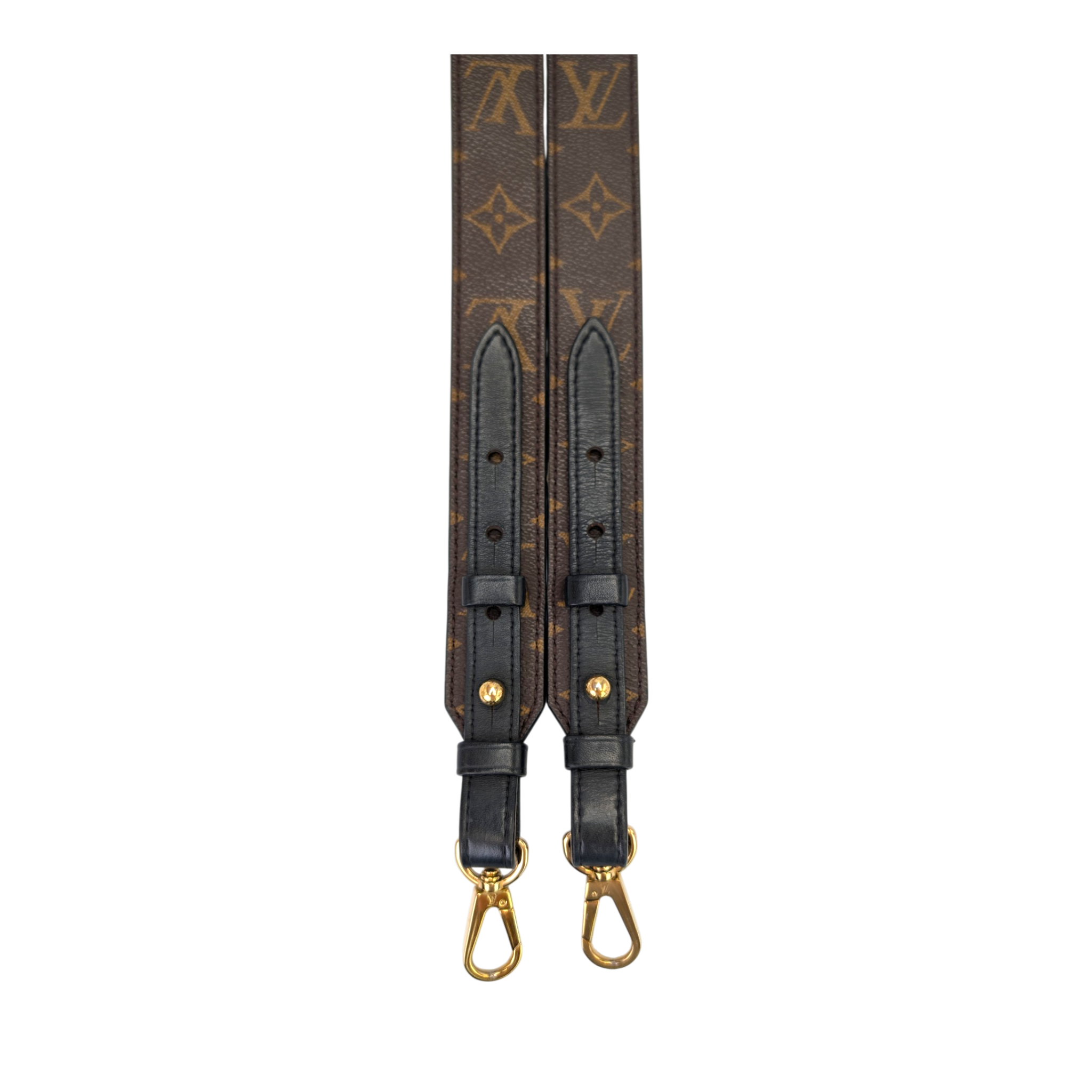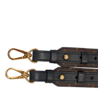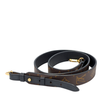 This Louis Vuitton shoulder strap in Monogram canvas is a practical accessory for carrying compatible Louis Vuitton bags comfortably as a shoulder or crossbody bag. The iconic Monogram canvas is combined with black leather and complemented by gold-colored snap hooks that allow easy attachment to many models.