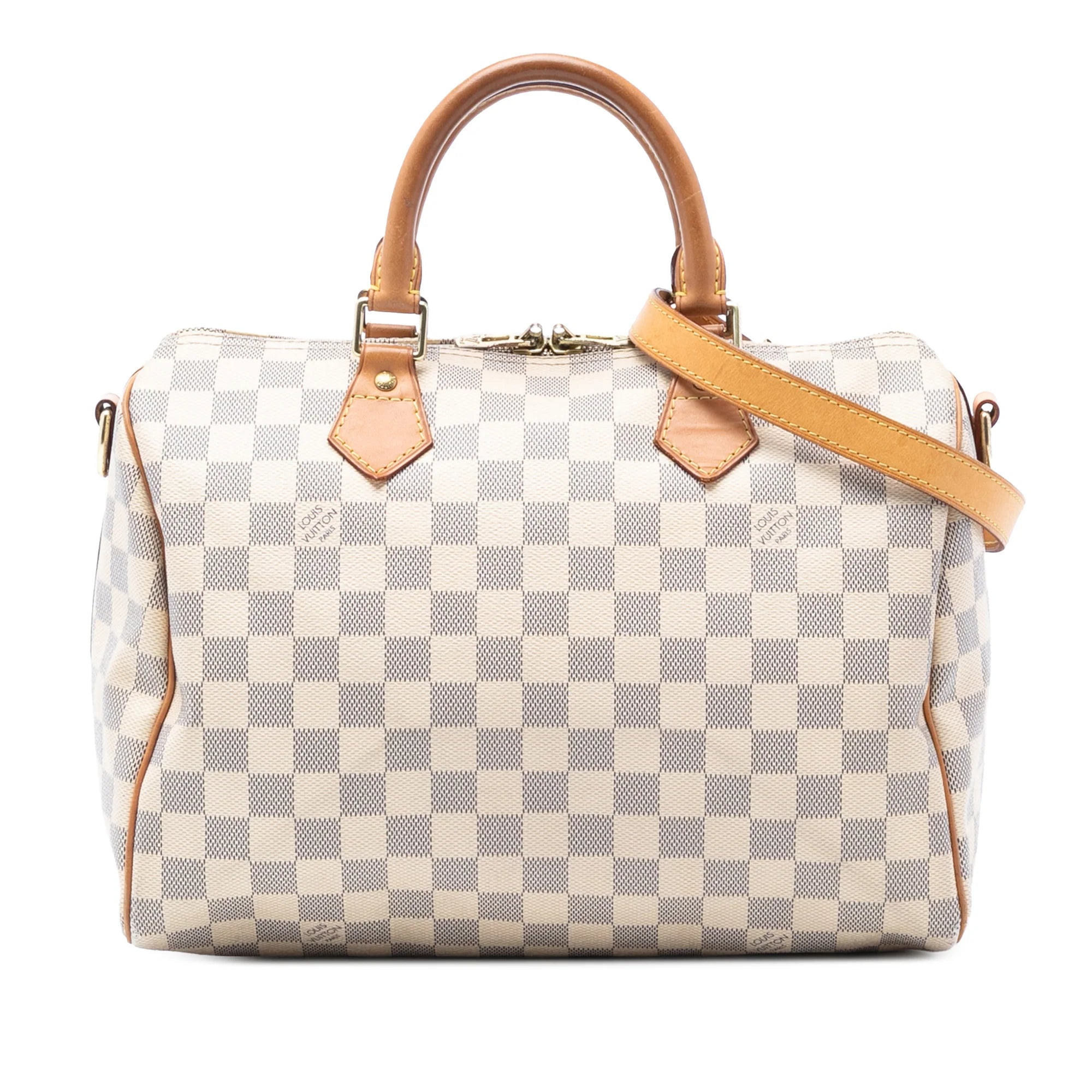 This Louis Vuitton Speedy 30 Bandoulière is made from white Damier Azur canvas. Inspired by the famous Louis Vuitton Keep All travel bag, it features a double zipper along the top. Inside it has this Bag Pockets and a zippered compartment. The Bag can be carried in the hand, in the arm or over the shoulder with the help of a removable leather strap. A beautiful classic and one of Louis Vuitton's most popular models.