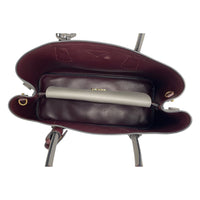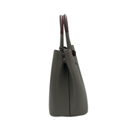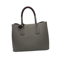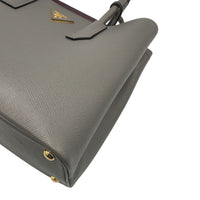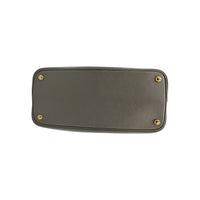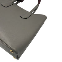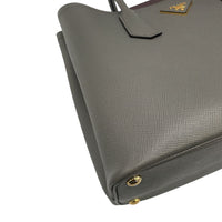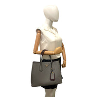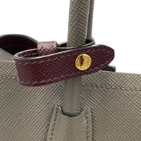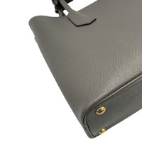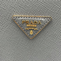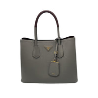 This fresh Prada Double is made from gray Saffiano leather. A gold Prada logo shines on the front. The Bag pleases with its classic shape and its sophisticated, two-part interior structure. The Bag has rolled leather handles and is classically carried in the hand.