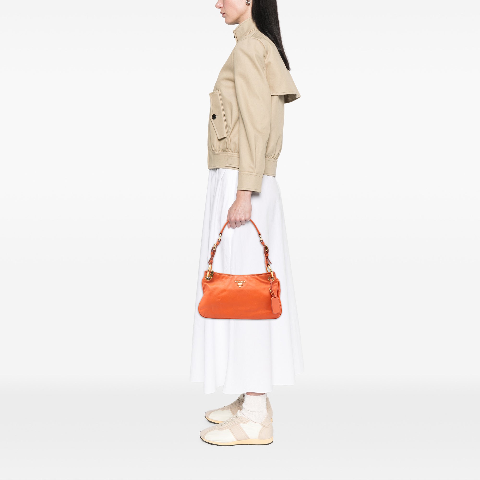 The Prada Vitello Phenix Shoulder Bag stands for clear, modern lines and the typical Prada understatement luxury. Made from Vitello Phenix leather, it is characterized by a fine grain and a structured feel that lends the model an elegant presence. The silhouette remains deliberately minimalist, accentuated by subtle metal hardware and the iconic logo, making the Bag a perfect match for both business looks and urban outfits.