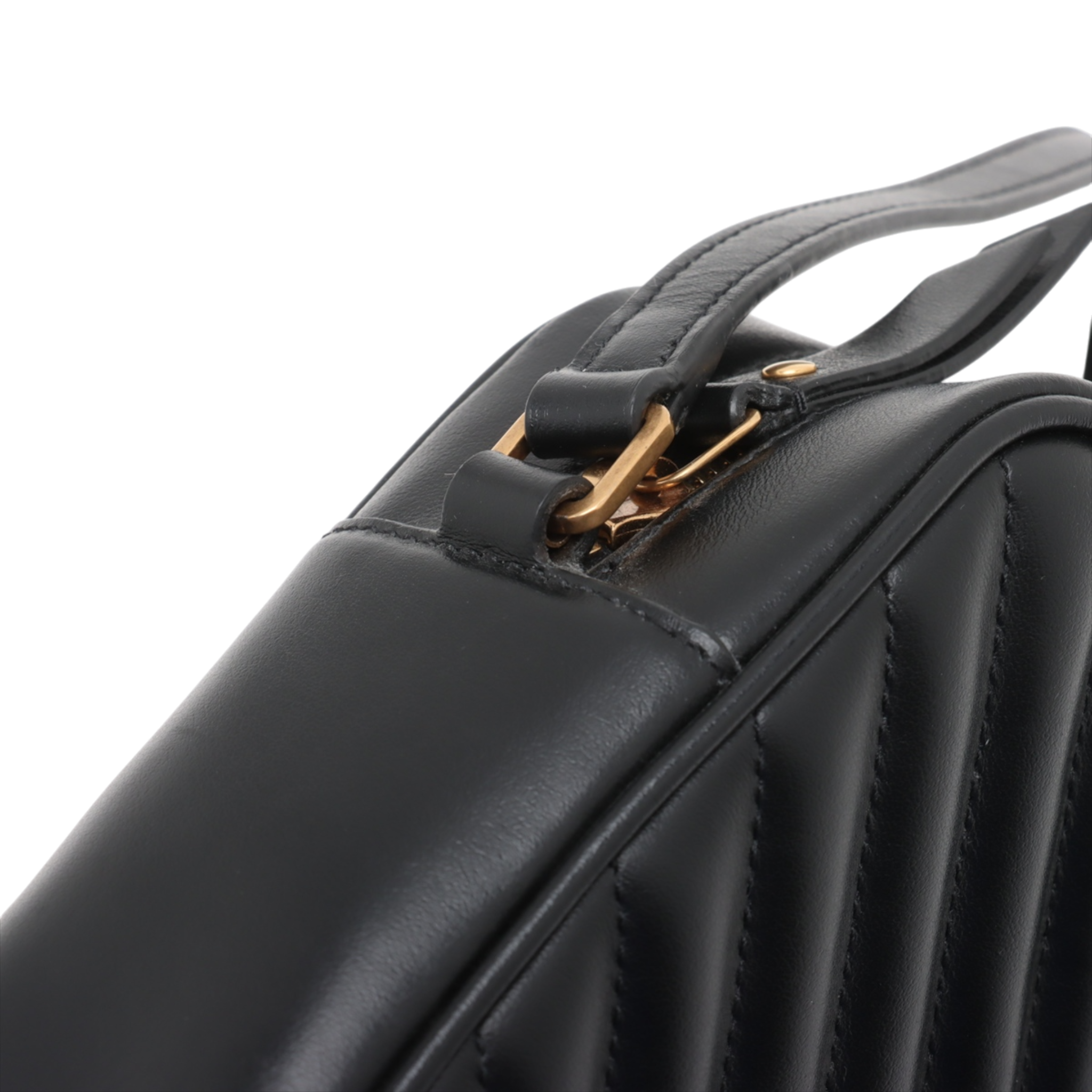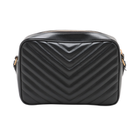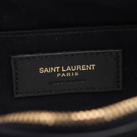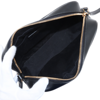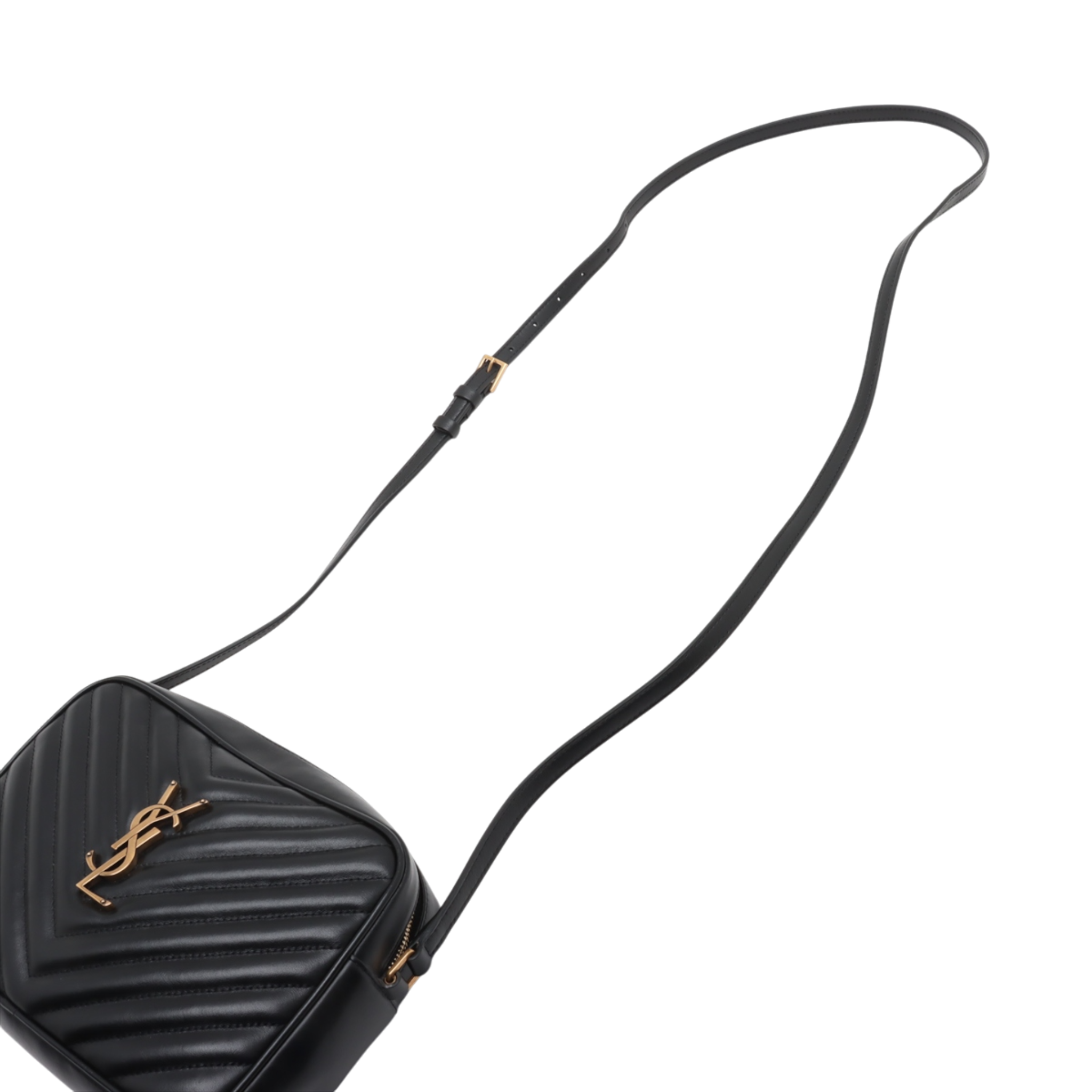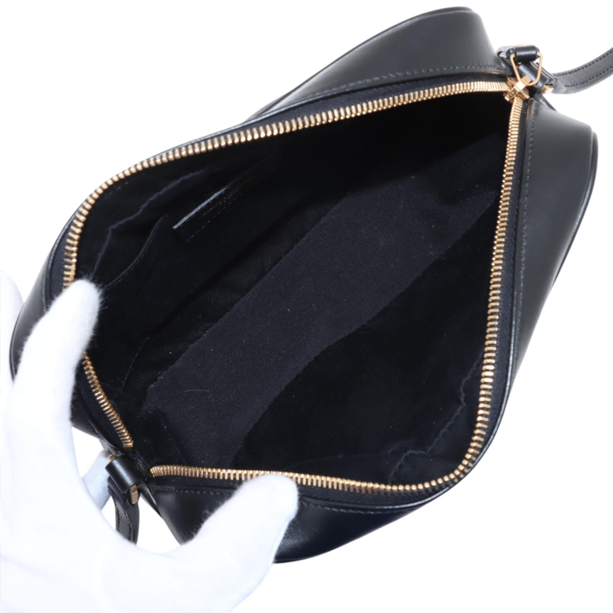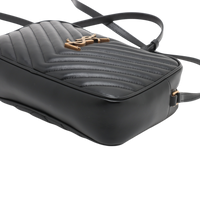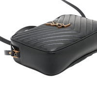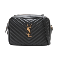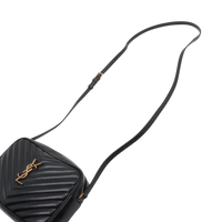The Lou Camera Bag from Saint Laurent is made of black raffia with black, smooth calfskin trim. It features a flat shoulder strap, a leather tassel and a zip fastening at the top. The Bag can be worn comfortably crossbody.