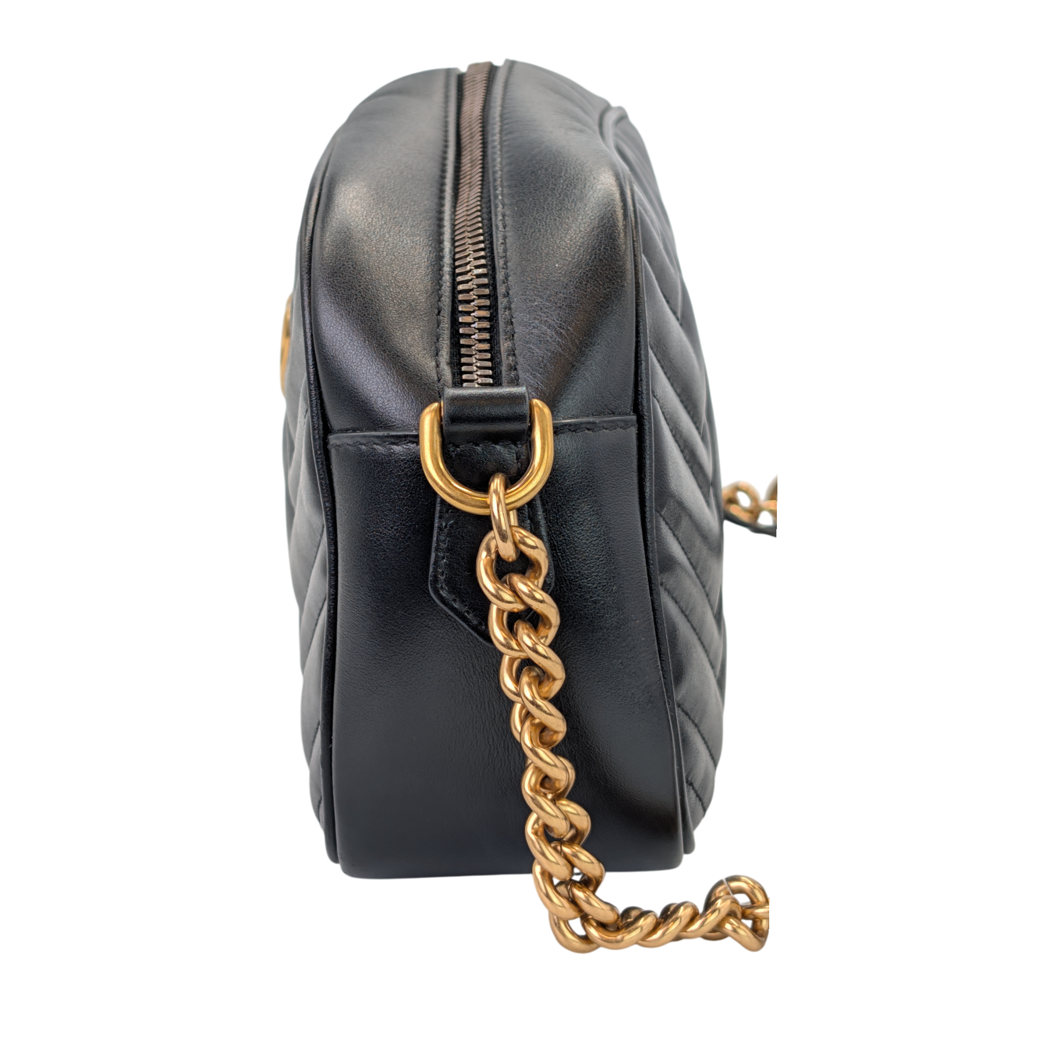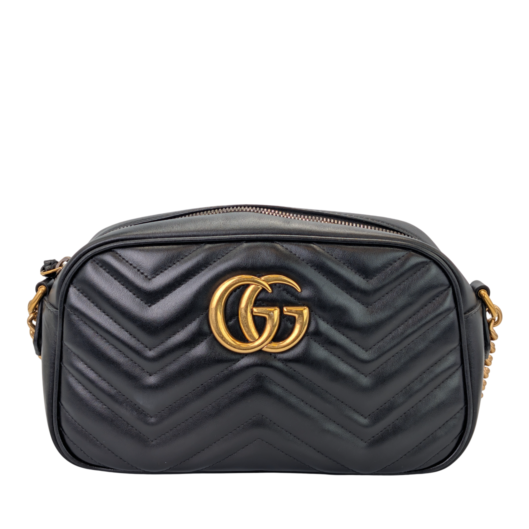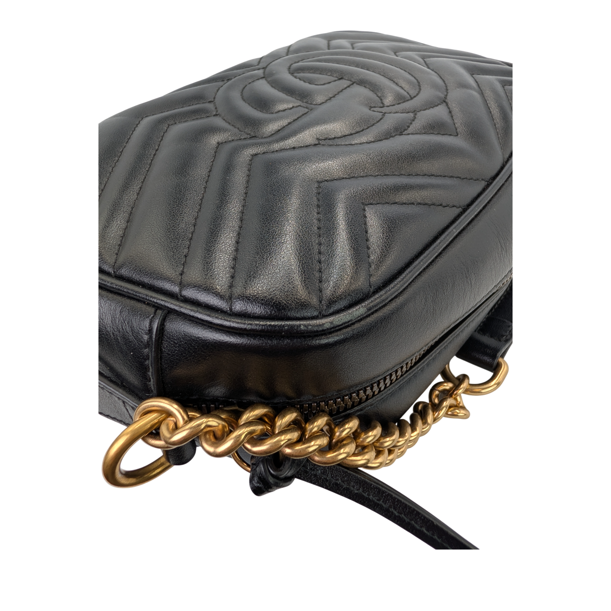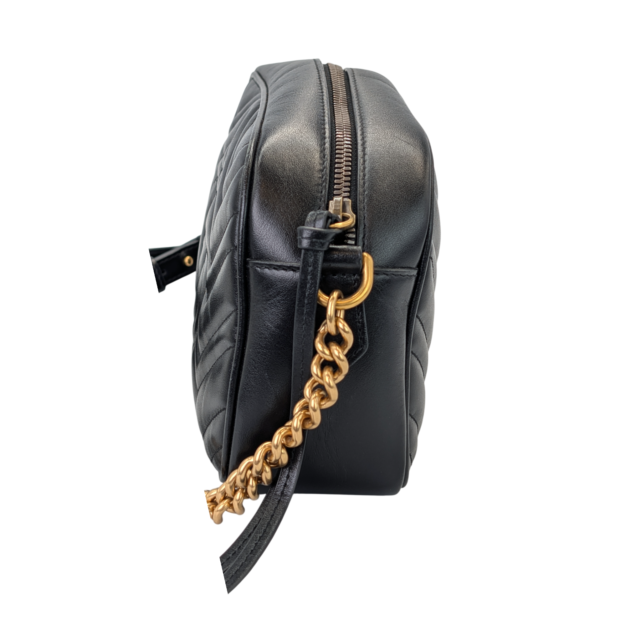 This crossbodyBag Features a quilted leather body, a leather and chain shoulder strap, a top zip closure, and an interior slip pocket.