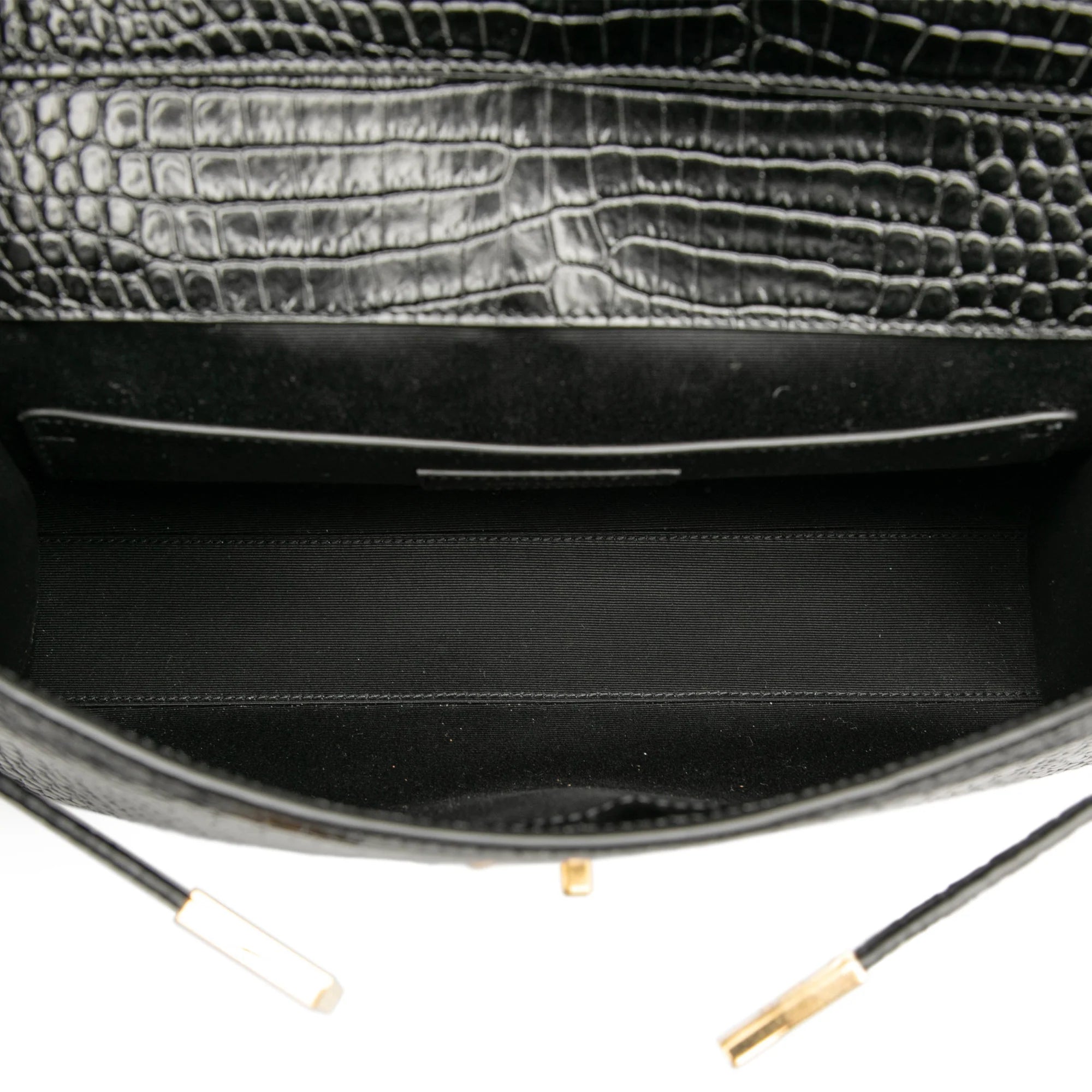 The Yves Saint Laurent Manhattan Shoulder Bag in size medium made of black, shiny, croc-embossed leather is an expressive statement piece with timeless elegance. The clear, architectural form gives the Bag a modern look and underlines the iconic style of the house of Saint Laurent.